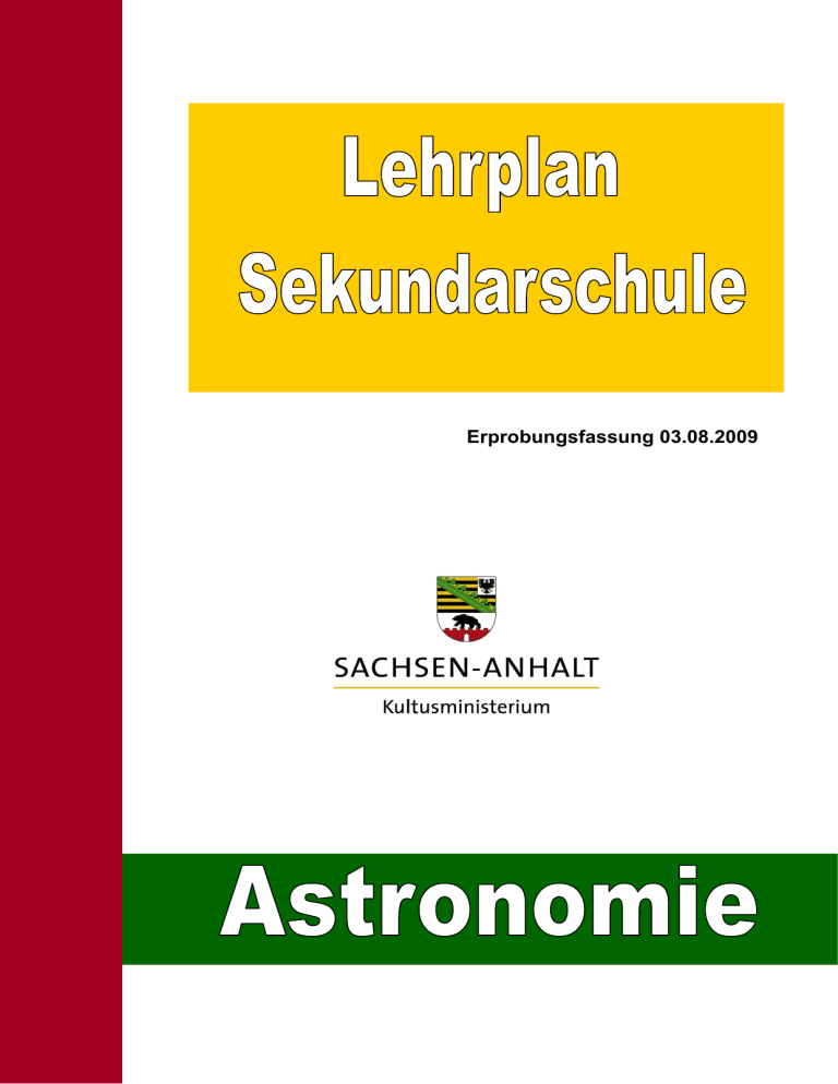 Erprobungsfassung 03.08.2009 Fachlehrplan Astronomie, Sekundarschule Erprobungsfassung: 03.08.2009 An der Erarbeitung des Fachlehrplans haben mitgewirkt: Dr. Grätz, Helmut Halle (fachwissenschaftliche Beratung) Illig, Ines Burg Junge, Gunnar Halle (Leitung der Fachgruppe) Richter, Anke Sangerhausen Schreiber, Volker Halle Fachlehrplan Astronomie, Sekundarschule Erprobungsfassung: 03.08.2009 Inhaltsverzeichnis Seite 1 Bildung und Erziehung im Fach Astronomie an der Sekundarschule .............................4 2 Entwicklung fachbezogener Kompetenzen .....................................................................6 2.1 Kompetenzbereiche im Fach Astronomie........................................................................6 2.2 Wissensbestände im Fach Astronomie .........................................................................11 3 Kompetenzentwicklung im Schuljahrgang 10................................................................12 3.1 Übersicht über die Kompetenzschwerpunkte ................................................................12 3.2 Kompetenzschwerpunkte ..............................................................................................13 3 Fachlehrplan Astronomie, Sekundarschule 1 Erprobungsfassung: 03.08.2009 Bildung und Erziehung im Fach Astronomie an der Sekundarschule Das Fach Astronomie hat als Bestandteil der Fächergruppe Natur eine ergänzende und synthetisierende Funktion. Dadurch ermöglicht der Astronomieunterricht den Schülerinnen und Schülern am Ende der Sekundarschullaufbahn eine fächerübergreifende und ganzheitliche Sichtweise. Er bietet eine Plattform zur Anwendung von Kompetenzen, die in anderen Fächern und Jahrgängen erworben wurden und zu denen über Inhalte und Arbeitsmethoden vielseitige wechselseitige Beziehungen bestehen. Beitrag zur Bildung und Erziehung Die Schülerinnen und Schüler erkennen bei der Suche nach ihrem Platz in der gegenwärtigen und zukünftigen Welt, dass Phänomene ihrer unmittelbaren Lebenswelt auch astronomischen Ursprungs sind. Der Astronomieunterricht verdeutlicht die Abhängigkeit des Lebens insbesondere von der Sonne (Stabilität, Wärme und Licht) und die Beeinflussung des Lebensrhythmus durch die Bewegung der Himmelskörper. Indem die Schülerinnen und Schüler dies bewusst wahrnehmen, mit naturwissenschaftlichen Gesetzen erklären sowie Veränderungen erkennen und verstehen, erhalten sie einen Überblick über den Aufbau, das Werden und die mögliche Zukunft des Weltalls. Dabei erkennen sie die räumliche und zeitliche Stellung des Menschen im All. Genauso zeigt der Astronomieunterricht Grenzen der Einwirkung der Himmelskörper auf menschliches Verhalten und fördert eine wissenschaftliche Betrachtungsweise, die im Gegensatz steht zur Astrologie. Teilhabe am gesellschaftlichen Leben Der Astronomieunterricht leistet einen spezifischen Beitrag zur Aneignung sozialer Verhaltensweisen, Handlungsnormen und persönlicher Wertvorstellungen. Die Schülerinnen und Schüler erkennen, dass der derzeitige Kenntnisstand vom Aufbau des Universums das Ergebnis eines langen Erkenntnisprozesses ist, in dem unterschiedlichste Auffassungen aufeinanderprallten, wo oft Fantasie und Neugier die Triebfeder der Entwicklung waren und Widerstände überwunden werden mussten. Sie lernen, sich mit andersartigen Meinungen auseinanderzusetzen, solche zu akzeptieren und einen Konsens zu finden. 4 Fachlehrplan Astronomie, Sekundarschule Erprobungsfassung: 03.08.2009 Der Besuch außerschulischer Lernorte (z. B. Planetarium, Sternwarte und Museum) ermöglicht einen anschaulichen Zugang zu astronomischen Erkenntnissen. Den Schülerinnen und Schülern wird bewusst, dass Astronomie und Alltagsbewältigung und globales Raumfahrt das persönliche und gesellschaftliche Leben durchdringen und Lernen deren Erkenntnisse notwendig sind, um zur Lösung gegenwärtiger und zukünftiger Probleme der Menschheit beizutragen. Das betrifft weltraumgestützte Navigations- und Kommunikationssysteme genauso wie andere Technologien als Nebenprodukt der Raumfahrt. Es gilt dabei Offenheit für Neues zu entwickeln, aber auch Irrwege aufzuzeigen. Der Astronomieunterricht leistet einen Beitrag dazu, dass die Schülerinnen und Schüler zu verantwortungsvollem Handeln im Hinblick auf den Schutz der natürlichen Lebensgrundlagen auf der Erde gelangen. Sie erfahren die Einzigartigkeit und die Verletzbarkeit des Heimatplaneten, nehmen in Diskussionen an der Klimadebatte teil und erkennen die Bedeutung einer nachhaltigen Lebensweise. Im Astronomieunterricht vertiefen die Schülerinnen und Schüler in Berufsvorbereitung und fachtypischen Arbeitsformen wichtige Verhaltenseigenschaften, die Ausbildungsreife Grundlage für eine Berufs- oder weitere Schulbildung sein können. So erzieht z. B. eine eigene längere Beobachtungsreihe nicht nur zur sorgfältigen Planung, zum genauen Protokollieren und zum gewissenhaften Auswerten, sondern in kooperativen Arbeitsformen auch zu Zuverlässigkeit und Verantwortungsbereitschaft. Moderne astronomische Forschung und der Umgang mit ihren Ergebnissen eröffnet den Schülerinnen und Schülern einen Einblick in technisch geprägte und moderne Berufsfelder und liefert damit einen Beitrag für die Berufsorientierung. 5 Fachlehrplan Astronomie, Sekundarschule Erprobungsfassung: 03.08.2009 2 Entwicklung fachbezogener Kompetenzen 2.1 Kompetenzbereiche im Fach Astronomie Naturwissenschaftliche Fächer Die Schülerinnen und Schüler entwickeln in der Sekundarstufe I naturwissenschaftliche Kompetenzen im Allgemeinen sowie astronomische, biologische, chemische und physikalische Kompetenzen im Besonderen. In den naturwissenschaftlichen Fächern werden die inhaltsbezogenen Kompetenzen im Bereich Fachwissen anwenden durch Basiskonzepte abgebildet. Die übergeordneten Basiskonzepte vernetzen Fachinhalte und begünstigen kumulatives, kontextbezogenes Lernen. Handlungsbezogene Kompetenzen umfassen den Bereich Erkenntnisse gewinnen, in