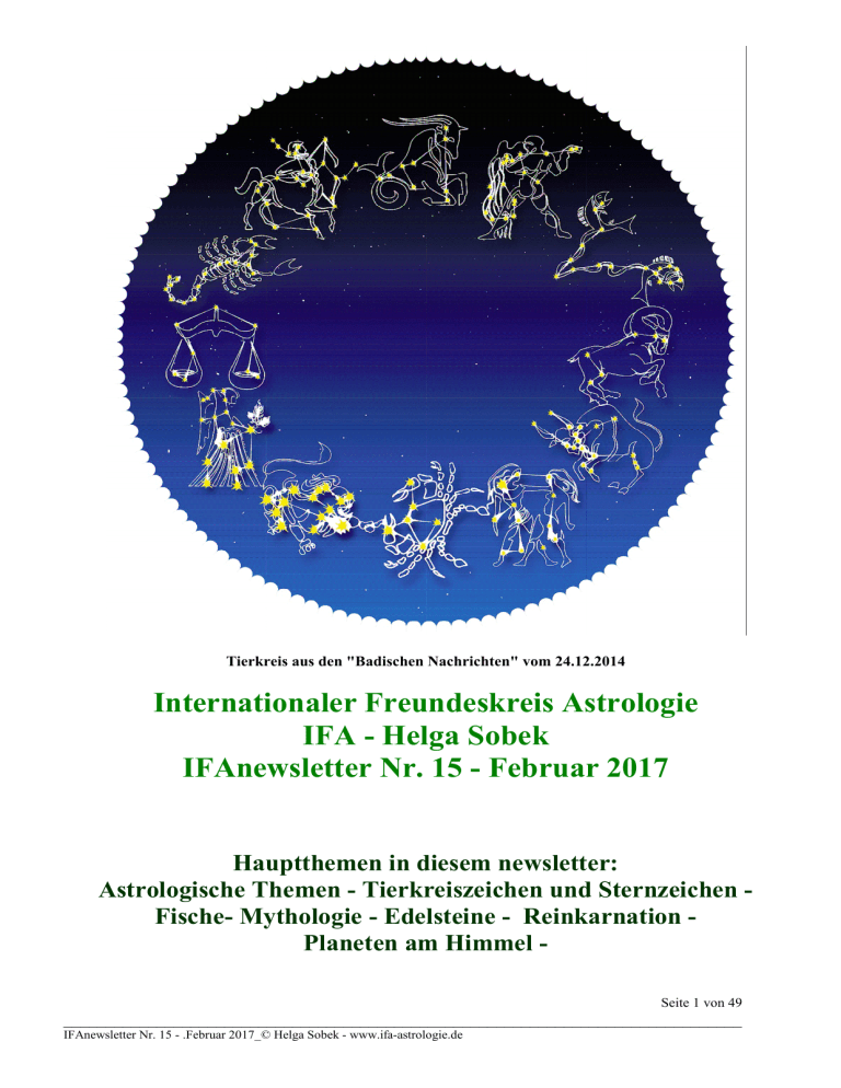 Tierkreis aus den "Badischen Nachrichten" vom 24.12.2014 Internationaler Freundeskreis Astrologie IFA - Helga Sobek IFAnewsletter Nr. 15 - Februar 2017 Hauptthemen in diesem newsletter: Astrologische Themen - Tierkreiszeichen und Sternzeichen Fische- Mythologie - Edelsteine - Reinkarnation Planeten am Himmel Seite 1 von 49 ________________________________________________________________________________ IFAnewsletter Nr. 15 - .Februar 2017_© Helga Sobek - www.ifa-astrologie.de seit 2007 »Wir brauchen nicht zu lernen, wie wir Dinge loslassen können; wir müssen einfach nur lernen, es zu erkennen, wenn sie schon fort sind.« Suzuki Roshi Seite 2 von 49 ________________________________________________________________________________ IFAnewsletter Nr. 15 - .Februar 2017_© Helga Sobek - www.ifa-astrologie.de Der Sternenhimmel im Februar 2017 Venus als Abendstern Venus erfreut uns auch im Februar noch als Abendstern. Wenn es abends dunkel wird, ist sie die erste, die in der Dämmerung am Himmel sichtbar wird. Der Blick in Richtung Südwest bleibt förmlich an ihr hängen. Am 17. Februar erreicht sie ihre maximale Höhe über dem Horizont und ihre maximale Helligkeit von -4,9mag! Schöner und länger als an diesem Tag wird sie dann lange nicht mehr strahlen. Venus bewegt sich durch das Sternbild Fische. Dabei wandert sie auf den Planeten Merkur zu, der sich im gleichen Sternbild befindet, kehrt aber ab 20. in dieser Bewegung um und läuft dann auf die Sonne zu. Am 28. kommt auch die schmale Mondsichel noch hinzu, wie im Bild zu sehen ist, und wandert unterhalb von Venus hindurch - ein wunderbares Fotomotiv! Venus ist ein Nachbarplanet unserer Erde und hat von allen Planeten den geringsten Abstand zu uns. Sie kommt bis auf 38 Mio km Abstand an die Erde heran. Darum ist sie auch der hellste Planet am Himmel. Venus ist ein sehr auffälliges Objekt, da sie kräftig leuchtet. Sie ist nach Sonne und Mond das hellste Gestirn am Himmel, heller noch als alle Sterne. Venus ist wie die Erde ein Gesteinsplanet. Einen Vergleich mit den anderen Gesteinsplaneten und vor allem mit der Erde gibt es unter 'Gesteinsplaneten'. Da Venus ein innerer Planet ist, der zweite nach Merkur, bewegt sie sich von uns aus gesehen immer in Nähe der Sonne. Steht sie nach Sonnenuntergang am Westhorzont, ist sie der strahlend helle Abendstern. Geht sie morgens vor der Sonne am Osthorizont auf, wird sie volkstümlich als Morgenstern bezeichnet. Venus fiel den Menschen schon vor langer Zeit am Himmel auf. Aufgrund ihrer strahlenden Schönheit bekam sie beispielsweise von den Griechen den Namen der Liebesgöttin Aphrodite. Bei den Babyloniern Seite 3 von 49 ________________________________________________________________________________ IFAnewsletter Nr. 15 - .Februar 2017_© Helga Sobek - www.ifa-astrologie.de hieß sie Ishtar, die Ägypter gaben ihr den Namen ihrer Göttin Isis, und bei den alten Germanen nannte man sie Freya - heute noch enthalten im Namen des Wochentags Freitag. © astrokramkiste.de planeten_Collage der Planeten des Sonnensystems vor dem Sternenhimmel Bild colourbox.com, NASA Fische Pisces Ἰχθύες 330°–360° 19. Februar – 20. März dalizodiac_pisces Seite 4 von 49 ________________________________________________________________________________ IFAnewsletter Nr. 15 - .Februar 2017_© Helga Sobek - www.ifa-astrologie.de aus Alter Sternenhimmel middleton celestial wi30_Fische_Widder1-002_KK Die Sternzeichen-Eigenschaften der Fische: Ihr Element: Wasser, der Urstoff allen Lebens. Es ist zugleich das Symbol des Gefühlshaften, das über der Verstandeskraft steht. Ihr Herrscherplanet: Neptun, der Gott der Meere. Ihre Polung: Minus (oder auch Weiblich oder Yin). Das macht Sie zu einem eher in sich gekehrten Menschen. Ihre Stärken: Sie sind geheimnisvoll, mitfühlend, intuitiv, sensibel und verständnisvoll. Die idealen Reiseziele für Sie: Fische-Geborene fühlen sich in den Städten Worms, Basel und Rio de Janeiro wohl. Sie lieben Länder wie Iran, Ceylon und Brasilien. Am liebesten reisen Sie an die Küste oder auf eine Insel. Ihre persönlichen Glücksbringer : Meerblau, Tollkirsche, Delfin, Kalmus-Duft, Amethyst. Fische im Beruf: Fische-Geborene benötigen in aller Regel viel Zeit, bis sie den Beruf gefunden haben, der ihnen entspricht, den sie mögen und in dem sie dann auch etwas leisten. Bis sie auf ihn stoßen, ergreifen sie häufig Übergangslösungen und arbeiten als Taxifahrer, Aushilfskellner, Statist im Theater, beim Film und Fernsehen. Es bringt überhaupt nichts, wenn Eltern auf ihre Fische-Kinder Druck ausüben oder verzweifeln, weil sie mit zwanzig oder vielleicht sogar mit dreißig Jahren immer noch keinen "richtigen" Beruf ausüben. Ein Fisch muss seinen Weg gehen. Ganz im Sinne seiner Sternzeichen-Eigenschaften muss er mit dem Strom schwimmen, der ihn trägt. Fische haben manchmal erst mit vierzig und mehr Jahren ihren Beruf gefunden. Es ist auch eine der typischen Sternzeichen-Eigenschaften vom Fisch, dass sie etwas anfangen und nicht zu Ende führen. Ja, es gehört richtiggehend zum Fische-Naturell. Fische ist ein Wasserzeichen genau wie Krebs und Skorpion. Das Element Wasser symbolisiert in der Astrologie die Fähigkeit, mitzuschwingen, Gefühle und Stimmungen aufzunehmen und von ihnen berührt zu werden. So ergreifen Fische häufig Berufe, bei denen sie ihr Mitgefühl für andere leben können: Sie wachen an Krankenbetten, betreuen Insassen in Gefängnissen, helfen Drogenabhängigen oder schulen geistig Behinderte. Dazu kommt ihr Seite 5 von 49 ________________________________________________________________________________ IFAnewsletter Nr. 15 - .Februar 2017_© Helga Sobek - www.ifa-astrologie.de berühmter sechster Sinn, der zu den typischen Sternzeichen-Eigenschaften der Fische gehört. Nicht wenige Fische machen daraus ihren Beruf und werden Medium, Wahrsager oder Ähnliches. Aus einer ebenso geheimnisvollen Quelle schöpfen Fische-Menschen die Gabe, Krankheiten und ihre Urs