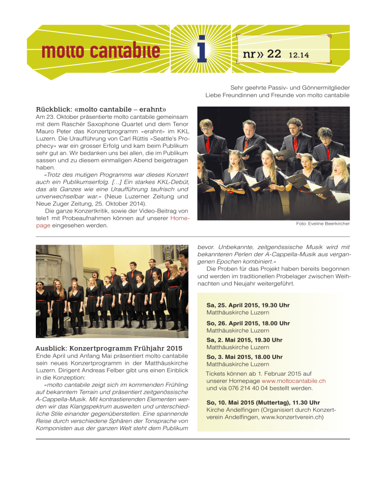 22 12.14 Sehr geehrte Passiv- und Gönnermitglieder Liebe Freundinnen und Freunde von molto cantabile Rückblick: «molto cantabile – erahnt» Am 23. Oktober präsentierte molto cantabile gemeinsam mit dem Raschèr Saxophone Quartet und dem Tenor Mauro Peter das Konzertprogramm «erahnt» im KKL Luzern. Die Uraufführung von Carl Rüttis «Seattle’s Prophecy» war ein grosser Erfolg und kam beim Publikum sehr gut an. Wir bedanken uns bei allen, die im Publikum sassen und zu diesem einmaligen Abend beigetragen haben. «Trotz des mutigen Programms war dieses Konzert auch ein Publikumserfolg. […] Ein starkes KKL-Debüt, das als Ganzes wie eine Uraufführung taufrisch und unverwechselbar war.» (Neue Luzerner Zeitung und Neue Zuger Zeitung, 25. Oktober 2014). Die ganze Konzertkritik, sowie der Video-Beitrag von tele1 mit Probeaufnahmen können auf unserer Homepage eingesehen werden. Foto: Eveline Beerkircher bevor. Unbekannte, zeitgenössische Musik wird mit bekannteren Perlen der A-Cappella-Musik aus vergangenen Epochen kombiniert.» Die Proben für das Projekt haben bereits begonnen und werden im traditionellen Probelager zwischen Weihnachten und Neujahr weitergeführt. Sa, 25. April 2015, 19.30 Uhr Matthäuskirche Luzern So, 26. April 2015, 18.00 Uhr Matthäuskirche Luzern Ausblick: Konzertprogramm Frühjahr 2015 Ende April und Anfang Mai präsentiert molto cantabile sein neues Konzertprogramm in der Matthäuskirche Luzern. Dirigent Andreas Felber gibt uns einen Einblick in die Konzeption: «molto cantabile zeigt sich im kommenden Frühling auf bekanntem Terrain und präsentiert zeitgenössische A-Cappella-Musik. Mit kontrastierenden Elementen werden wir das Klangspektrum ausweiten und unterschiedliche Stile einander gegenüberstellen. Eine spannende Reise durch verschiedene Sphären der Tonsprache von Komponisten aus der ganzen Welt steht dem Publikum Sa, 2. Mai 2015, 19.30 Uhr Matthäuskirche Luzern So, 3. Mai 2015, 18.00 Uhr Matthäuskirche Luzern Tickets können ab 1. Februar 2015 auf unserer Homepage www.moltocantabile.ch und via 076 214 40 04 bestellt werden. So, 10. Mai 2015 (Muttertag), 11.30 Uhr Kirche Andelfingen (Organisiert durch Konzertverein Andelfingen, www.konzertverein.ch) Madelaine Wibom Seit über eineinhalb Jahren ist die schwedische Sopranistin Madelaine Wibom Stimmbildnerin bei molto cantabile. Den Luzerner und Luzernerinnen dürfte sie von ihrer Zeit am Luzerner Theater bestens bekannt sein. Madelaine Wibom war von 1998 bis 2012 am im Ensemble Luzerner Theater engagiert und hat dort um die 50 Partien gesungen. Wir haben mit Madelaine Wibom gesprochen und ihr einige Fragen zu ihrer neuen Tätigkeit als Stimmbildnerin bei molto cantabile gestellt. molto cantabile: Was bedeutet die Arbeit als Stimmbildnerin bei molto cantabile für dich? Ich bin sehr stolz und fühle mich geehrt, mit so tollen und motivierten Sängerinnen Sängern arbeiten zu dürfen. Alle sind fortgeschritten mit Notenlesen, mit der Intonation und beherrschen die Stimme so, dass es eher ein Freimachen, ein Loslassen ist, was wir zusammen erarbeiten, um weiterzukommen. Es ist eine sehr schöne Arbeit für mich und ich freue mich wirklich bei den «moltos» dabei sein zu dürfen. Sie sind mir ans Herz gewachsen. Was ist die grösste Herausforderung? Die Sänger/innen haben ja fast alle schon viele Jahre gesungen. Die stimmtechnischen Probleme (die fast alle Sänger mehr oder weniger haben) sind dafür sehr gefestigt. Man sagt ja immer, dass es nicht leicht sei, alte Hunde sitzen zu lehren. Ich versuche mit viel Fantasie und Ideen die Problemzonen anzugehen, vorwärts zu kommen, ohne den Teppich unter den Füssen wegzuziehen. Wenn etwas umgestellt werden soll, müssen wir das wahrlich machen. Gleichzeitig muss auch der Chor gut klingen. Ich darf also niemanden zu stark verunsichern. Mit dem Ergebnis bin ich sehr, sehr zufrieden und es macht mir riesig Spass! Viele Jahre standest du als Sopranistin auf der Bühne des Luzerner Theaters. Was fasziniert dich am Unterrichten? Oh – das ist eine spannende Frage ... Jetzt kann ich meine eigenen Theorien an anderen Leuten ausprobieren bzw. anwenden. Dass ich dieses Glück hatte, so lange und intensiv auf der Bühne zu stehen, hat mir sehr viel Erfahrung gebracht. Nun bin ich glücklich, wenn ich Teile davon weitergeben kann. Diese Kombination immer noch selber zu singen und auch zu unterrichten, finde ich super. Es ist sehr abwechslungsreich und wird nie langweilig. Was geht dir jeweils durch den Kopf, wenn du bei unseren Konzerten im Publikum sitzt? Fieberst du mit oder kannst du auch zurücklehnen und geniessen? Ich fiebere total mit. In Ettiswil, als alle Chorsänger im Kirchengang reinmarschiert sind, war ich so gerührt, alle «meine Schüler» auf einmal zu sehen und nicht nur einzeln in der Gesangsstunde. Nach dem Konzert, als alle wieder rausgegangen sind, war ich so stolz, dass ich hätte platzen können. Es ist herrlich zu sehen, wie sich alle bemühen, das umzusetzen, was wir erarbeitet haben – richtig stehen, richtige Kopfposition, einen tiefen, natürlichen Atmen, Selbstvertrauen ausstrahlen etc. Ich habe aber so mitgefiebert und mitgeatmet, dass mein Mann mir sagen musste: «Versuch jetzt einfach zu relaxen und geniess es – sie sind ja super!» Er hat recht: sie sind super! Ausblick: Kulturprojekt «Sehnsucht» der Albert Koechlin Stiftung Die Albert Koechlin Stiftung initiiert im Jahr 2016 bereits zum fünften Mal ein Kulturprojekt zu einem vorgegebenen Thema. Innerschweizer Kulturinstitutionen und Kulturschaffende erarbeiten Produktionen und präsentieren sie im Laufe zweier Monate der Öffentlichkeit. Auch molto cantabile hat sich mit einer Projektidee zum übergreifenden Thema «Sehnsucht» bei der Albert Koechlin Stiftung beworben. Wir freuen uns sehr, dass unser Projekt von der Fachjury ausgewählt worden ist und dass wir Ende April / Anfang Mai 2016 zusammen mit 23 weiteren Künstlerinnen und Künstlern aus der Zentralschweiz Teil