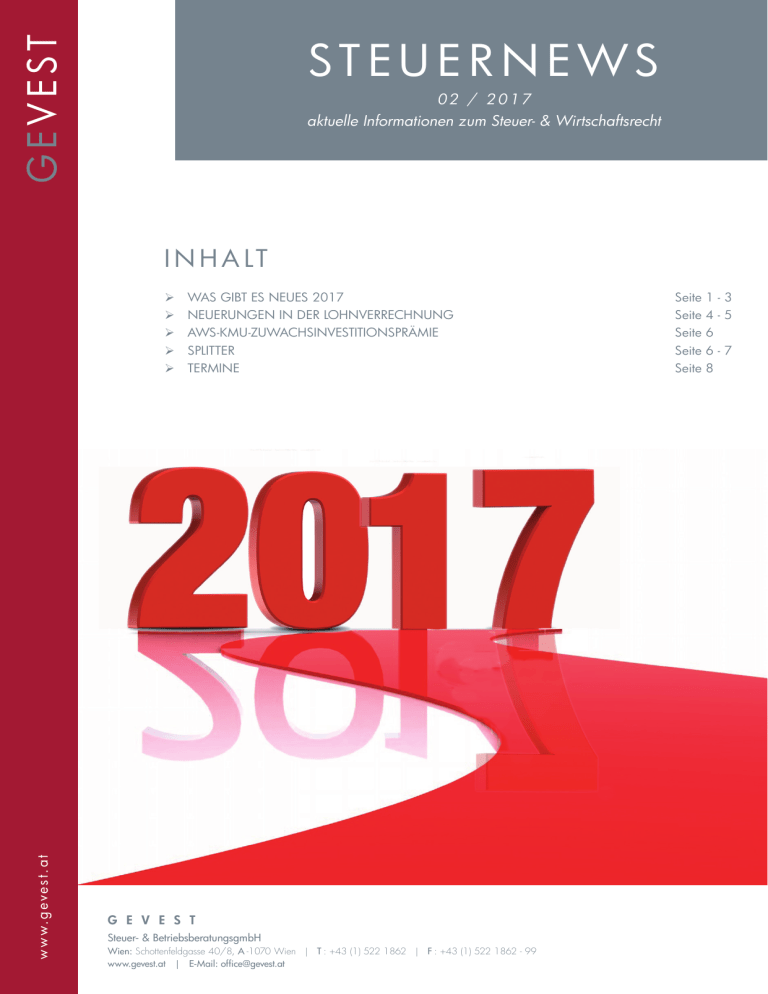 G EV EST ST EU E R N EWS 02 / 2 0 1 7 aktuelle Informationen zum Steuer- & Wirtschaftsrecht I N H A LT w w w. g e v e s t . a t Ø Ø Ø Ø Ø WAS GIBT ES NEUES 2017Seite NEUERUNGEN IN DER LOHNVERRECHNUNG Seite AWS-KMU-ZUWACHSINVESTITIONSPRÄMIE Seite SPLITTER Seite TERMINESeite G E V E S T Steuer- & BetriebsberatungsgmbH Wien: Schottenfeldgasse 40/8, A -1070 Wien | T : +43 (1) 522 1862 | F : +43 (1) 522 1862 - 99 www.gevest.at | E-Mail: office@gevest.at 1-3 4-5 6 6-7 8 Was gibt es Neues 2017 Was gibt es Neues 2017 Abzug von bestimmten Sonderausgaben nur mehr auf Basis elektronischer Daten Neuregelung für Stipendien Ab 1.1.2017 dürfen Beiträge für eine freiwillige Weiterversicherung und einen Nachkauf von Versicherungszeiten, Kirchenbeiträge sowie Spenden an begünstigte Organisationen nur mehr dann im Rahmen der Einkommensteuerveranlagung abgesetzt werden, wenn die jeweiligen Organisationen den Empfang des Geldbetrags mittels elektronischer Datenübermittlung den zuständigen Abgabenbehörden bestätigt haben. Die Anforderungen an diese Datenübermittlung wurden jüngst in der Sonderausgaben-Datenübermittlungsverordnung des BMF konkretisiert. Damit die jeweilige Organisation in der Lage ist, die Daten richtig zu übermitteln, muss ihr vom Spender oder Beitragszahler rechtzeitig Vor- und Zuname sowie Geburtsdatum bekannt gegeben werden. Zu beachten ist dabei, dass betriebliche und private Spenden strikt zu trennen sind. Denn Spenden aus dem Betriebsvermögen können weiterhin ohne elektronische Datenübermittlung abgesetzt werden. Damit es zu keiner verbotenen Doppelabsetzung von Spenden kommt, müssen die Spendenorganisationen ab dem Jahr 2017 genau unterscheiden, ob eine Spende aus einem Betriebsvermögen oder aus dem Privatvermögen eines Spenders stammt. Daher müssen auch die Spendenorganisationen an der korrekten Erfassung ihrer Spender arbeiten. Übrigens dürfen Spendenorganisationen ab 2017 nur mehr dann in die Liste der begünstigten Spendenempfänger beim Finanzamt Wien 1/23 aufgenommen werden, wenn glaubhaft gemacht wurde, dass die Maßnahmen zur Erfüllung der Datenübermittlungsverpflichtung getroffen wurden. Da ab 2017 bei der Veranlagung nur mehr die elektronisch übermittelten Daten berücksichtigt werden können, dürfen im Rahmen der Gehaltsaufrollung im laufenden Kalenderjahr auch keine Kirchenbeiträge mehr berücksichtigt werden. Zuwendungen an ausländische Organisationen können wie bisher in der Steuererklärung berücksichtigt werden. Die Bezahlung von Topf-Sonderausgaben, Renten oder Steuerberatungskosten unterliegt auch nicht dem neuen Datenübermittlungsregime. Ab 2017 wird die unterschiedliche ertragsteuerliche Behandlung von Stipendien nach der Rechtsprechung des VwGH saniert. Bislang judizierte der VwGH, dass Stipendien nur dann einen Einkommensersatz darstellen und damit steuerpflichtig sind, wenn sie während eines aufrechten (karenzierten) Dienstverhältnisses gewährt werden. Mit dem Abgabenänderungsgesetz 2016 (AbgÄG) wurden nunmehr Stipendien ausdrücklich als Teil der selbständigen Einkünfte erfasst. Sie sind allerdings nur dann steuerpflichtig, wenn sie wirtschaftlich einen Einkommensersatz darstellen, wobei Stipendien in der Höhe der Höchststudienbeihilfe für Selbsterhalter nach § 27 StudienförderungsG ausdrücklich nicht als Einkommensersatz gelten. Digitale Signatur bei Registrierkassen Aufgrund der im Konkursverfahren des Fußballklubs GAK ergangenen Entscheidung des VwGH, wonach im Zweifel von einer Bruttolohnvereinbarung bei der Auszahlung von Schwarzlöhnen auszugehen ist, sah sich der Gesetzgeber genötigt, eine grundsätzliche Nettolohnarbeitsvermutung für Schwarzlohnzahlungen aufzunehmen. Daher gilt seit dem 1.1.2017, dass dann ein Nettoarbeitslohn als vereinbart gilt, wenn der Arbeitgeber den gezahlten Arbeitslohn nicht im Lohnkonto erfasst und die Lohnsteuer nicht oder nicht vollständig einbehalten und abgeführt hat, obwohl er weiß oder wissen musste, dass dies zu Unrecht unterblieben ist. Dies gilt dann nicht, wenn der Arbeitgeber eine Bruttolohnvereinbarung nachweisen kann. Ausweitung der Kleinunternehmerbefreiung in der Umsatzsteuer Jede Registrierkasse muss ab dem 1.4.2017 durch eine technische Sicherheitseinrichtung gegen Manipulationen geschützt werden. Die Unveränderbarkeit der Aufzeichnungen muss dabei durch kryptographische Signatur bzw durch ein Siegel jedes Barumsatzes mittels einer dem Steuerpflichtigen zugeordneten Signatur bzw Siegelerstellungseinheit gewährleistet und die Nachprüfbarkeit durch Erfassung der Signatur bzw des Siegels auf jedem einzelnen Beleg sichergestellt werden. Die detaillierte Vorgangsweise zur Inbetriebnahme der jeweiligen Sicherheitseinrichtung und die damit verbundene Registrierung über FinanzOnline hat das BMF in einem übersichtlichen Folder veröffentlicht. Werden die geforderten Sicherheitsvorkehrungen vorsätzlich nicht installiert, liegt eine Finanzordnungswidrigkeit vor, die mit einer Geldstrafe bis zu € 5.000 bestraft wird. Außerdem begeht ein Abgabepflichtiger, welcher durch Einsatz eines Programms, mit dessen Hilfe Daten verändert, gelöscht oder unterdrückt werden können, seine Aufzeichnungen vorsätzlich verfälscht, eine Finanzordnungswidrigkeit, welche mit einer Geldstrafe bis zu € 25.000 geahndet wird. Die Verkürzung von Abgaben mithilfe von verfälschten Aufzeichnungen stellt wiederum ein vorsätzliches Finanzstrafdelikt, möglicherweise auch einen Abgabenbetrug dar. Erstmalige Übermittlung von Master und Local File sowie des länderbezogenen Berichts nach dem Verrechnungspreisdokumentationsgesetz Die in Österreich ansässigen obersten Muttergesellschaften multinational tätiger Unternehmen haben erstmals für Wirtschaftsjahre, die am oder nach dem 1.1.2016 beginnen, innerhalb von 12 Monaten nach dem Ende des Wirtschaftsjahrs (somit erstmals bis Ende 2017) einen länderbezogenen Bericht (Country-by-Country Report; CbCR) dem zuständigen Finanzamt zu