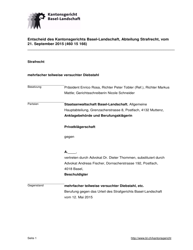 Entscheid des Kantonsgerichts Basel-Landschaft, Abteilung Strafrecht, vom 21. September 2015 (460 15 166) ____________________________________________________________________ Strafrecht mehrfacher teilweise versuchter Diebstahl Besetzung Präsident Enrico Rosa, Richter Peter Tobler (Ref.), Richter Markus Mattle; Gerichtsschreiberin Nicole Schneider Parteien Staatsanwaltschaft Basel-Landschaft, Allgemeine Hauptabteilung, Grenzacherstrasse 8, Postfach, 4132 Muttenz, Anklagebehörde und Berufungsklägerin Privatklägerschaft gegen A.____, vertreten durch Advokat Dr. Dieter Thommen, substituiert durch Advokat Andreas Fischer, Dornacherstrasse 192, Postfach, 4018 Basel, Beschuldigter Gegenstand mehrfacher teilweise versuchter Diebstahl, etc. Berufung gegen das Urteil des Strafgerichts Basel-Landschaft vom 12. Mai 2015 Seite 1 http://www.bl.ch/kantonsgericht A. Mit Urteil des Strafgerichts Basel-Landschaft vom 12. Mai 2015 wurde A.____ des mehr- fachen versuchten Diebstahls, der mehrfachen Sachbeschädigung sowie des mehrfachen Hausfriedensbruchs schuldig erklärt und zu einer bedingt vollziehbaren Freiheitsstrafe von 8 Monaten, bei einer Probezeit von 2 Jahren, verurteilt, dies unter Anrechnung der am 18. November 2014 sowie vom 6. Dezember 2014 bis 19. März 2015 in Polizeigewahrsam bzw. in Untersuchungs- und Sicherheitshaft verbrachten Zeit von insgesamt 105 Tagen (Ziffer 1 des Urteilsdispositivs). Vom Vorwurf des Diebstahls, der Sachbeschädigung sowie des Hausfriedensbruchs in Ziffer 2.1 der Anklageschrift sowie vom Vorwurf des gewerbsmässigen Diebstahls in Ziffer 3 der Anklageschrift wurde der Beschuldigte freigesprochen (Ziffer 2 des Urteilsdispositivs). Mit Bezug auf das beschlagnahmte Mobiltelefon beschloss das Strafgericht, dass dieses dem Beschuldigten zurückgegeben werde, sofern er es innert 30 Tagen ab Rechtskraft des vorliegenden Urteils abhole bzw. abholen lasse (Ziffer 3 des Urteilsdispositivs). A.____ wurde bei seiner Anerkennung behaftet, B.____ Fr. 500.-- zu schulden. Demzufolge sollte das Guthaben des Beschuldigten auf dem Gefängniskonto in Höhe von Fr. 210.80 mit seinem Einverständnis nach Rechtskraft des vorliegenden Urteils zwecks teilweiser Tilgung der Forderung an B.____ überwiesen werden. Die von C.____ adhäsionsweise geltend gemachte Forderung von Fr. 200.-- wurde hingegen auf den Zivilweg verwiesen (Ziffer 4.a und 4.b des Urteilsdispositivs). Die Kosten der amtlichen Verteidigung in Höhe von insgesamt Fr. 7‘194.35 (inkl. Auslagen und MwSt.) wurden aus der Gerichtskasse entrichtet und die Verfahrenskosten im Verhältnis 5/6 zu Lasten des Beschuldigten und 1/6 zu Lasten des Staates verteilt (Ziffer 5 und 6 des Urteilsdispositivs). B. Gegen dieses Urteil reichte die Staatsanwaltschaft mit Eingabe vom 13. Mai 2015 Beru- fung ein. Mit Berufungserklärung vom 15. Juli 2015 stellte die Staatsanwaltschaft folgende Anträge: „1. Der Beschuldigte sei gemäss Anklage wegen gewerbsmässigen, ev. mehrfachen, teilweise versuchten Diebstahls, mehrfacher Sachbeschädigung und mehrfachen Hausfriedensbruchs vollumfänglich schuldig zu sprechen und die Strafe sei angemessen zu erhöhen. 2. Der Staatsanwaltschaft sei aufgrund der anlässlich der Hauptverhandlung vom 12. Mai 2015 gewonnen neuen Erkenntnissen (vgl. Berufungsbegründung vom 13. Mai 2015) die Gelegenheit zu geben, im Rahmen des Berufungsverfahrens die Anklage mit einem Eventualsachverhalt zu erweitern resp. zu ergänzen. Hierzu sei eine angemessene Frist zu gewähren. Seite 2 http://www.bl.ch/kantonsgericht 3. Eventualiter sei das Verfahren an das Strafgericht zurückzuweisen, um der Staatsanwaltschaft die Gelegenheit zu geben, die Anklage zu erweitern resp. zu ergänzen. 4. Die Tonbandaufnahme des erstinstanzlichen Verfahrens sei zu den Akten zu nehmen.“ C. Mit Eingabe vom 4. August 2015 liess der Beschuldigte durch seinen Vertreter mitteilen, dass er auf eine Anschlussberufung verzichte und auch keinen Antrag auf Nichteintreten stelle. Ebenfalls mit Eingabe von 4. August 2015 reichte er auch gleich seine Stellungnahme zur Berufung der Staatsanwaltschaft ein. Er beantragte darin, die Berufung sei abzuweisen und das Urteil des Strafgerichts vom 12. Mai 2015 vollumfänglich zu bestätigen. Für das Berufungsverfahren sei ihm die amtliche Verteidigung zu bewilligen, alles unter o/e Kostenfolge. D. Die Staatsanwaltschaft nahm mit Schreiben vom 21. August 2015 Stellung zur Beru- fungsantwort des Beschuldigten vom 4. August 2015. Die Ausführungen im angefochtenen Urteil sowie in den erwähnten Eingaben werden - soweit erforderlich - in den nachfolgenden Erwägungen dargelegt. E. Mit Verfügung vom 5. August 2015 nahm der zuständige Präsident des Kantonsgerichts, Abteilung Strafrecht, zum Antrag der Staatsanwaltschaft betreffend Erweiterung resp. Ergänzung der Anklage (Rechtsbegehren Ziffer 2 und 3) Stellung und wies unter anderem daraufhin, dass es im Ermessen des Berufungsgerichts stehe, der Staatsanwaltschaft zu Beginn der Berufungsverhandlung erforderlichenfalls die Gelegenheit zu geben, den angeklagten Sachverhalt zu modifizieren. Mit Verfügung vom 26. August 2015 wurde dem Beschuldigten für das Berufungsverfahren die amtliche Verteidigung bewilligt und der Schriftenwechsel in der Folge geschlossen. F. Zur zweitinstanzlichen Hauptverhandlung erscheinen die zuständige Staatsanwältin und der Beschuldigte mit seinem Verteidiger. Zu Beginn der Verhandlung teilt die Staatsanwältin mit, dass sie an ihrem Antrag, die Anklageschrift zu ergänzen resp. zu erweitern, festhalte. Der Präsident des Kantonsgerichts, Abteilung Strafrecht, weist diesen Antrag einstweilen ab. Zur Begründung führt er aus, dass zunächst zu prüfen sei, ob sich eine alleinige Täterschaft des Beschuldigten nachweisen lasse. Erst wenn feststehe, dass der ursprünglich angeklagte Sachverhalt (nämlich alleinige Täterschaft) nicht erfüllt sei, werde das Gericht über eine allfällige Er- Seite 3 http://www.bl.ch/kantonsgericht weiteru