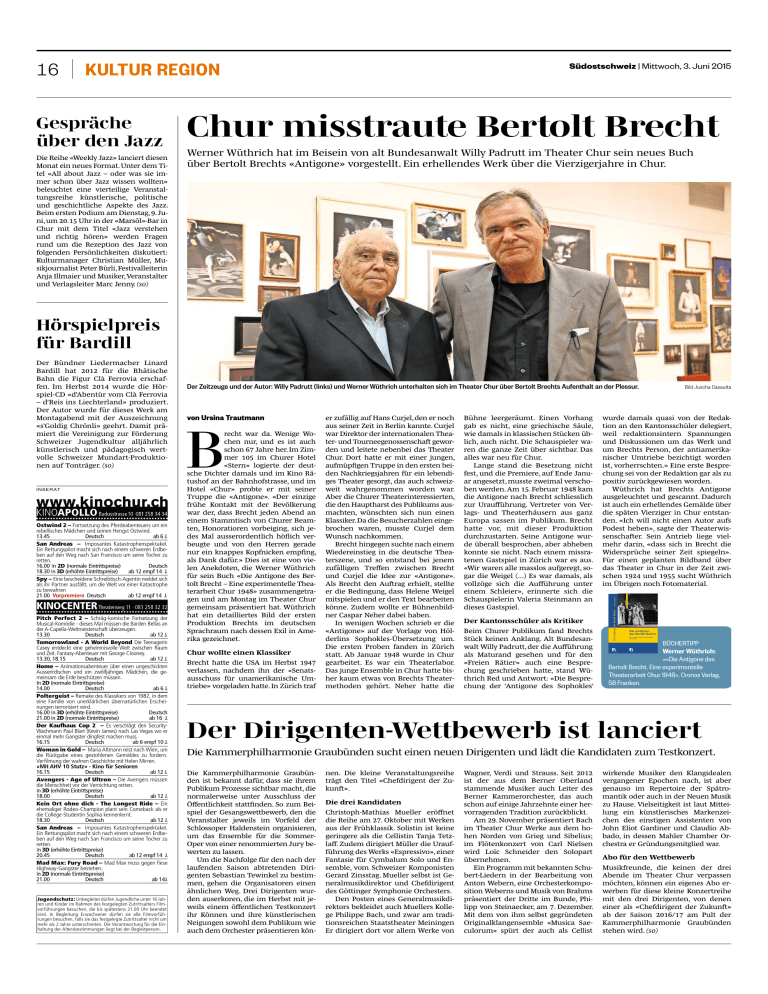 16 KULTUR REGION Gespräche über den Jazz Die Reihe «Weekly Jazz» lanciert diesen Monat ein neues Format. Unter dem Titel «All about Jazz – oder was sie immer schon über Jazz wissen wollten» beleuchtet eine vierteilige Veranstaltungsreihe künstlerische, politische und geschichtliche Aspekte des Jazz. Beim ersten Podium am Dienstag, 9.Juni, um 20.15 Uhr in der «Marsöl»-Bar in Chur mit dem Titel «Jazz verstehen und richtig hören» werden Fragen rund um die Rezeption des Jazz von folgenden Persönlichkeiten diskutiert: Kulturmanager Christian Müller, Musikjournalist Peter Bürli, Festivalleiterin Anja Illmaier und Musiker, Veranstalter und Verlagsleiter Marc Jenny. (so) Südostschweiz | Mittwoch, 3. Juni 2015 Chur misstraute Bertolt Brecht Werner Wüthrich hat im Beisein von alt Bundesanwalt Willy Padrutt im Theater Chur sein neues Buch über Bertolt Brechts «Antigone» vorgestellt. Ein erhellendes Werk über die Vierzigerjahre in Chur. Hörspielpreis für Bardill Pitch Perfect 2 – Schräg­komische Fortsetzung der Musical­Komödie ­ dieses Mal müssen die Barden Bellas an der A­Capella­Weltmeisterschaft überzeugen. 13.30 Deutsch ab 12 J. Tomorrowland - A World Beyond Die Teenagerin Casey entdeckt eine geheimnisvolle Welt zwischen Raum und Zeit. Fantasy­Abenteuer mit George Clooney. 13.30, 18.15 Deutsch ab 12 J. Home – Animationsabenteuer über einen ungeschickten Ausserirdischen und ein zwölfjähriges Mädchen, die ge­ meinsam die Erde beschützen müssen. In 2D (normale Eintrittspreise) 14.00 Deutsch ab 6 J. Poltergeist – Remake des Klassikers von 1982, in dem eine Familie von unerklärlichen übernatürlichen Erschei­ nungen terrorisiert wird. 16.00 In 3D (erhöhte Eintrittspreise) Deutsch 21.00 In 2D (normale Eintrittspreise) ab 16 J. Der Kaufhaus Cop 2 – Es verschlägt den Security­ Wachmann Paul Blart (Kevin James) nach Las Vegas wo er einmal mehr Gangster dingfest machen muss. 16.15 Deutsch ab 6 empf 10 J. Woman in Gold – Maria Altmann reist nach Wien, um die Rückgabe eines gestohlenen Gemäldes zu fordern. Verfilmung der wahren Geschichte mit Helen Mirren. «Mit AHV 10 Stutz» - Kino für Senioren 16.15 Deutsch ab 12 J. Avengers - Age of Ultron – Die Avengers müssen die Menschheit vor der Vernichtung retten. In 3D (erhöhte Eintrittspreise) 18.00 Deutsch ab 12 J. Kein Ort ohne dich - The Longest Ride – Ein ehemaliger Rodeo­Champion plant sein Comeback als er die College­Studentin Sophia kennenlernt. 18.30 Deutsch ab 12 J. San Andreas – Imposantes Katastrophenspektakel. Ein Rettungspilot macht sich nach einem schweren Erdbe­ ben auf den Weg nach San Francisco um seine Tocher zu retten. In 3D (erhöhte Eintrittspreise) 20.45 Deutsch ab 12 empf 14 J. Mad Max: Fury Road – Mad Max muss gegen fiese Highway­Gangster bestehen. In 2D (normale Eintrittspreise) 21.00 Deutsch ab 14J. Jugendschutz: Unbegleitet dürfen Jugendliche unter 16 Jah­ ren und Kinder im Rahmen des festgelegten Zutrittsalters Film­ vorführungen besuchen, die bis spätestens 21.00 Uhr beendet sind. In Begleitung Erwachsener dürfen sie alle Filmvorfüh­ rungen besuchen, falls sie das festgelegte Zutrittsalter nicht um mehr als 2 Jahre unterschreiten. Die Verantwortung für die Ein­ haltung der Altersbestimmungen liegt bei der Begleitperson. B recht war da. Wenige Wochen nur, und es ist auch schon 67 Jahre her. Im Zimmer 105 im Churer Hotel «Stern» logierte der deutsche Dichter damals und im Kino Rätushof an der Bahnhofstrasse, und im Hotel «Chur» probte er mit seiner Truppe die «Antigone». «Der einzige frühe Kontakt mit der Bevölkerung war der, dass Brecht jeden Abend an einem Stammtisch von Churer Beamten, Honoratioren vorbeiging, sich jedes Mal ausserordentlich höflich verbeugte und von den Herren gerade nur ein knappes Kopfnicken empfing, als Dank dafür.» Dies ist eine von vielen Anekdoten, die Werner Wüthrich für sein Buch «Die Antigone des Bertolt Brecht – Eine experimentelle Theaterarbeit Chur 1948» zusammengetragen und am Montag im Theater Chur gemeinsam präsentiert hat. Wüthrich hat ein detailliertes Bild der ersten Produktion Brechts im deutschen Sprachraum nach dessen Exil in Amerika gezeichnet. Chur wollte einen Klassiker Brecht hatte die USA im Herbst 1947 verlassen, nachdem ihn der «Senatsausschuss für unamerikanische Umtriebe» vorgeladen hatte. In Zürich traf er zufällig auf Hans Curjel, den er noch aus seiner Zeit in Berlin kannte. Curjel war Direktor der internationalen Theater- und Tourneegenossenschaft geworden und leitete nebenbei das Theater Chur. Dort hatte er mit einer jungen, aufmüpfigen Truppe in den ersten beiden Nachkriegsjahren für ein lebendiges Theater gesorgt, das auch schweizweit wahrgenommen worden war. Aber die Churer Theaterinteressierten, die den Hauptharst des Publikums ausmachten, wünschten sich nun einen Klassiker. Da die Besucherzahlen eingebrochen waren, musste Curjel dem Wunsch nachkommen. Brecht hingegen suchte nach einem Wiedereinstieg in die deutsche Theaterszene, und so entstand bei jenem zufälligen Treffen zwischen Brecht und Curjel die Idee zur «Antigone». Als Brecht den Auftrag erhielt, stellte er die Bedingung, dass Helene Weigel mitspielen und er den Text bearbeiten könne. Zudem wollte er Bühnenbildner Caspar Neher dabei haben. In wenigen Wochen schrieb er die «Antigone» auf der Vorlage von Hölderlins Sophokles-Übersetzung um. Die ersten Proben fanden in Zürich statt. Ab Januar 1948 wurde in Chur gearbeitet. Es war ein Theaterlabor. Das junge Ensemble in Chur hatte bisher kaum etwas von Brechts Theatermethoden gehört. Neher hatte die Bühne leergeräumt. Einen Vorhang gab es nicht, eine griechische Säule, wie damals in klassischen Stücken üblich, auch nicht. Die Schauspieler waren die ganze Zeit über sichtbar. Das alles war neu für Chur. Lange stand die Besetzung nicht fest, und die Premiere, auf Ende Januar angesetzt, musste zweimal verschoben werden. Am 15. Februar 1948 kam