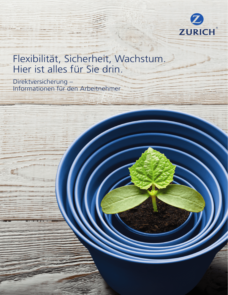 Flexibilität, Sicherheit, Wachstum. Hier ist alles für Sie drin. Direktversicherung – Informationen für den Arbeitnehmer Handeln Sie jetzt, damit Sie entspannt in die Zukunft blicken können In den letzten Jahren ist die Zahl der Menschen, die von Altersarmut bedroht sind, weiter angestiegen. Immer mehr Rentner beziehen die sogenannte Grundsicherung im Alter und leben damit am Existenzminimum. Ist die Grundversorgung nicht gesichert, droht Altersarmut Einkommen Dass die gesetzliche Rente nicht ausreicht, ist mittlerweile landläufig bekannt. Verschärfend hinzu kommt, dass das Niveau der gesetzlichen Rente fällt, während die allgemeine Lebens­ erwartung steigt. So entsteht im Alter eine Versorgungslücke. 100 % Aktuelles Gehalt Rentenlücke ca. 55 % Lebensqualität erhalten Möglichst wenig Einschränkungen im Alter Unsere Lösung für Sie: die Direktversicherung Grundversorgung sichern Wohnen, Essen, Kleidung Eine betriebliche, individuell gestal­ tete Altersversorgung während Ihrer Berufstätigkeit hilft Ihnen, Ihren Ruhe­ stand ohne Einschränkungen genießen zu können. Die Direktversicherung durch Gehalts­ umwandlung nach § 3 Nr. 63 Ein­ kommensteuergesetz bietet Ihnen als Arbeitnehmer eine flexible und sichere Möglichkeit, Ihre Versorgungslücke zu schließen, Steuern zu sparen und Ihren Lebensstandard auch im Alter halten zu können. 45 % Gesetzliche Rente Heute Rentenbeginn Alter Gute Gründe für eine Direktversicherung Lebensstandard im Rentenalter sichern Claudia M., 28 Jahre, ist Angestellte im öffentlichen Dienst. Sie möchte ihren Lebensstandard auch im Alter halten. Um dieses Ziel zu erreichen, schließt sie eine Direktversicherung ab und spart gleichzeitig Steuer- und Sozialversiche­ rungsabgaben. Altersversorgung aufbauen und gleichzeitig Steuern sparen Arno S., 38 Jahre, ist kaufmännischer Angestellter und hat Familie. Er wünscht sich eine flexible Vorsorgelösung, um seine Rentenlücke zu schließen. Die Direktver­sicherung lässt sich während der Laufzeit an seine Bedürfnisse an­passen und garantiert ihm im Alter eine sichere, lebens­lange Rente. Geringer Aufwand – große Wirkung Durch Steuerlast und Sozial­abgaben bleibt vom Gehalt oft weniger als die Hälfte übrig. Die Direktversicherung bietet Arbeitnehmern die Möglichkeit, Teile des Bruttogehalts steuerfrei für die Absicherung nach dem Berufsleben zurückzulegen. Einfach absichern Geld vom Staat mitnehmen Ihr Arbeitgeber schließt als Versiche­ rungsnehmer im Rahmen einer betrieb­ lichen Altersversorgung einen Ver­ sicherungsvertrag bei Zurich ab. Er ist sowohl Versicherungsnehmer als auch Beitragszahler. Die betriebliche Altersversorgung (bAV) wird vom Staat auf besondere Weise unterstützt. Sie als Arbeitnehmer werden als versi­ cherte Person eingetragen. Damit sind Sie und Ihre Hinterbliebenen bezugs­ berechtigt und erhalten die vertraglich vereinbarten Leistungen für den Erlebens- oder den Todesfall. Jeder Arbeitnehmer hat Anspruch auf betriebliche Altersversorgung im Rahmen der Entgeltumwandlung. Dabei werden Teile des Bruttogehalts als Beiträge über den Arbeitgeber unmittelbar in die Direktversicherung eingezahlt. Jährlich können maximal 4 % der Beitrags­bemessungsgrenze der gesetzlichen Rentenversicherung West in eine Direkt­versicherung umgewan­ delt werden.* Für diese Beiträge zahlen Sie keine ­Steuern und Sozialversicherungs­ beiträge. * Sofern es sich um eine Neuzusage handelt und kein nach § 40 b EStG pauschalbesteuerter Vertrag besteht, können zusätzlich 1.800 EUR steuerfrei eingezahlt werden. Der zusätzliche Festbetrag ist in voller Höhe sozial­ versicherungspflichtig. Erst die zur Auszahlung kommenden Leistungen sind in voller Höhe zu ver­ steuern – dann aber in der Regel mit einem geringeren Steuersatz als im aktiven Berufsleben. Pflichtversicherte und freiwillig in der gesetzlichen Krankenversicherung Versicherte müssen aus diesen Leistungen zusätzlich Beiträge zur Krankenund Pflegeversicherung zahlen. Kombinieren Sie Ihre Direktversicherung mit einer Absicherung für den Fall einer Berufsunfähigkeit Mit dem Wegfall der eigenen Arbeits­ kraft fehlt die Grundlage, sich selbst und Ihre Familie zu versorgen. Nur ein gesichertes Einkommen gibt Ihnen die Möglichkeit, Ihr Leben planbar zu gestalten. Deshalb sollten Sie Ihr wich­ tigstes Kapital sorgfältig absichern: Ihre Arbeitskraft. Mit dem Einschluss einer Berufsun­ fähigkeits­Absicherung in Kombination mit einer Direktversicherung bewahren Sie sich Ihre finanzielle Unabhängig­ keit – ganz gleich, was passiert. Sollten Sie berufsunfähig werden, übernimmt Zurich zudem die Beitragszahlung für Ihre Direktversicherung. Die häufigsten Ursachen von Berufsunfähigkeit – jeder Vierte ist betroffen 90,5 % Krankheiten Beispiele: Burnout­Syndrom, Bandscheibenvorfall, Depression, Krebs, Arthrose 9,5 % Unfälle Quelle: MORGEN & MORGEN GmbH, Stand: 04 / 2015 Flexibler Schutz, der wächst und gedeiht Was die Zukunft bringt, weiß niemand. Deshalb sollte eine optimale Vorsorgelösung jederzeit an Ihre Lebens­ situation angepasst werden können – so wie die Zurich Direktversicherung. Mit ihr gestalten Sie Ihren Vermö­ gensaufbau kontrolliert und flexibel. Individuelle Regelungen bei Elternzeit Wahlweise verschiedene Auszahlungsmöglichkeiten Entscheiden Sie selbst, ob Sie während Ihrer Elternzeit die Beiträge privat zahlen oder ob Sie Ihren Vertrag vorübergehend beitragsfrei stellen. Bei Rentenbeginn entscheiden Sie selbst, in welcher Form Sie die Auszahlung Ihrer Leistung wünschen. Sie haben die Wahl zwischen einer lebenslangen Rente und einer Kapital­ auszahlung. Alternativ ist auch eine Teilauszahlung bis zu 30 % möglich. Erweiterter Versicherungsschutz Die Direktversicherung kann mit einer Berufsunfähigkeitsversicherung und / oder einer Hinterbliebenen­ versorgung kombiniert werden. Möglichkeiten bei Zahlungs­ schwierigkeiten • Beitragsfreistellung und Wiederinkraftse