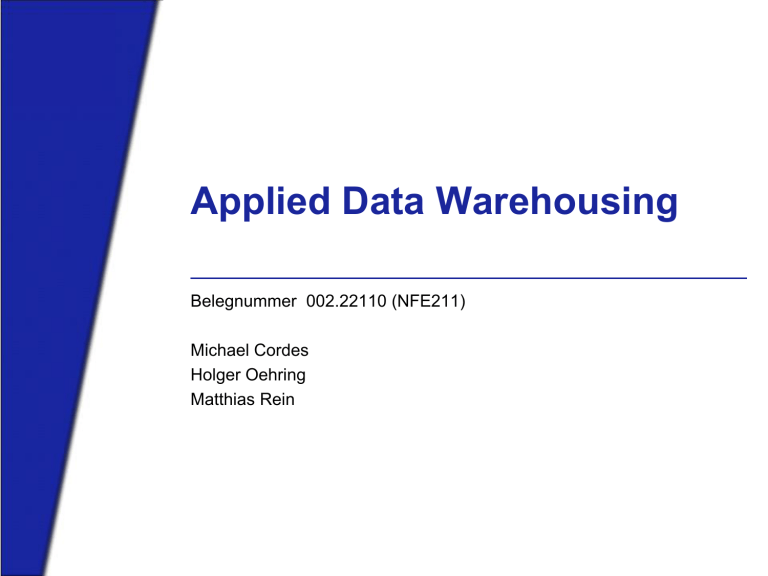 Applied Data Warehousing Belegnummer 002.22110 (NFE211) Michael Cordes Holger Oehring Matthias Rein Prolog Vorstellung Ablauf der Veranstaltung (Mikro & Makro) Teilnehmerliste (CNAM) Begleitende Literatur 2 2 Prolog Vorstellung Michael Cordes Architektur & Modellierung Matthias Rein ETL Holger Oehring Metadaten & Tools 3 3 Prolog Ablauf der Veranstaltung 15.10.2016 MIC Architektur 9:00 - 12:00 Uhr 4 22.10.2016 MIC Datenmodellierung 9:00 - 15:00 Uhr 4+2 29.10.2016 MIC Datenmodellierung 9:00 - 15:00 Uhr 4+2 05.11.2016 MIC Datenmodellierung 9:00 - 15:00 Uhr 4+2 12.11.2016 MSR ETL 9:00 - 15:00 Uhr 4+2 19.11.2016 MSR ETL 9:00 - 15:00 Uhr 4+2 26.11.2016 MSR ETL 9:00 - 15:00 Uhr 4+2 03.12.2016 HOE Reporting 9:00 - 15:00 Uhr 4+2 10.12.2016 HOE Metadaten 9:00 - 15:00 Uhr 4+2 14.01.2017 HOE QA / Wiederholung 9:00 - 15:00 Uhr 4+2 9:00 - 12:00 Uhr 4 21.01.2017 MIC/MSR/HOE Prüfung (Klausur) https://www.fbi.h-da.de/organisation/personen/cordes-michael-oehring-holger-rein-matthias.html MIC MSR HOE Michael Cordes Matthias Rein Holger Oehring Raum Labor D14 / 111 D14 / 112 4 4 Begleitende Literatur Ralph Kimball The Data Warehouse Lifecycle Toolkit The Data Warehouse Toolkit: The Complete Guide to Dimensional Modelling The Data Warehouse ETL Toolkit KDT http://www.kimballgroup.com/html/forms/sendmail.html?TrkID=DT128_SUBS Larry English Improving Data Warehouse and Business Information Quality: Methods for Reducing Costs and Increasing Profits Bill Inmon Managing the Data Warehouse 5 5 Warm-Up Begriffe rund um DWH Wozu überhaupt ein DWH? Das kann DWH in der Praxis sein 6 6 Warm-Up Begriffe rund um DWH Liste mit 20 Fragen rund um‘s Data Warehousing Stichwörter ( Brainstorming) 20 Minuten Keine Namen 7 7 Warm-Up Wozu überhaupt ein DWH? Es sind doch alle Daten da! … aber diese Daten: … sind verteilt … liegen in unterschiedlichen Strukturen vor … haben unterschiedliche Bedeutung … dürfen nicht von allen gelesen werden … müssen schnell abrufbar sein … müssen zeitlich & inhaltlich konsistent sein … 8 8 Warm-Up Das kann DWH in der Praxis sein 9 9 Warm-Up Das kann DWH in der Praxis sein 10 10 Warm-Up Das kann DWH in der Praxis sein RTB QA-Prozess Workflow-Tool JIRA n Ei RP Referenzdatenpfleger be ar b - neue Anforderungen - Unterstützung/Eingabe bzgl. Daten-QA Maßnahmen entscheiden: - Teillieferungen - Korrekturlauf - etc. plant QM p QA Manager rüft t e ch nis t fac p rü f ch be ga ft F re i ein se n /w w und ertet his aus tor i si e rt h e rt eilt OP Operator lic alt se es t o z ch Pr rwa t rte be sta nd ü u inh Pa r d i e a me t Pro er f duk ür tion Checkliste flie s n vo ng n ei igu en ßt cht ng flie ksi irku üc lw e r se r B ch te We Operatingund Resource-Plan im Scheduler Analyst SAS, SQL BA h hlic Business Approver QA-Monitor: - Process M. - Business M. stellt a uf un AV Arbeitsvorbereiter fließt ein BIP - WEB Anwender rru tiert Regelprozeß im Prozeß Repository sts : ts es qu rten e R sta ng n ru vo l a u f d e n n r lle ktu enä e t e n s rr o d Ei - Ko eth -M ide me n n/ mi g ter un fer fer L i e e rl i e nd So imple Sonderprozess: - Korrektur - Archivierung - Reorganisation Re e qu en eit : ts es qu Re e n uf vo r l ä n n de ture le el on ek st - S o r r -K PV Prozessveantwortlicher vorgelagerte Systeme SI SonderprozessImplementierer Prozessprotokolle technisch is Bas für e technische Freigab ltliche Freigabe automatisierte inha DK Dokumentierer BIP Freigabefunktion Veröffentlichung / Dokumentation / Archivierung 11 11 Inhalte Datenmodellierung (Block I) Architekturansätze Lebenszyklus Projektorganisation Anforderungsaufnahme Modellierung ETL (Block II) Analyse der Vorsysteme Datenqualität & Testen Schlüsselmanagement Analyse (Block III) Reporting & Analyse Speicherstrukturen & Datenbankkonzepte Metadaten QS 12 12 Ziele eines DWHs Informationen müssen einfach zugänglich sein zusammen passen (Konsistenz) geschützt sein Unterstützung des Entscheidungsprozesses Akzeptanz durch die Anwender 13 13 DWH – Eine Analogie Verlagswesen Kenne deine Leser Veröffentliche die richtigen Themen Enttäusche (und täusche) die Leser nicht Themen (Eingaben) kommen aus verschiedenen Quellen Bearbeitung hinsichtlich Qualität und Konsistenz Regelmäßige Veröffentlichung Der Erfolg lässt sich an den Lesern ablesen! 14 14 DWH – Eine Analogie DWH Kenne Deine Anwender – den Fachbereich Veröffentliche die richtigen Daten Wichtig Verständlich Angemessene Zugriffszeit Kosten (TCO) Daten kommen aus verschiedenen Quellen Sicherstellung der Qualität Bedarfsgerechte Datenbereitstellung Der Erfolg lässt sich an den Nutzern ablesen! 15 15 Architektur Datenbereitstellung Extraktion Staging Transformation Berichtswesen & Analyse Projektdurchführung Anforderungsanalyse Datenmodellierung Projektmanagement … 16 16 Ansatzarten zur Datenbereitstellung Corporate Information Factory (CIF) nach Inmon „Chess Pieces“ nach Kimball im Lifecycle 17 17 Ansatzarten Corporate Information Factory (CIF) Präsentationsschicht Data Staging Extrakt Enterprise DWH Extrakt Extrakt Load Normalisiert (3NF) E T Load Aggregierte Daten für Geschäftsber eiche Auswertung Zugriff auf Detaildaten 18 18 Ansatzarten Corporate Information Factory (CIF) 3NF, Datamarts werden abgeleitet Atomare Daten in der Regel nicht in den Datamarts, sondern nur im EDW: Enterprise DWH atomare Daten: Enterprise DWH aggregierte Daten: Dimensional Models 19 19 Ansatzarten „Chess Pieces“ nach Kimball Data Staging Präsentationsschicht Auswertung Services: AdHoc SQL Extrakt ReportingTools Datamarts Data-Mining Data Stores: Extrakt Auswertung Load Designziele: Extrakt Zugriff auf Detaildaten Busarchitektur 20 20 Ansatzarten „Chess Pieces“ nach Kimball im Lifecycle Data Staging & Presentation klar getrennt Zugriff ausschließlich auf Data Presentation Daten werden in Themenbereiche geclustert Atomare Daten in der Präsentationsschicht 21 21 Ansatzarten Hybrid Data Staging Präsentationsschicht Auswertung Extrakt Datamarts