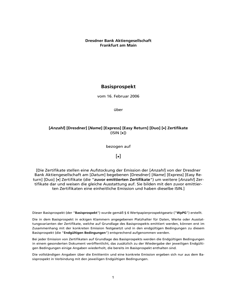 = = = aêÉëÇåÉê=_~åâ=^âíáÉåÖÉëÉääëÅÜ~Ñí= cê~åâÑìêí=~ã=j~áå= = = = = = = = = _~ëáëéêçëéÉâí= = îçã=NSK=cÉÄêì~ê=OMMS= = = ΩÄÉê= = = = x^åò~Üäz=xaêÉëÇåÉêz=xk~ãÉz=xbñéêÉëëz=xb~ëó=oÉíìêåz=xaìçz=x•z=wÉêíáÑáâ~íÉ= Efpfk=x•zF= = = ÄÉòçÖÉå=~ìÑ== = x•z= == = xaáÉ=wÉêíáÑáâ~íÉ=ëíÉääÉå=ÉáåÉ=^ìÑëíçÅâìåÖ=ÇÉê=bãáëëáçå=ÇÉê=x^åò~Üäz=îçå=ÇÉê=aêÉëÇåÉê= _~åâ=^âíáÉåÖÉëÉääëÅÜ~Ñí=~ã=xa~íìãz=ÄÉÖÉÄÉåÉå=xaêÉëÇåÉêz=xk~ãÉz=xbñéêÉëëz=xb~ëó=oÉJ íìêåz=xaìçz=x•z=wÉêíáÑáâ~íÉ=EÇáÉ=?òìîçê=ÉãáííáÉêíÉå=wÉêíáÑáâ~íÉ?F=ìã=ïÉáíÉêÉ=x^åò~Üäz=wÉêJ íáÑáâ~íÉ=Ç~ê=ìåÇ=ïÉáëÉå=ÇáÉ=ÖäÉáÅÜÉ=^ìëëí~ííìåÖ=~ìÑK=páÉ=ÄáäÇÉå=ãáí=ÇÉå=òìîçê=ÉãáííáÉêJ íÉå=wÉêíáÑáâ~íÉå=ÉáåÉ=ÉáåÜÉáíäáÅÜÉ=bãáëëáçå=ìåÇ=Ü~ÄÉå=ÇáÉëÉäÄÉ=fpfkKz= = = = = aáÉëÉê=_~ëáëéêçëéÉâí=EÇÉê=?_~ëáëéêçëéÉâí?F=ïìêÇÉ=ÖÉã®≈=¬=S=tÉêíé~éáÉêéêçëéÉâíÖÉëÉíò=E?témd?F=ÉêëíÉääíK== aáÉ= áå= ÇÉã= _~ëáëéêçëéÉâí= áå= ÉÅâáÖÉå= hä~ããÉêå= ~åÖÉÖÉÄÉåÉå= mä~íòÜ~äíÉê= ÑΩê= a~íÉåI= tÉêíÉ= çÇÉê= ^ìëëí~íJ íìåÖëî~êá~åíÉå=ÇÉê=wÉêíáÑáâ~íÉI=ïÉäÅÜÉ=~ìÑ=dêìåÇä~ÖÉ=ÇÉë=_~ëáëéêçëéÉâíë=ÉãáííáÉêí=ïÉêÇÉåI=â∏ååÉå=Éêëí=áã= wìë~ããÉåÜ~åÖ= ãáí= ÇÉê= âçåâêÉíÉå= bãáëëáçå= ÑÉëíÖÉëÉíòí= ìåÇ= áå= ÇÉå= ÉåÇÖΩäíáÖÉå= _ÉÇáåÖìåÖÉå= òì= ÇáÉëÉã= _~ëáëéêçëéÉâí=EÇáÉ=?båÇÖΩäíáÖÉå=_ÉÇáåÖìåÖÉå?F=ÉåíëéêÉÅÜÉåÇ=~ìÑÖÉåçããÉå=ïÉêÇÉåK== _Éá=àÉÇÉê=bãáëëáçå=îçå=wÉêíáÑáâ~íÉå=~ìÑ=dêìåÇä~ÖÉ=ÇÉë=_~ëáëéêçëéÉâíë=ïÉêÇÉå=ÇáÉ=båÇÖΩäíáÖÉå=_ÉÇáåÖìåÖÉå= áå=ÉáåÉã=ÖÉëçåÇÉêíÉå=açâìãÉåí=îÉê∏ÑÑÉåíäáÅÜíI=Ç~ë=òìë®íòäáÅÜ=òì=ÇÉê=táÉÇÉêÖ~ÄÉ=ÇÉê=àÉïÉáäáÖÉå=båÇÖΩäíáJ ÖÉå=_ÉÇáåÖìåÖÉå=ÉáåáÖÉ=^åÖ~ÄÉå=ïáÉÇÉêÜçäíI=ÇáÉ=ÄÉêÉáíë=áã=_~ëáëéêçëéÉâí=ÉåíÜ~äíÉå=ëáåÇK== aáÉ=îçääëí®åÇáÖÉå=^åÖ~ÄÉå=ΩÄÉê=ÇáÉ=bãáííÉåíáå=ìåÇ=ÉáåÉ=âçåâêÉíÉ=bãáëëáçå=ÉêÖÉÄÉå=ëáÅÜ=åìê=~ìë=ÇÉã=_~J ëáëéêçëéÉâí=áå=sÉêÄáåÇìåÖ=ãáí=ÇÉå=àÉïÉáäáÖÉå=båÇÖΩäíáÖÉå=_ÉÇáåÖìåÖÉåK== = 1 = fåÜ~äíëîÉêòÉáÅÜåáë= wìë~ããÉåÑ~ëëìåÖ= R NK ^åÖÉÄçí= R OK oáëáâçÑ~âíçêÉå= S PK tÉëÉåíäáÅÜÉ=jÉêâã~äÉ=áå=_ÉòìÖ=~ìÑ=ÇáÉ=bãáííÉåíáå= V QK tÉëÉåíäáÅÜÉ=jÉêâã~äÉ=áå=_ÉòìÖ=~ìÑ=ÇáÉ=wÉêíáÑáâ~íÉ= NO oáëáâçÑ~âíçêÉå= NS oáëáâçÑ~âíçêÉå=ÄÉòΩÖäáÅÜ=ÇÉê=bãáííÉåíáå= NS oáëáâçÑ~âíçêÉå=ÄÉòΩÖäáÅÜ=ÇÉê=wÉêíáÑáâ~íÉ= OO NK ^ääÖÉãÉáåÉ=oáëáâÉå=ÇÉê=wÉêíáÑáâ~íÉ= OO OK _ÉëçåÇÉêÉ= oáëáâÉå= ÇÉê= xaêÉëÇåÉêz= xk~ãÉz= xbñéêÉëëz= xb~ëó= oÉíìêåz= xaìçz=x•z=wÉêíáÑáâ~íÉ= OP oáëáâÉå=ÇÉê=_~ëáëïÉêíÉ= OU PK ^ääÖÉãÉáåÉ=^åÖ~ÄÉå=òì=ÇÉå=wÉêíáÑáâ~íÉå= PM NK dÉÖÉåëí~åÇ=ÇÉë=_~ëáëéêçëéÉâíë= PM OK ^ìëÖ~ÄÉ=ÇÉê=wÉêíáÑáâ~íÉ= PM PK fåÑçêã~íáçåÉå=ΩÄÉê=ÇáÉ=_~ëáëïÉêíÉ= PN QK _∏êëÉååçíáÉêìåÖ= PN RK sÉê~åíïçêíìåÖ= PN SK _ÉêÉáíÜ~äíìåÖ=îçå=råíÉêä~ÖÉåX=_Éâ~ååíã~ÅÜìåÖÉå= PO TK fpfkJkìããÉê= PO UK w~ÜäëíÉääÉ= PO VK btoJm~ëë= PO NMK ^åÖÉÄçíëJ=ìåÇ=sÉêâ~ìÑëÄÉëÅÜê®åâìåÖÉå= PP x_ÉëÅÜêÉáÄìåÖ=ÇÉê=_~ëáëïÉêíÉz= PR xNK xk~ãÉ=ÇÉë=ÉêëíÉå=_~ëáëïÉêíëzz= PR xOK xk~ãÉ=ÇÉë=òïÉáíÉå=_~ëáëïÉêíëzz= PR wÉêíáÑáâ~íëÄÉÇáåÖìåÖÉå= PS ¬=N=aáÉ=wÉêíáÑáâ~íÉ= PS = 2 = ¬=O=cçêã=ÇÉê=wÉêíáÑáâ~íÉX=eáåíÉêäÉÖìåÖX=§ÄÉêíê~ÖìåÖ= PT ¬=P=pí~íìë= PU ¬=Q=wáåëÉå= PU ¬=R=i~ìÑòÉáíX=c®ääáÖâÉáíX=oΩÅâò~ÜäìåÖëÄÉíê~Ö= PU ¬=S=w~ÜäìåÖÉå= PV ¬=T=_~ëáëïÉêíÉ= PV x¬=xUz=^åé~ëëìåÖÉå=áå=_ÉòìÖ=~ìÑ=fåÇáòÉëz= QM x¬=xVz=^åé~ëëìåÖÉå=áå=_ÉòìÖ=~ìÑ=^âíáÉåz= QM x¬=xNMz=^åé~ëëìåÖÉå=áå=_ÉòìÖ=~ìÑ=xoçÜëíçÑÑÉzxI=zxcìíìêÉëzxI=z= xcçåÇëzxI=x•zzxìåÇzx•zz= QO ¬=xNNz=pçåëíáÖÉ=^åé~ëëìåÖÉåX=_Éâ~ååíã~ÅÜìåÖ=îçå=^åé~ëëìåÖÉå= QO ¬=xNOz=bêëÉíòìåÖÉå= QO ¬=xNPz=j~êâíëí∏êìåÖÉå= QP ¬=xNQz=^ì≈ÉêçêÇÉåíäáÅÜÉ=hΩåÇáÖìåÖ=ÇìêÅÜ=ÇáÉ=bãáííÉåíáå= QQ ¬=xNRz=_ÉëçåÇÉêÉ=hΩåÇáÖìåÖëÖêΩåÇÉ= QR ¬=xNSz=píÉìÉêå= QS ¬=xNTz=w~ÜäëíÉääÉ= QS ¬=xNUz=bêëÉíòìåÖ=ÇÉê=bãáííÉåíáå= QT ¬=xNVz=_Éâ~ååíã~ÅÜìåÖÉå= QU ¬=xOMz=sÉêëÅÜáÉÇÉåÉë= QU _ÉëíÉìÉêìåÖ= = QV xNK ^ääÖÉãÉáåÉ=eáåïÉáëÉ= QV OK fã=fåä~åÇ=~åë®ëëáÖÉ=^åäÉÖÉê= QV PK fã=^ìëä~åÇ=~åë®ëëáÖÉ=^åäÉÖÉê= RN QK br=wáåëêáÅÜíäáåáÉz= RN _ÉëÅÜêÉáÄìåÖ=ÇÉê=aêÉëÇåÉê=_~åâ=dêìééÉ= RO= dÉëÅÜ®ÑíëΩÄÉêÄäáÅâ= RP= gΩåÖëíÉ=båíïáÅâäìåÖ=ìåÇ=^ìëÄäáÅâ= SU= báåëÉÜÄ~êÉ=açâìãÉåíÉ= SU= hçåòÉêåJwïáëÅÜÉåÄÉêáÅÜí=aêÉëÇåÉê=_~åâ=^d=g~åì~ê=Äáë=gìåá=OMMR=EåáÅÜí=íÉë
