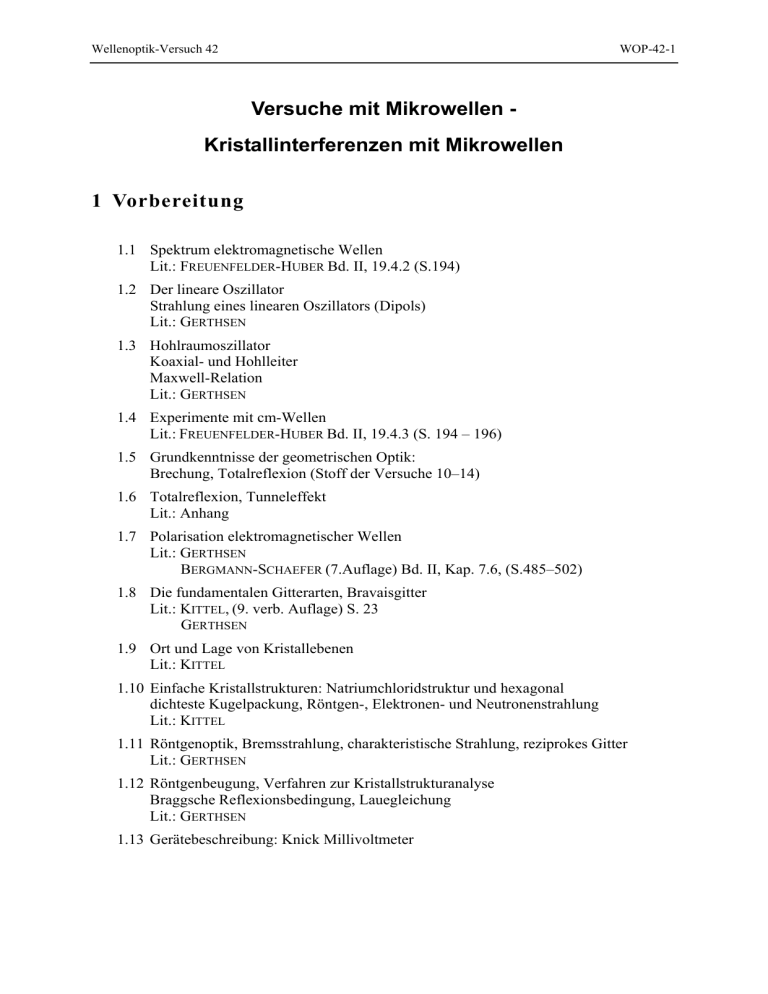 Wellenoptik-Versuch 42 WOP-42-1 Versuche mit Mikrowellen Kristallinterferenzen mit Mikrowellen 1 Vorbereitung 1.1 Spektrum elektromagnetische Wellen Lit.: FREUENFELDER-HUBER Bd. II, 19.4.2 (S.194) 1.2 Der lineare Oszillator Strahlung eines linearen Oszillators (Dipols) Lit.: GERTHSEN 1.3 Hohlraumoszillator Koaxial- und Hohlleiter Maxwell-Relation Lit.: GERTHSEN 1.4 Experimente mit cm-Wellen Lit.: FREUENFELDER-HUBER Bd. II, 19.4.3 (S. 194 – 196) 1.5 Grundkenntnisse der geometrischen Optik: Brechung, Totalreflexion (Stoff der Versuche 10–14) 1.6 Totalreflexion, Tunneleffekt Lit.: Anhang 1.7 Polarisation elektromagnetischer Wellen Lit.: GERTHSEN BERGMANN-SCHAEFER (7.Auflage) Bd. II, Kap. 7.6, (S.485–502) 1.8 Die fundamentalen Gitterarten, Bravaisgitter Lit.: KITTEL, (9. verb. Auflage) S. 23 GERTHSEN 1.9 Ort und Lage von Kristallebenen Lit.: KITTEL 1.10 Einfache Kristallstrukturen: Natriumchloridstruktur und hexagonal dichteste Kugelpackung, Röntgen-, Elektronen- und Neutronenstrahlung Lit.: KITTEL 1.11 Röntgenoptik, Bremsstrahlung, charakteristische Strahlung, reziprokes Gitter Lit.: GERTHSEN 1.12 Röntgenbeugung, Verfahren zur Kristallstrukturanalyse Braggsche Reflexionsbedingung, Lauegleichung Lit.: GERTHSEN 1.13 Gerätebeschreibung: Knick Millivoltmeter WOP-42-2 Wellenoptik-Versuch 42 2 Aufgaben 2.1 Inbetriebnahme der Apparatur Der Mikrowellensender besteht aus einem Gunnoszillator1. Der Sender wird durch Einstecken des Netzsteckers in die Steckdose in Betrieb genommen. Man stellt zunächst den Sender auf die optische Bank und in etwa 1.50 m Entfernung den Empfänger mit Horn. Die Anzeige des Instruments schwankt u.U. stark, weil Mikrowellen am Körper des Beobachters reflektiert werden und in den Empfänger gelangen. Die Intensität dieser Wellen hängt stark von der Stellung des Beobachters ab. Man achte bei allen Versuchen darauf, dass keine zusätzlichen reflektierten Wellen den Empfänger treffen. 2.2 Winkelverteilung der Strahlung Der Sender wird nun so auf den Drehtisch der Goniometeranordnung gestellt, dass das Horn etwa im Drehpunkt liegt. Zur Messung der Senderfeldstärke wird die Hochfrequenzdiode mit Halterung auf das Ende des Schwenkarms gestellt. Man achte darauf, dass die Diode an die Buchse des Millivoltmeters angeschlossen ist. Dann stelle man das Millivoltmeter auf seinen unempfindlichsten Bereich und schalte es ein. Nun wird die Winkelverteilung der Strahlung gemessen. Die Messwerte sind auf Polarkoordinatenpapier aufzutragen und der Halbwertswinkel zu bestimmen. 2.3 Messung der Brennweite einer Wachslinse Auf der optischen Bank wird die Wachslinse zwischen Sender und Empfänger mit Horn gestellt. Der Abstand Sender-Linse sei ca. 80 cm. Nun wird die Intensität auf dem Hauptstrahl, mit der größten Entfernung Linse-Empfänger beginnend, in sinnvollen Abständen gemessen. Die Messergebnisse werden graphisch aufgetragen und aus der mittleren Kurve durch die Messpunkte das Maximum dieser Kurve bestimmt. Die Brennweite der Linse wird dann mit Hilfe der Abbildungsgleichung berechnet (Fehler der Methode angeben). Hier wird die Intensität mit dem Hornempfänger (42-3) gemessen. 2.4 Bestimmung der Wellenlänge λ mit stehenden Wellen Man setze den Sender auf die optische Bank und in etwa 1 m Entfernung den Metallspiegel. Mit der Diode wird nun die Lage der Knoten der stehenden Welle ausgemessen. Aus dem Abstand von etwa 30-40 Knoten wird die Wellenlänge mit Fehler bestimmt. 2.5 Bestimmung der Wellenlänge von Mikrowellen mit dem MichelsonInterferometer Das Interferometer für Mikrowellen besitzt als halbdurchlässigen Spiegel eine Hartfaserplatte. Die Beobachtung der Interferenzen geschieht mit einem Mikrowellendetektor, der analog zu dem Auseinanderquellen von Interferenzringen im Bereich des sichtbaren Lichts beim Verschieben eines der Spiegel Minima und Maxima misst. Man mache sich die Entstehung der periodischen Schwankungen im Fall der Mikrowellen klar. Man verschiebe den einen Spiegel so weit, dass 10 bis 20 Maxima durchlaufen werden und bestimme mit Hilfe der Verschiebungsstrecke die Wellenlänge. 1 GUNN ist der Name des Physikers, der den sogenannten Gunn-Effekt gefunden hat. Die Gunn-Diode ist ein modernes Halbleiterbauelement, dessen Funktionsweise mit einfachen Mitteln nicht zu erklären ist. Wellenoptik-Versuch 42 WOP-42-3 2.6 Totalreflexion und Tunneleffekt Sender, Diode und eine Linse werden auf die optische Bank gesetzt (der Sender etwa in den Brennpunkt der Linse). Zwischen Linse und Empfänger (Stellung A) wird ein verschiebbarer Tisch gestellt, auf den man zwei 90° Paraffinprismen setzt. In der Ausgangsstellung sollen die Prismen einander berühren (d = 0). Nun misst man in Stellung A die Intensität der das Doppelprisma durchsetzenden Strahlung als Funktion des Abstandes d und in Stellung B die Intensität der reflektierten Strahlung, ebenfalls in Abhängigkeit von d. Die Ergebnisse trage man graphisch auf (Stellung A halblogarithmisch). Abb. 1 Messung des Tunneleffektes 2.7 Polarisation von Mikrowellen Man setze den Sender und den auf einer Drehvorrichtung montierten Empfänger auf die optische Bank. Man überzeuge sich, dass die Strahlung polarisiert ist, indem man den Empfänger in Normallage und senkrecht dazu stellt. Ein zusätzlicher Beweis wird durch Verwendung eines Gitters erbracht. Stehen Sender und Empfänger aufrecht und wird dazwischen das Gitter mit seinen Stäben ebenfalls senkrecht angeordnet, so wird fast die gesamte Intensität reflektiert. Steht das Gitter jedoch im rechten Winkel zum elektrischen Feld, dann werden die Wellen fast nicht reflektiert und können durch das Gitter durchtreten. Stehen Sender und Empfänger senkrecht zueinander, dann registriert der Empfänger maximale Intensität, wenn das Gitter unter 45° steht (wie ist dies zu erklären?). Man messe auch die Reflexion am Gitter in Abhängigkeit vom Winkel und überzeuge sich so von der Funktionsweise des Gitters. 2.8 Bestimmung der Gitterkonstanten eines kubische
