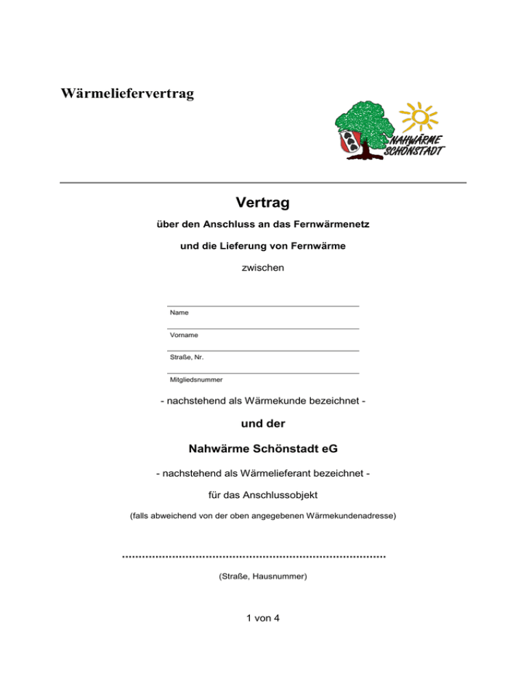 Wärmeliefervertrag Vertrag über den Anschluss an das Fernwärmenetz und die Lieferung von Fernwärme zwischen Name Vorname Straße, Nr. Mitgliedsnummer - nachstehend als Wärmekunde bezeichnet - und der Nahwärme Schönstadt eG - nachstehend als Wärmelieferant bezeichnet für das Anschlussobjekt (falls abweichend von der oben angegebenen Wärmekundenadresse) ............................................................................... (Straße, Hausnummer) 1 von 4 1. Vertragsgegenstand 1.1. Der Wärmelieferant versorgt das oben angegebene Anschlussobjekt des Wärmekunden auf der Grundlage dieses Vertrages und der aktuell gültigen Verordnung über Allgemeine Bedingungen für die Versorgung mit Fernwärme (AVBFernwärmeV) ganzjährig mit Wärme für die Raumheizung sowie die Warmwasserbereitung. Als Wärmeträger dient Wasser. 1.2. Für das Anschlussobjekt wird eine maximale Wärmeanschlussleistung von Q’ = ......................... KW vereinbart. 1.3. Für die Abschlagszahlungen wird zunächst von einer Wärmemengenabnahme von Q’ =……………………...kWh pro Jahr ausgegangen. 1.4. Die Wärmelieferung soll ab der Heizperiode 2012 / 2013 erfolgen. 1.5. Der Wärmelieferant stellt dem Wärmekunden die Wärme an der Sekundärseite der Hausübergabestation zur Verfügung. Hier enden Lieferpflicht und Verantwortlichkeit des Wärmelieferanten. Ab der Sekundärseite der Hausübergabestation geht die Verantwortlichkeit für die Verteilung der Wärme auf den Wärmekunden über. 2. Technische Bedingungen 2.1. Der Wärmelieferant errichtet, verlegt und unterhält die für die Wärmelieferung notwendigen technischen Anlagen bis einschließlich der Übergabestation und der geeichten Wärmemengenmesseinrichtung (Wärmemengenzähler) im Anschlussobjekt. 2.2. Der Wärmekunde gestattet dem Wärmelieferanten oder einer von ihm beauftragten Firma auf dem Grundstück des Wärmekunden die Installation der technischen Anlagen (Wärmeleitung und Hausübergabestation), die für die Belieferung des Wärmekunden mit Wärme notwendig sind. Diese technischen Anlagen bleiben Eigentum des Wärmelieferanten. Der Wärmekunde verpflichtet sich, auf Anforderung des Wärmelieferanten, auf dessen Kosten eine auf den Namen des Wärmelieferanten lautende Dienstbarkeit hinsichtlich der dauerhaften Duldung der auf dem Grundstück des Wärmekunden verlegten Leitungen und der Hausübergabestation des Wärmelieferanten zu bestellen. Soweit die Dienstbarkeit nicht eingetragen ist, gilt ihr Inhalt als schuldrechtlich vereinbart. 2.3. Der Wärmekunde verpflichtet sich, die für seine Anlage festgelegten technischen Bedingungen einzuhalten und seine Anlage so zu betreiben, dass von ihr keine störenden Einflüsse auf das Wärmenetz des Wärmelieferanten ausgehen. Der Wärmekunde verpflichtet sich, Störungen an der Hausübergabestation unverzüglich dem Wärmelieferanten zu melden. 2.4. Dem Wärmekunden ist es untersagt über die reguläre Bedienung hinaus technische Maßnahmen oder Reparaturen an der Hausübergabestation durchzuführen. Für Schäden an der Hausübergabestation, die auf grob fahrlässige oder vorsätzliche unzulässige Eingriffe des Wärmekunden zurückzuführen sind, haftet der Wärmekunde. 2.5. Dem Wärmelieferanten steht ein außerordentliches Kündigungsrecht des Vertrages zu, soweit durch grob fahrlässige oder vorsätzliche Eingriffe des Wärmekunden gem. §§ 23, 33 AVBFernwärmeV an der Hausübergabestation entweder Schäden am Fernwärmenetz entstanden sind oder entstehen können, oder insbesondere die Wärmemengenmesseinrichtung gem. Ziffer 3.4. dieses Vertrages in ihrer Funktion beeinträchtigt werde könnte. 2.6. Das als Wärmeträger dienende Wasser kann technisch bedingt Zusätze enthalten. Es darf vom Wärmekunden nicht als Trink- oder Gebrauchswasser entnommen, in seiner Zusammen- 2 von 4 setzung verändert oder verunreinigt werden. Auf die hohe Vorlauftemperatur wird ausdrücklich hingewiesen. 2.7. Für die Verbrauchserfassung, die Prüfung, Wartung und Reparatur der technischen Einrichtungen, die Behebung von Störfällen sowie zur Wahrnehmung sonstiger Rechte und Pflichten gemäß diesem Vertrag gestattet der Wärmekunde einem ausgewiesenen Beauftragten des Wärmelieferanten in notwendigem Umfang ein Zutrittsrecht auf sein Grundstück, sowie Zugang zu den Räumen, in denen sich die technischen Einrichtungen des Wärmelieferanten befinden. Dieses Zutrittsrecht wird hiermit ausdrücklich vereinbart. Wird dieser Zutritt verwehrt und kann deshalb der Wärmelieferant bei Störfällen nicht zu den technischen Anlagen gelangen, trägt der Wärmekunde die hieraus entstehenden Kosten. 2.8. Der Wärmekunde ist berechtigt, die Wärme an seine Mieter weiterzuleiten. In diesen Fällen hat er die Mieter darauf hinzuweisen, dass seine Mieter gegenüber dem Wärmelieferanten keine weitergehenden Schadensersatzansprüche erheben können, als in der AVBFernwärmeV vorgesehen sind. Eine Weiterleitung der bezogenen Wärme an Dritte ist nur in Absprache mit dem Wärmelieferanten möglich. 3. Anschlussgebühren, Preise, Bezahlung und Abrechnung 3.1. Der Wärmekunde zeichnet einmalig je Wärmeübergabestation neun Geschäftsanteile von je 500,00 Euro der Nahwärme Schönstadt eG. Der Betrag ist bis spätestens 31.03.2012 fällig. Wird der Wärmelieferungsvertrag vor dem 31.12.2011 geschlossen, ist eine Ratenzahlung möglich. Die Summe kann in gleichmäßigen Raten bis zum 31.03.2012 beginnend mit dem auf den Abschluss des Wärmelieferungsvertrages folgenden Monats aufgeteilt werden. 3.2 Darüber hinaus zahlt der Wärmekunde • einen Arbeitspreis für die bezogene Wärme; • einen Grundpreis für die Wärmebereitstellung. 3.3 Die vom Wärmekunden bezogene Wärmemenge wird mittels eines geeichten Wärmemengenzählers an der Übergabestation gemessen. 3.4. Der Anschluss der Kundenanlage wird durch den Wärmelieferanten bis zur Primärseite der Wärmeübergabestation ausgeführt. Erdarbeiten ab der Grundstü