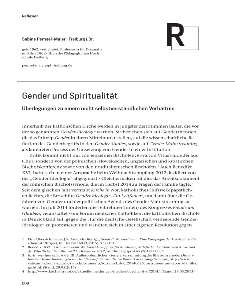 Reflexion Sabine Pemsel-Maier | Freiburg i.Br. geb. 1962, verheiratet, Professorin für Dogmatik und ihre Didaktik an der Pädagogischen Hochschule Freiburg pemsel-maier@ph-freiburg.de Gender und Spiritualität Überlegungen zu einem nicht selbstverständlichen Verhältnis Innerhalb der katholischen Kirche werden in jüngster Zeit Stimmen lauter, die vor der so genannten Gender-Ideologie warnen. Sie beziehen sich auf Gen­dertheorien, die das Prinzip Gender in ihren Mittelpunkt stellen, auf die wis­sen­schaftliche Reflexion des Genderbegriffs in den Gender Studies, sowie auf Gender Mainstreaming als konkreten Prozess der Umsetzung von Gender in einer Institution. Kritik kommt nicht nur von einzelnen Bischöfen, etwa von Vitus Huonder aus Chur, sondern von der polnischen, slowakischen, ungarischen und kroatisch­en Bischofskonferenz sowie von den norditalienischen Bischöfen.1 Auch Benedikt XVI. hatte sich in einer Ansprache beim Weihnachtsempfang 2012 dezidiert von der „Gender-Ideologie“ abgegrenzt.2 Gleichermaßen tut dies das Arbeitsdokument der römischen Bischofssynode, die im Herbst 2014 zu Fragen der Familie tagte.3 Seit dem gleichen Jahr vertreibt Kirche in Not, katholisches Hilfswerk päpstlich­ en Rechts, die Broschüre Gender Ideologie. Ein Leitfaden4, um damit über die Ge­ fahren von Gender und der politischen Agenda des Gender Mainstreaming zu warnen. Im Juli 2014 forderten die Teilnehmer(innen) des Kongresses Freude am Glauben, veranstaltet vom Forum deutscher Katholiken, die katholischen Bischöfe in Deutschland auf, gegen die „für die deutsche Gesellschaft verheerende GenderIdeologie“ zu protestieren und wandten sich in einer eigenen Resolution gegen 1 Eine Übersicht bietet J.R. Anic, Der Begriff „Gender“ als Anathema. Eine Kampagne der kroatischen Bi­ schöfe als Beispiel, in: HerKorr 69 (3/2015), 157–151. 2 Benedikt XVI., Ansprache beim Weihnachtsempfang für Kardinäle, Mitglieder der römischen Kurie und der Päpstlichen Familie am 21. Dezember 2012, in: Die Tagespost 65 (2012/155), 6. 3 Instrumentum laboris der III. Außerordentlichen Generalversammlung der Bischofssynode: Die pas­ toralen Herausforderungen im Hinblick auf die Familie im Kontext der Evangelisierung, http://www. vatican.va/roman_curia/synod/documents/rc_synod_doc_20140626_instrumentum-laboris-familia_ ge.html. (Stand: 29.05.2015) 4 http://www.kirche-in-not.de/aktuelle-meldungen/medien-buecher-dvd/2014/. (Stand: 29.05.2015) 268 Gender und Spiritualität „Gender-Vorgaben“ in Bildungsplänen, die „die Kinder in eine enge, vorge­gebene Richtung formen“.5 Zu den prominentesten und von der Öffentlichkeit wirksam wahrgenommenen Stimmen des Forums zählt die katholische Publizistin Gabriele Kuby mit ihren Büchern6 sowie einem in vielen Kirchen ausliegenden Traktat.7 Dass die Vorbehalte gegen Gender keine rein katholische Angelegenheit sind, bestätigen auf evangelischer Seite die Vorwürfe der Internationalen Konferenz Be­ kennender Gemeinschaften, die Gender Mainstreaming als „ungeheuer gefährlich“ und als „Verstoß gegen die göttliche Schöpfungsordnung“8 deklarieren. Gender-Theorie oder Gender-Ideologie? Auf der anderen Seite haben Gendertheorien ihren festen Ort in der theologisch­ en Forschung und Lehre. Ihre Erkenntnisse und Analysen bleiben nicht auf ein schmales Spezialforschungsgebiet beschränkt, sondern sind in die verschie­den­­en Disziplinen und in den allgemeinen theologischen Wissensbestand eingegangen.9 Gender Studies und theologische Geschlechterforschung sind Gegenstand universitärer Curricula und Prüfungsordnungen. Eigene Arbeitsstellen für Theo­logische Genderforschung wurden an der Katholisch-Theologischen Fakultät in Bonn10 so­wie für Feministische Theologie und Genderforschung an der Katholisch-Theolo­ gischen Fakultät in Münster11 eingerichtet; im April 2014 eröffnete die Evangelische Kirche in Deutschland in Hannover das Studienzentrum für Genderfragen in Kirche und Theologie.12 Gender Mainstreaming wird im Zuge von Gleichstellungsmaßnahmen in kirchlichen Verbänden13 und Ordinariaten etabliert,14 mit Wissen, Zustimmung, Aufforderung oder zumindest Duldung der jeweiligen Bischöfe. Der vormalige Vorsitzende der deutschen Bischofskonferenz, Robert Zollitsch, mahnte 2013 im Rahmen einer Frühjahrsvollversammlung die Notwendigkeit einer „geschlechtersensiblen Pastoral“15 an, die die Lebenswirklichkeit von Frauen und Männern berücksichtigt. 5http://www.katholisch.de/de/katholisch/themen/kirche_2/140727_konferenz_konservativer_katholiken.php. (Stand: 29.05.2015) 6 G. Kuby, Die Gender Revolution – Relativismus in Aktion. Kißlegg 2012; dies., Die globale sexuelle Revo­ lution. Zerstörung der Freiheit im Namen der Freiheit. Kißlegg 2013. 7Dies., Gender – Eine neue Ideologie zerstört die Familie. Kißlegg 2014. 8 http://www.bibubek-baden.de/html/aktuell. (Stand: 29.05.2015) 9 Vgl. die Überblicke bei H. Walz / D. Plüss (Hrsg.), Theologie und Geschlecht. Frankfurt a.M. 2008; A. Pithan u.a. (Hrsg.), Gender – Bildung – Religion. Gütersloh 2009; S. Pemsel-Maier (Hrsg.), Blickpunkt Gender: Anstöß(ig)e(s) aus Theologie und Religionspädagogik. Frankfurt a.M. 2013. 10 http://www.ktf.uni-bonn.de/Einrichtungen/arbeitstelle-genderforschung. (Stand: 29.05.2015) 11 http://www.uni-muenster.de/FB2/tff/. (Stand: 29.05.2015) 12 http://www.fsbz.de/. (Stand: 29.05.2015) 13 Vor allem Frauen- und Jugendverbände (exemplarisch: http://www.kljb.org/gendermainstreaming/; http://www.kjg.de/?id=54&type=98). (Stand: 29.05.2015) 14 Exemplarisch die Diözesen Rottenburg (theologie.drs.de/index.php?id=11806) und Linz (www. dioezese-linz.at/dl/lunkJKJmmOKJqx4KJK/C_Brosch_equality_druck). (Stand: 29.05.2015) 15 http://pastoraltheologie.de/newsletter/archiv/32013/. (Stand: 29.05.2015) 269 Reflexion Ein Widerspruch? Ausdruck eines tiefen Grabens zwischen konservativen und pro­gressiven Strömungen innerhalb der Kirche? Ein Zeichen dafür, das