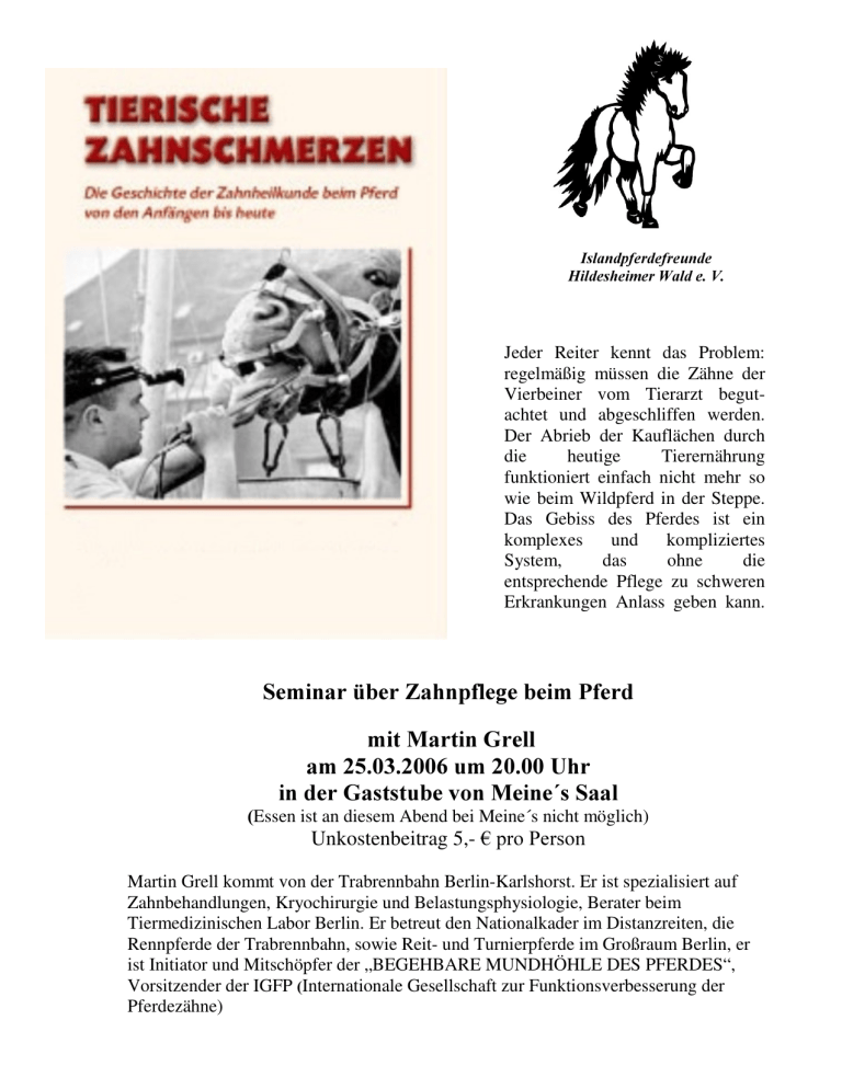 ,VODQGSIHUGHIUHXQGH +LOGHVKHLPHU:DOGH9 Jeder Reiter kennt das Problem: regelmäßig müssen die Zähne der Vierbeiner vom Tierarzt begutachtet und abgeschliffen werden. Der Abrieb der Kauflächen durch die heutige Tierernährung funktioniert einfach nicht mehr so wie beim Wildpferd in der Steppe. Das Gebiss des Pferdes ist ein komplexes und kompliziertes System, das ohne die entsprechende Pflege zu schweren Erkrankungen Anlass geben kann. 6HPLQDUEHU=DKQSIOHJHEHLP3IHUG PLW0DUWLQ*UHOO DPXP8KU LQGHU*DVWVWXEHYRQ0HLQHV6DDO Essen ist an diesem Abend bei Meine´s nicht möglich) Unkostenbeitrag 5,- ¼SUR3HUVRQ Martin Grell kommt von der Trabrennbahn Berlin-Karlshorst. Er ist spezialisiert auf Zahnbehandlungen, Kryochirurgie und Belastungsphysiologie, Berater beim Tiermedizinischen Labor Berlin. Er betreut den Nationalkader im Distanzreiten, die Rennpferde der Trabrennbahn, sowie Reit- und Turnierpferde im Großraum Berlin, er ist Initiator und Mitschöpfer der „BEGEHBARE MUNDHÖHLE DES PFERDES“, Vorsitzender der IGFP Internationale Gesellschaft zur Funktionsverbesserung der Pferdezähne) $XJXVW_ 3IHUGHJHVXQGKHLW3IHUGH]lKQH $WWUDNWLRQDXIGHU3)(5'-$*' 'LHEHJHKEDUH0DXOK|KOHHLQH]LHPOLFKJURH.ODSSH !" #$%% "&'() !* "&+ -,/.01 2* 34)5" "& 67 88% &79+ -:";% <!)% * &+)%% >=?9+; )19+219; )02!*)% *A@( )/9+219-, )94B DCAE+FG 4);)9+%0HICAJ"&B)LKMONPBG, QNR+GSTMKU,VNWWBXD)94A+JY64[Z]\_^C`] 34) + MKT<09D =;&B*?E2B% " ()9!2"=)" Uab " ?:B)<" 2) 2 1% ) 2?T)+ + "c Hd */ )1 MB )% DCT%% ")8T<"9+AJ"9 501 M+ !Ke,e9 2;`<+ DHICAJ Die 2002 gegründet e hat es sich zur Aufgabe gem acht den in Deut schland überaus st iefm üt t erlich behandelt en Bereich der Zahngesundheit von Pferden m it fest en Qualit ät sst andards nach kanadischem Vorbild zu füllen. Diese Verbesser ung beginnt m it der fundiert en Ausbildung von Pferde- Dent al- Prak t ikern, die in dieser Form bisher nur in den USA und in Kanada zu er langen war und m it einem Um denken der Pferdebesit zer . Bisher v erließ m an sich als Pferdebesit zer auf den nat ürlichen Verlauf der Dinge, was die Zähne anging. Doch so nat ürlich, w ie einst in der St eppe, geht es im Maul unserer Vierbeiner schon lange nicht m ehr zu. Es fehlt das st ändige Kauen und Mahlen auf hart en, verholzt en St ängeln und Körnern, was früher für nat ürlichen Abrieb sorgt e. Wenn unser Dr essur- Cham pion heut e t rot z sor gfält igst er Ausbildung m it dem Kopf schlägt und das Gebiss nicht annim m t , k ann m an die Ursache nicht selt en in den Zähnen finden! Die I GFP ist daher einerseit s für Fachleut e int eressant , die sich in Wochenendsem inaren auf die Zahnbehandlung von Pferden spezialisieren m öcht en. Doch der überdim ensioniert e Pferdeschädel wendet sich auch v or allem an Pferdebesit zer, denen eine schw ier ige und kom pliziert e Mat erie auf vergnügliche und int er essant e Weise näher gebracht w ird. in Berlin bem ängelt : "Die w enigst en w issen, w elche enorm e Bedeut ung die Zähne für das Wohlbefinden der Pferde und für die Reit erei haben! " . af)1 CA%% &+g4MB0 *< 4HICAJ"-9 DhB )<! Die begehbare Maulhöhle, die ein w enig an den Schädel eines Ty rannosaurus- Rex erinnert , soll das I nt eresse der Pferdebesit zer für die Zahngesundheit ihrer vier beinigen Lieblinge w ecken. Offene und blinde Wolfszähne, lose, faule Zähne, gebr ochene Zähne oder Milchzahnsplit t er, Haken und scharfe Kant en, Fehlst ellungen – all diese unschönen Dinge, die sich zum eist unerkannt hint er einem Pferdegesicht abspielen, kann m an hier besicht igen. Die Maulhöhle zeigt die Zähne eines zw eij ährigen, eines acht j ährigen und eines 24 j ährigen Pferdes nebeneinander, was den Alt erungsprozess eindrucksvoll v erdeut licht . Der int er essiert e Zahnwanderer dar f sogar m al unt er die Milchzähne linsen, w o der nachfolgende Zahn bereit s seinen Weg nach oben ant rit t . i e% Vj7. /% / -64 /9?kBG#[ Es w ar die , die das eindruck sv olle Unikat aus t rit t fest em St y ropur gest alt et e. Bei einer Tasse Tee m it Mart in Grell auf dem Biolandbauerhof und Halbblut arabergest üt der Fam ilie Wendt ent st and die I dee zu der begehbaren Maulhöhle. Nach dem St udium zahlreicher Fachbücher gelang der Malerin Rit u Wendt m it Elekt rosäge, Spezialkleber, Wandspacht el, Feinspacht el, Lack, Farben und Pinsel ein derart perfekt es Lehrst ück, dass Fot os davon w ie Abbilder eines Originalschädels aussehen. Die verw endet en Spezialm at erialien, es handelt sich um st abile aber leicht e I solierst offe aus der Baubranche, dienen der Gew icht sreduzierung. Nunm ehr br ingt das großm äulige 'Leicht gew icht ' zwar noch im m er 500 Kilo und also das Gew icht eines ausgew achsenen Pferdes auf die Waage, kann aber dennoch auf Reisen gehen, was m it Gips, Holz und St ein wohl kaum m öglich gew esen w äre. So begeist ert e das Präparat bereit s auf m ehreren Ausst ellungen Fachleut e und Laien gleicherm aßen. Spät est ens nach dem Spaziergang vorbei an hellglänzenden Jungpferdzähnen, Pr oblem zähnen und an den t äuschend echt w irkenden bräunlich verfärbt en, verform t en und w eit aus dem Kiefer ragenden alt en Zähnen w erden die Messebesucher w issen, w arum m an ein bis zw ei Mal im Jahr einen sorgfält ig ausgebildet en Dent al- Prakt ik er zu seinem Pferd rufen sollt e! Mehr I nfos zur I GFP unt er w ww .igfp- ev.de 'HUIROJHQGH$UWLNHOEHUGLHEHJHKEDUH0DXOK|KOHHUVFKLHQDP LQGHU=HLWVFKULIW&DYDOOR (LQHJURH.ODSSH 'HUYHUEOIIHQGVWH3IHUGHVFKlGHO'HXWVFKODQGVHQWVWDQGLQHLQHU6FKHXQHEHL%HUOLQ Das Ungetüm hat Zähne wie zwei geballte Männerfäuste und ein Maul, in dem ein Mensch komplett verschwindet. Es wiegt 500 Kilo, genauso viel wie ein Pferd, und es erinnert auf den ersten Blick an einen Dinosaurierschädel. Dabei ist das begehbare Maul, das vom 21. bis 25. Juli im Forum der Euro Cheval in Offenburg steht, eindeutig das Modell eines Pferdeschädels - mit dem Gebiss eines jungen Pferds auf der einen und dem deformierten Gebiss eines alten Pferds a