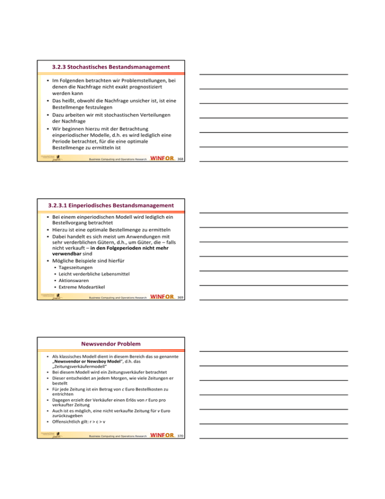 3.2.3 Stochastisches Bestandsmanagement Im Folgenden betrachten wir Problemstellungen, bei denen die Nachfrage nicht exakt prognostiziert werden kann Das heißt, obwohl die Nachfrage unsicher ist, ist eine Bestellmenge festzulegen Dazu arbeiten wir mit stochastischen Verteilungen der Nachfrage Wir beginnen hierzu mit der Betrachtung einperiodischer Modelle, d.h. es wird lediglich eine Periode betrachtet, für die eine optimale Bestellmenge zu ermitteln ist Business Computing and Operations Research 368 3.2.3.1 Einperiodisches Bestandsmanagement Bei einem einperiodischen Modell wird lediglich ein Bestellvorgang betrachtet Hierzu ist eine optimale Bestellmenge zu ermitteln Dabei handelt es sich meist um Anwendungen mit sehr verderblichen Gütern, d.h., um Güter, die – falls nicht verkauft – in den Folgeperioden nicht mehr verwendbar sind Mögliche Beispiele sind hierfür Tageszeitungen Leicht verderbliche Lebensmittel Aktionswaren Extreme Modeartikel Business Computing and Operations Research 369 Newsvendor Problem Als klassisches Modell dient in diesem Bereich das so genannte „Newsvendor or Newsboy Model“, d.h. das „Zeitungsverkäufermodell“ Bei diesem Modell wird ein Zeitungsverkäufer betrachtet Dieser entscheidet an jedem Morgen, wie viele Zeitungen er bestellt Für jede Zeitung ist ein Betrag von c Euro Bestellkosten zu entrichten Dagegen erzielt der Verkäufer einen Erlös von r Euro pro verkaufter Zeitung Auch ist es möglich, eine nicht verkaufte Zeitung für v Euro zurückzugeben Offensichtlich gilt: r > c > v Business Computing and Operations Research 370 Computer Journal at Mac‘s (vgl. Nahmias (2005)) Wir betrachten ein einfaches Beispiel Mac, Besitzer eines Zeitungskiosks bestellt jeden Sonntag das wöchentlich erscheinende Magazin „The Computer Journal“ Er bezahlt c=25 Cents für jedes Exemplar im Einkauf und veräußert es zu r=75 Cents Daneben können nicht veräußerte Exemplare für v=10 Cents zurückgegeben werden Mac möchte ein effizientes Bestandsmanagement installieren und erfasst hierzu die Häufigkeit der Nachfrage 371 Business Computing and Operations Research Nachfrage der letzten 52 Wochen Nachfrage 25 20 15 10 5 0 1 2 3 4 5 6 7 8 9 10 11 12 13 14 15 16 17 18 19 2 21 2 2 2 25 2 27 2 2 3 31 3 3 3 35 3 37 3 3 4 41 4 4 4 45 4 47 4 4 50 51 52 Tag Mittelwert der Reihe ist 11,7307692 Standardabweichung ist 4,74079246 372 Business Computing and Operations Research Resultierende Häufigkeiten Häufigkeit 7 6 5 4 3 2 1 0 0 1 2 3 4 5 6 7 8 9 10 11 12 13 14 15 16 17 18 19 20 21 22 Nachfrage Business Computing and Operations Research 373 Daten der diskreten Verteilung Nachfrage Häufigkeit f F 0 1 0,019230769 0,019230769 1 0 0 0,019230769 2 0 0 0,019230769 3 0 0 0,019230769 4 3 0,057692308 0,076923077 5 1 0,019230769 0,096153846 6 2 0,038461538 0,134615385 7 2 0,038461538 0,173076923 8 4 0,076923077 0,25 9 6 0,115384615 0,365384615 10 2 0,038461538 0,403846154 11 5 0,096153846 0,5 374 Business Computing and Operations Research Fortsetzung Nachfrage Häufigkeit f F 12 4 0,076923077 0,576923077 13 1 0,019230769 0,596153846 14 5 0,096153846 0,692307692 15 5 0,096153846 0,788461538 16 1 0,019230769 0,807692308 17 3 0,057692308 0,865384615 18 3 0,057692308 0,923076923 19 3 0,057692308 0,980769231 20 0 0 0,980769231 21 0 0 0,980769231 22 1 0,019230769 1 Business Computing and Operations Research 375 Optimale Bestellmenge Mac möchte die Bestellmenge optimieren, um sein Bestandsmanagement zu verbessern, d.h. es sind die Kosten zu minimieren, deren Höhe von der Bestellmenge beeinflusst wird Zur Findung der optimalen Bestellmenge ist zu untersuchen, welche Kosten jeweils von Fehl- oder Überschussmengen verursacht werden Diese sind dann entsprechend zu quantifizieren und in ihrer Häufigkeit zu bewerten Business Computing and Operations Research 376 Entwicklung einer Kostenfunktion Werden zu wenige Einheiten bestellt, d.h. es gibt Fehlmengen, treten die erzielbaren Erlöse als Opportunitätskosten auf. Hier gibt es einen Unterbestand und wir setzen als Unterbestandskostensatz cu an (Unit Underage Cost) Im Fall zu großer Bestellmengen ist dagegen die Differenz aus Bestellkosten und Rückgabeerlös anzusetzen. Hier gibt es einen Überbestand und wir setzen als Überbestandskostensatz co an (Unit Overage Cost) co = c − v cu = r − c Es muss gelten r > c > v Damit ergibt sich der Erwartungswert der Kosten aus der Betrachtung aller möglichen Fälle, d.h. aller möglichen Nachfragen, in Abhängigkeit der gewählten Bestellmenge S Business Computing and Operations Research 377 Übergang zur stetigen Variante Im Folgenden wollen wir uns stetigen Nachfragefunktionen zuwenden Warum? Häufig lassen sich Gesetzmäßigkeiten in diskreten Verteilungen erkennen (siehe zum Beispiel der Tests auf Normalverteilung) Dies verbessert die Analysierbarkeit der Zusammenhänge Zudem können die Instrumente der Infinitesimalrechnung genutzt werden Zunächst wird nur eine beliebige stetige Verteilung herangezogen, um allgemeine Ergebnisse erzielen zu können Business Computing and Operations Research 378 Eigenschaften der stetigen Variante Gegeben sei eine Zufallsvariable y, die für die Nachfrage steht Wir unterstellen eine beliebige stetige Nachfrageverteilung Deren Dichtefunktion f(y) gibt die Wahrscheinlichkeit dafür an, dass genau y Güter nachgefragt werden Deren Verteilungsfunktion F(y) gibt an, dass 0 bis einschließlich y Güter nachgefragt werden Falls f(y) bzw. F(y) nicht geben ist, sind Wertetabellen einsehbar Zudem unterstellen wir, dass es keine negativen Nachfragen geben kann, d.h. f(y)=0 für y<0 Beachte, dass dies keine triviale Annahme ist. Zum Beispiel lässt die Normalverteilung bei geringen Mittelwerten und (relativ hierzu) größeren Varianzen durchaus positive Wahrscheinlichkeiten für negative Nachfragemengen zu Darüber hinaus werden aber keine weitere Annahmen an den genauen Verlauf der Nachfrageverteilung gestellt Business Computing and Operations Research 3
