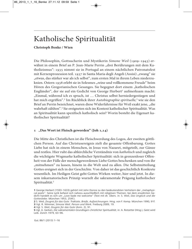 86_2013_1_1_16_Benke 27.11.12 09:59 Seite 1 Katholische Spiritualität Christoph Benke / Wien Die Philosophin, Gottsucherin und Mystikerin Simone Weil (1909–1943) erwähnt in einem Brief an P. Jean-Marie Perrin „drei Berührungen mit dem Katholizismus“: 1935 nimmt sie in Portugal an einem nächtlichen Patronatsfest mit Kerzenprozession teil. 1937 in Santa Maria degli Angeli (Assisi) „zwang“ sie „etwas, das stärker war als ich selbst“, zum ersten Mal in ihrem Leben niederzuknien. Ostern 1938 erlebt sie in Solesmes „reine und vollkommene Freude“ beim Hören des Gregorianischen Gesanges. Sie begegnet dort einem „katholischen Engländer“, der sie auf ein Gedicht von George Herbert1 aufmerksam macht: „Einmal, während ich es sprach, ist … Christus selbst herniedergestiegen und hat mich ergriffen“.2 Im Rückblick ihrer Autobiographie spirituelle,3 wie sie den Brief an Perrin bezeichnet, waren diese Widerfahrnisse für Weil exakt jene, „die wahrhaft zählten“.4 Sie ereigneten sich im Kontext katholischer Spiritualität. Was an Spiritualität kann spezifisch katholisch sein? Worin besteht die Eigenart katholischer Spiritualität? 1 „Das Wort ist Fleisch geworden“ (Joh 1,14) Die Mitte des Christlichen ist die Fleischwerdung des Logos, der zweiten göttlichen Person. Auf das Christusereignis zielt die gesamte Offenbarung. Gottes Liebe hat sich in einem Menschen, in Jesus von Nazaret, mitgeteilt, zur Gänze und restlos. Hier ruht das altkirchliche Verständnis von katholisch und zugleich die wichtigste Wegmarke katholischer Spiritualität: sich in grenzenloser Offenheit von der Fülle der menschgewordenen Liebe Gottes beschenken und von ihr „mitnehmen“ zu lassen, hinein in die Welt und zu allen. Die Selbstmitteilung Gottes ereignet sich in der Geschichte. Von daher ist das geschichtlich Konkrete wesentlich. Im Heiligen Geist geht Gottes Wirken weiter, hier und jetzt. In diesem inkarnatorischen Prinzip wurzelt die sakramentale Prägung katholischer Spiritualität.5 1 George Herbert (1593–1633) gehört mit John Donne zu den bedeutendsten Vertretern der „metaphysical poets“. Seine Lyrik befasst sich nahezu ausschließlich mit religiösen Themen; bei dem erwähnten Gedicht handelt es sich um „Love bade me welcome“ (Text mit dt. Übers. in: S. Weil, Das Unglück und die Gottesliebe. München 1953, 254f.). 2 S. Weil, Zeugnis für das Gute. Traktate, Briefe, Aufzeichnungen. Hrsg. von F. Kemp. München 1990, 91f. 3 Vgl. R. Wimmer, Simone Weil. Person und Werk. Freiburg 2009, 19. 4 Vgl. S. Weil, Zeugnis für das Gute (Anm. 2), 91. 5 Vgl. A. Gerken, Die sakramentalen Grundlagen christlicher Spiritualität, in: A. Rotzetter (Hrsg.), Geist wird Leib. Zürich 1979, 63–96. GuL 86/1 (2013) 1–16 86_2013_1_1_16_Benke 27.11.12 09:59 Seite 2 2 Christoph Benke Christentum ist kein Rückzug aus dieser Welt: „Religion ist Welt, die Richtung auf Gott einschlägt; Christentum ist Gott, der Richtung auf Welt einschlägt, und Menschen, die, ihm glaubend, seiner Richtung folgen. Katholizismus ist jenes Christentum, das den ganzen Gott im vollen Ernst diese Richtung bis zum bittern und schließlich seligen Ende abschreiten läß.“6 Da „das Fleisch die Drehachse des Heils“ wurde (Tertullian, † um 220), ist sichtbare Verleiblichung jener Weg, wie das Heil im Irdischen gegenwärtig wird: „Geist in Leib.“ Katholische Spiritualität hat einen sakramentalen Zug. Der in Jesus Christus Mensch gewordene und im Heiligen Geist Heil schaffende Gott vermittelt sich in sichtbaren Zeichen – im Sakrament, in den klassischen Symbolen der Tradition, im Raum der Kirche. Spiritualität entsteht, wo sich jemand diese objektive Lehre in ihrer spirituellen Bedeutung persönlich aneignet. Die Wege, den Glauben zu verstehen und zu praktizieren, sind naturgemäß so zahlreich wie unterschiedlich, bezogen auf Kultur, Temperament, religiöse Entwicklung etc. Das ist mit ein Grund für die Vielfalt katholischer Spiritualitäten. Sie finden ihre Mitte und ihr Korrektiv im einen Weg der Offenbarung Gottes im Wort, das Jesus Christus ist, vermittelt in Schrift und Tradition, Symbol und Sakrament. Katholische Spiritualität bietet Raum für persönliche Erfahrung, ist also sensibel für spirituelle Vielfalt. „Der Heilige Geist ist Beziehung“ und Beziehung „ist nur da, wo die Andersheit des Anderen anerkannt wird.“7 Der Heilige Geist ist aber auch Wahrung der Differenz. Pfingsten ist das Ereignis von Katholizität. Katholische Spiritualität besteht auf der Notwendigkeit, den je eigenen Weg mit der größeren Gemeinschaft der Kirche und mit der Objektivität der Lehre auszubalancieren und anzureichern. Hier, in dieser Suche nach Balance, setzt „das Katholische“ an: die Kraft zur Synthese und das Wissen, dass Mitte und Rand, der oder die Einzelne und das Ganze zusammengehören. Das zielt nicht auf Uniformität. Uniformität ist das Gegenteil von Katholizität. Was „römisch“ ist, muss längst nicht katholisch sein. Katholisch ist die Bereitschaft, das Eigene dem Anderen auszusetzen, die Bereitschaft, sich mitzuteilen: „‚Katholisch‘ ist die Kirche erst, wenn jeder einzelne in ihr das Eigene für das Ganze öffnet; wenn er mitteilt, was er verstanden hat …; wenn er mitteilt, was er empfangen hat. Das Gegenteil von ‚katholisch‘ ist nicht ‚evangelisch‘, sondern ‚häretisch‘.“8 6 H.U. von Balthasar, Katholisch. Aspekte des Mysteriums. Einsiedeln 1975, 77. 7 Vgl. K.-H. Menke, Handelt Gott, wenn ich ihn bitte? Regensburg 2000, 180. 8 Vgl. aaO., 179. 86_2013_1_1_16_Benke 27.11.12 09:59 Seite 3 Katholische Spiritualität 3 2 „Jedes Ereignis des Lebens heiligen“ Die Fleischwerdung des Logos und Katholizität sind aufeinander bezogen. Das hatten die Väter des II. Vaticanums im Blick, als sie formulierten: „Denn er, der Sohn Gottes, hat sich in seiner Menschwerdung gewissermaßen mit jedem Menschen vereinigt.“9 Menschwerdung bedeutet Annahme und Erlösung 