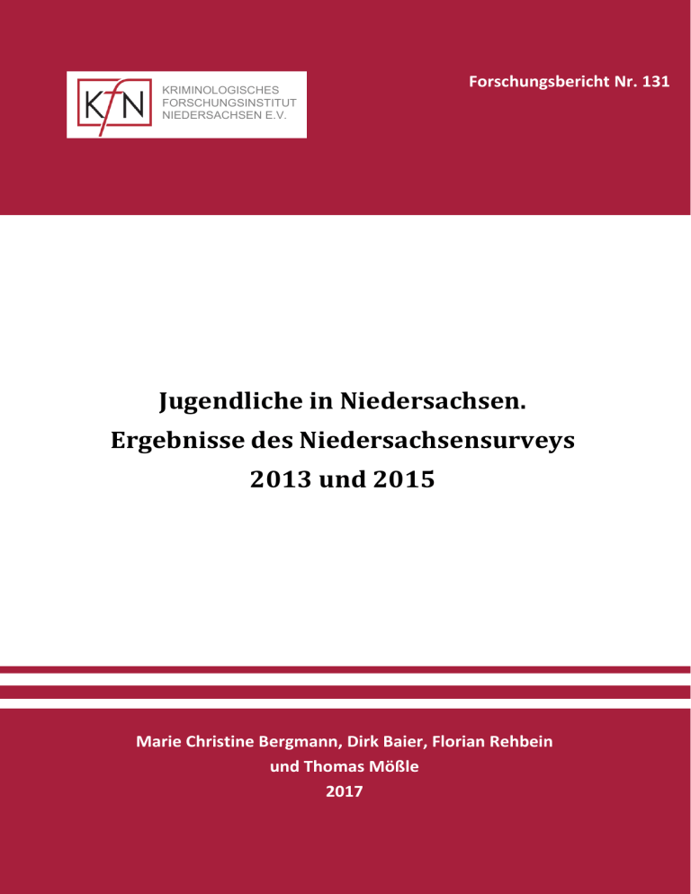 KRIMINOLOGISCHES FORSCHUNGSINSTITUT NIEDERSACHSEN E.V. Forschungsbericht Nr. 131 Jugendliche in Niedersachsen. Ergebnisse des Niedersachsensurveys 2013 und 2015 Marie Christine Bergmann, Dirk Baier, Florian Rehbein und Thomas Mößle 2017 FORSCHUNGSBERICHT Nr. 131 Jugendliche in Niedersachsen. Ergebnisse des Niedersachsensurveys 2013 und 2015 Marie Christine Bergmann, Dirk Baier, Florian Rehbein und Thomas Mößle 2017 Kriminologisches Forschungsinstitut Niedersachsen e.V. (KFN) Lützerodestraße 9, 30161 Hannover Tel. (05 11) 3 48 36-0, Fax (05 11) 3 48 36-10 E-Mail: kfn@kfn.de Inhaltsverzeichnis Inhaltsverzeichnis Zusammenfassung................................................................................................................................... 1 1. 2. Einleitung ......................................................................................................................................... 5 1.1. Der Niedersachsensurvey ...................................................................................................... 5 1.2. Jugendkriminalität in Niedersachsen im polizeilichen Hellfeld ............................................. 8 1.3. Danksagung ......................................................................................................................... 10 Methode und Stichprobenbeschreibung ...................................................................................... 12 2.1. 2.1.1 Rücklauf 2013 ................................................................................................................ 16 2.1.2 Rücklauf 2015 ................................................................................................................ 18 2.1.3 Regionale Verteilung ..................................................................................................... 20 2.2. Stichprobenbeschreibung ............................................................................................. 23 2.2.2 Exkurs: Stand der Integration von Migranten ............................................................... 26 Die Lehrkräftestichprobe..................................................................................................... 39 Delinquentes Verhalten in Opfer- und Täterperspektive.............................................................. 42 3.1. Gewaltdelikte ...................................................................................................................... 42 3.1.1 Opferschaften ................................................................................................................ 42 3.1.2 Täterschaften................................................................................................................. 47 3.2. Eigentumsdelikte ................................................................................................................. 50 3.2.1 Opferschaften ................................................................................................................ 50 3.2.2 Täterschaften................................................................................................................. 51 3.3. 4. Die Schülerstichprobe ......................................................................................................... 23 2.2.1 2.3. 3. Methodische Vorgehensweisen und Rücklauf .................................................................... 12 Mitführen von Waffen......................................................................................................... 55 Gewalterfahrungen in der Schule ................................................................................................. 59 4.1. Mobbing in der Schule und Cyberbullying .......................................................................... 59 4.2. Lehrkräfte als Opfer............................................................................................................. 65 5. Alkohol- und Drogenkonsum ......................................................................................................... 68 6. Politische Einstellungen und Verhaltensweisen............................................................................ 73 7. 6.1. Linksextremismus ................................................................................................................ 73 6.2. Rechtsextremismus ............................................................................................................. 78 6.3. Islamischer Extremismus ..................................................................................................... 87 6.4. Vertrauen und Strafeinstellungen ....................................................................................... 91 6.4.1 Zwischenmenschliches Vertrauen ................................................................................. 91 6.4.2 Vertrauen in die Polizei ................................................................................................. 93 6.4.3 Strafeinstellungen ......................................................................................................... 97 Psychisches Befinden .................................................................................................................. 102 7.1. Lebenszufriedenheit .......................................................................................................... 102 7.2. Wohlbefinden und Selbstwert .......................................................................................... 104 I Inhaltsverzeichnis 7.3. Empathie und Prosozialität ............................................................................................... 106 7.4. Risikosuche, Gewaltaffinität und Männlichkeitsnormen .................................................. 109 7.5. Selbstverletzendes Verhalten............................................................................................ 113 8. Familiäre Erfahrungen .......