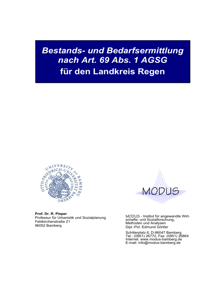 Bestands- und Bedarfsermittlung nach Art. 69 Abs. 1 AGSG für den Landkreis Regen Prof. Dr. R. Pieper Professur für Urbanistik und Sozialplanung Feldkirchenstraße 21 96052 Bamberg MODUS - Institut für angewandte Wirtschafts- und Sozialforschung, Methoden und Analysen Dipl.-Pol. Edmund Görtler Schillerplatz 6, D-96047 Bamberg Tel.: (0951) 26772, Fax: (0951) 26864 Internet: www.modus-bamberg.de E-mail: info@modus-bamberg.de Auftraggeber: Landkreis Regen Projektleitung: Prof. Dr. R. Pieper Universität Bamberg Dipl.-Pol. Edmund Görtler MODUS Sozialforschung Verfasser: Dipl.-Soz. Manfred Zehe und Dipl.-Pol. Edmund Görtler Unter Mitarbeit von: M.A. Ute Schullan und M.A. Philipp Albrecht Hinweis: Aus Gründen der besseren Lesbarkeit wurde weitgehend auf eine Differenzierung der beiden Geschlechter verzichtet, ohne dass damit eine Diskriminierung von Frauen verbunden ist. I MODUS-Institut Bamberg: Bedarfsermittlung nach Art. 69 AGSG für den Landkreis Regen Inhaltsverzeichnis Seite 1. 1.1 1.2 Einleitung ................................................................................................ 1 Gesetzliche Grundlagen zur Bedarfsermittlung ......................................... 1 Methodisches Vorgehen bei der Bedarfsermittlung ................................... 2 2. Bestandsaufnahme der Seniorenhilfe im Landkreis Regen ................ 4 2.1 2.1.1 2.1.2 2.1.3 2.1.3.1 2.1.3.2 2.1.4 Bestandsaufnahme der ambulanten Pflege ......................................... Bestand an ambulanten Pflegediensten ................................................... Personalstruktur der ambulanten Pflegedienste ........................................ Betreutenstruktur der ambulanten Pflegedienste ...................................... Alters- und Geschlechterstruktur der Betreuten ......................................... Gesundheitszustand der Betreuten nach Pflegestufen .............................. Refinanzierung der ambulanten Pflegedienste ......................................... 2.2 2.2.1 Bestandsaufnahme der teilstationären Pflege ................................... 11 Vorbemerkung ........................................................................................ 11 2.2.2 2.2.2.1 2.2.2.2 2.2.2.3 Bestandsaufnahme der Tagespflege .................................................. Vorbemerkung zur Organisationsstruktur der Tagespflege ..................... Bestand und Planungen an Tagespflegeplätzen im Landkreis Regen ...................................................................................................... Auslastung der bestehenden Tagespflegeplätze ..................................... 14 14 2.2.3 2.2.3.1 2.2.3.2 2.2.3.3 2.2.3.4 Bestandsaufnahme der Kurzzeitpflege ................................................ Vorbemerkung zur Organisationsstruktur im Bereich der Kurzzeitpflege. Bestand im Bereich der Kurzzeitpflege .................................................... Auslastung der bestehenden Kurzzeitpflegeplätze .................................. Nutzungsdauer der bestehenden Kurzzeitpflegeplätze ........................... 18 18 19 19 21 2.3 2.3.1 2.3.2 2.3.3 2.3.4 2.3.4.1 2.3.4.2 2.3.4.3 Bestandsaufnahme der vollstationären Pflege .................................. Bestand an stationären Heimplätzen ...................................................... Zukünftige Bestandsentwicklung im Bereich der stationären Pflege........ Belegungsquote der Pflegeplätze ............................................................ Bewohnerstruktur..................................................................................... Geschlechter- und Altersstruktur der Pflegeheimbewohner ..................... Gesundheitszustand der Pflegeheimbewohner ....................................... Regionale Herkunft der Pflegeheimbewohner ......................................... 22 22 24 25 26 26 27 28 3. 3.1 Demographische Entwicklung ............................................................. 29 Vorbemerkung ........................................................................................ 29 3.2 Methode ................................................................................................. 29 3.3 Datengrundlage .................................................................................... 30 4 4 6 7 7 8 9 13 13 MODUS-Institut Bamberg: Bedarfsermittlung nach Art. 69 AGSG für den Landkreis Regen II 3.4 3.4.1 3.4.2 3.4.3 Ergebnisse ............................................................................................ Ausgangsbasis der Bevölkerungsprojektion ........................................... Ergebnisse der Bevölkerungsprojektion bis zum Jahr 2035 .................... Zusammenfassung der Ergebnisse der Bevölkerungsprojektion ............. 4. Entwicklung der pflegebedürftigen älteren Menschen .................... 38 Vorbemerkung ......................................................................................... 38 4.1 31 31 32 37 4.2 Entwicklung der pflegebedürftigen älteren Menschen im Landkreis Regen ...................................................................................................... 38 5. Bedarfsermittlung und Bedarfsprognose ........................................... 41 5.1 5.1.1 5.1.2 5.1.3 5.1.4 Bedarfsermittlung für den Bereich der ambulanten Pflege .............. Vorbemerkung ........................................................................................ Ermittlung des Bedarfs an gelernten Pflegekräften im Landkreis Regen . Ist-Soll-Vergleich für den Bereich der ambulanten Pflege im Landkreis Regen ................................................................................. Bedarfsprognose für den Bereich der ambulanten Pflege ....................... 5.2 Bedarfsermittlung für den Bereich der teilstationären Pflege ........... 51 5.2.1 5.2.1.1 5.2.1.2 5.2.1.3 Bedarfsermittlung für den Bereich der Tagespflege .......................... Ermittlung des Bedarfs an Tagespflegeplätzen 