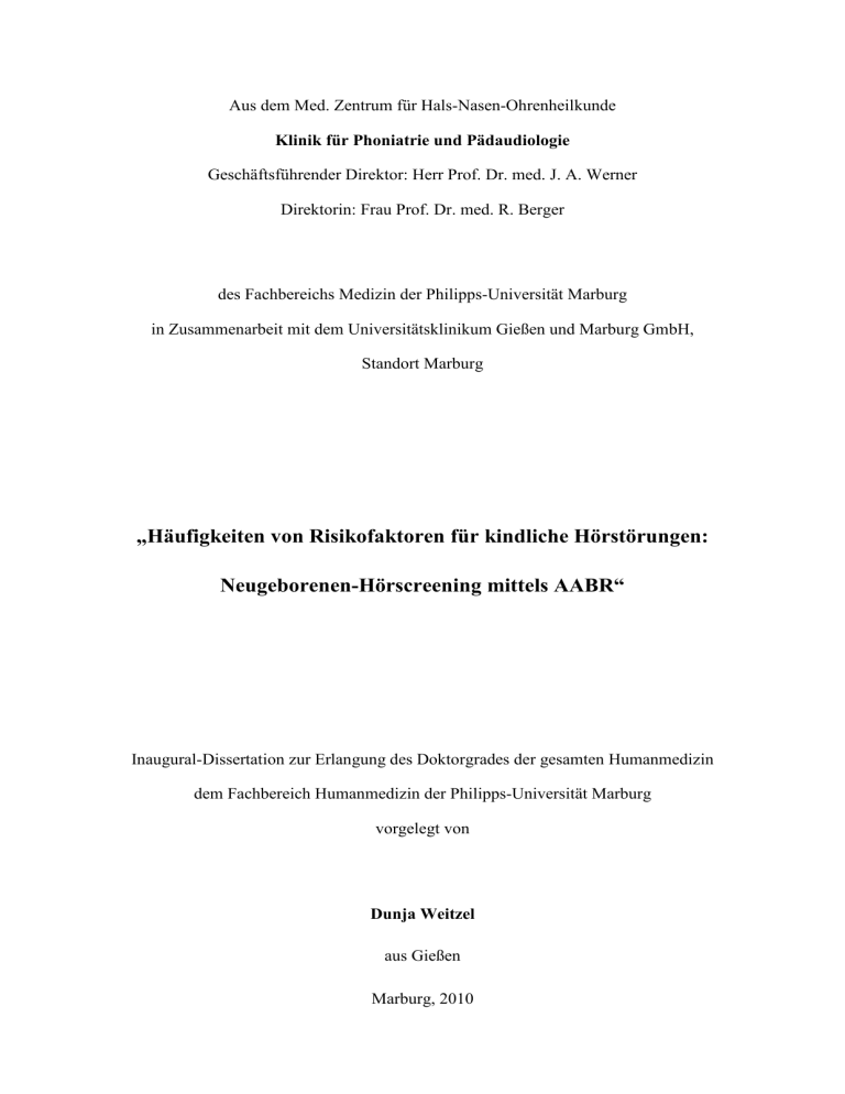 Aus dem Med. Zentrum für Hals-Nasen-Ohrenheilkunde Klinik für Phoniatrie und Pädaudiologie Geschäftsführender Direktor: Herr Prof. Dr. med. J. A. Werner Direktorin: Frau Prof. Dr. med. R. Berger des Fachbereichs Medizin der Philipps-Universität Marburg in Zusammenarbeit mit dem Universitätsklinikum Gießen und Marburg GmbH, Standort Marburg „Häufigkeiten von Risikofaktoren für kindliche Hörstörungen: Neugeborenen-Hörscreening mittels AABR“ Inaugural-Dissertation zur Erlangung des Doktorgrades der gesamten Humanmedizin dem Fachbereich Humanmedizin der Philipps-Universität Marburg vorgelegt von Dunja Weitzel aus Gießen Marburg, 2010 Angenommen vom Fachbereich Medizin der Philipps-Universität Marburg am 02.09.2010. Gedruckt mit Genehmigung des Fachbereichs Dekan: Herr Prof. Dr. med. Matthias Rothmund Referent: Frau Prof. Dr. med. Roswitha Berger Korreferent: Herr Prof. Dr. med. Peter Czekelius 2. Korreferent: Herr Prof. Dr. med. Christian Jackisch Meinen Eltern Inhaltsverzeichnis INHALTSVERZEICHNIS ........................................................................................................................ I ABKÜRZUNGSVERZEICHNIS ........................................................................................................... III 1 EINLEITUNG..................................................................................................................................1 1.1 Bedeutung des Neugeborenen-Hörscreenings...........................................................................1 1.2 Zielsetzung der Arbeit ...............................................................................................................2 2 EINFÜHRUNG IN DIE GRUNDLAGEN.....................................................................................5 2.1 Das menschliche Hörsystem .....................................................................................................5 2.2 Kindliche Hörstörungen ..........................................................................................................22 2.3 Diagnostik kindlicher Hörstörungen im ersten Lebensjahr .....................................................29 3 MATERIAL UND METHODE ....................................................................................................39 3.1 Untersuchungszeitraum ...........................................................................................................39 3.2 Auswahl der Probanden ..........................................................................................................39 3.3 Aufklärung ..............................................................................................................................41 3.4 Untersuchungszeitpunkt ..........................................................................................................41 3.5 Untersuchungsablauf ...............................................................................................................41 3.6 Messgerät: MB 11 mit BERAphon® ......................................................................................43 3.7 Follow up ................................................................................................................................46 4 ERGEBNISSE................................................................................................................................48 4.1 Analyse des Neugeborenenkollektivs......................................................................................48 4.2 Hörscreening ...........................................................................................................................63 4.3 Analyse der auffälligen Kinder ...............................................................................................64 5 DISKUSSION.................................................................................................................................75 5.1 Durchführung des Neugeborenen-Hörscreenings....................................................................75 5.2 Aufschlüsselung von Risikofaktoren.......................................................................................75 5.3 Blutungen in der Schwangerschaft..........................................................................................78 5.4 Infektionen in der Schwangerschaft ........................................................................................79 5.5 Medikamentöse Therapie in der Schwangerschaft ..................................................................85 5.6 Unfälle in der Schwangerschaft ..............................................................................................91 5.7 Geburtsmodus .........................................................................................................................92 I 5.8 Frühgeburtlichkeit und niedriges Geburtsgewicht ..................................................................93 5.9 Perinatale Asphyxie und Apgar-Werte....................................................................................95 5.10 Atemnotsyndrom und maschinelle Beatmung.........................................................................97 5.11 Peri- und intraventrikuläre Blutungen .....................................................................................99 5.12 Hyperbilirubinämie ...............................................................................................................100 5.13 Prä- und postnatale Infektionen der Kinder...........................................................................101 5.14 Medikamentöse Therapie der Kinder ....................................................................................103 5.15 Neurologische Auffälligkeiten ..............................................................................................104 5.16 Lippen-Kiefer-Gaumenspalten (LKG-Spalten) .......................................
