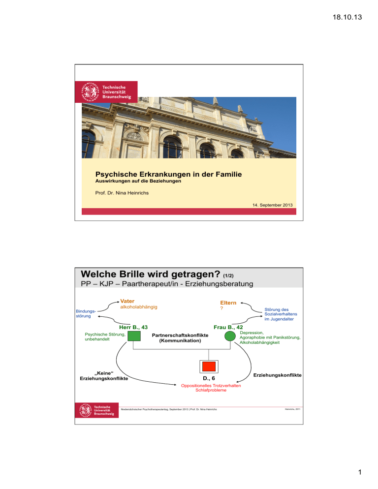 18.10.13 Platzhalter für Bild, Bild auf Titelfolie hinter das Logo einsetzen Psychische Erkrankungen in der Familie Auswirkungen auf die Beziehungen Prof. Dr. Nina Heinrichs 14. September 2013 Welche Brille wird getragen? (1/2) PP – KJP – Paartherapeut/in - Erziehungsberatung Vater Bindungsstörung Eltern alkoholabhängig ? Herr B., 43 Psychische Störung, unbehandelt „Keine“ Erziehungskonflikte Störung des Sozialverhaltens im Jugendalter Frau B., 42 Partnerschaftskonflikte (Kommunikation) Depression, Agoraphobie mit Panikstörung, Alkoholabhängigkeit D., 6 Erziehungskonflikte Oppositionelles Trotzverhalten Schlafprobleme Niedersächsischer Psychotherapeutentag, September 2013 | Prof. Dr. Nina Heinrichs Heinrichs, 2011 1 18.10.13 Welche relevanten Beziehungen gibt es? Großeltern Mu+er Vater Kind Kind 2 Niedersächsischer Psychotherapeutentag, September 2013 | Prof. Dr. Nina Heinrichs Feinberg, 2011 Wie viele Familien sind mit psychischen Krankheiten konfrontiert? 2 18.10.13 Häufigkeit psychischer Erkrankung im letzten Jahr (Allgemeinbevölkerung) Angsterkrankungen Jedes Jahr 33% der erwachsenen Bevölkerung (jeder 3. Erwachsene) 14,0 Alkoholerkrankungen 9,5 Depression 6,9 Demenz 5,4 ADHS 5,0 4,9 Somatoforme Störung Posttraumatische Belastungsstörung 2,4 Psychotische Erkrankungen 2,4 0 2 4 6 8 10 Häufigkeit in % Angsterkrankungen 14 16 14 16 10,0 Störungen des Sozialverhaltens Bei Kindern & Jugendlichen: ca. 18% (jedes 6. Kind) 12 7,6 Depression 5,4 ADHS 2,2 0 2 4 6 8 10 12 Häufigkeit in % Niedersächsischer Psychotherapeutentag, September 2013 | Prof. Dr. Nina Heinrichs Quellen: Erwachsene: Wittchen et al., 2012/2013 – DEGS Kinder und Jugendliche: Ravens-Sieberer et al. (2008): Eur Child Adolesc Psychiatry. 2008,17 Suppl 1:148-56 Barkmann & Schulte-Markwort (2012), J Epidemiol Community Health. 2012, 66(3):194-203. . Angaben von Eltern zu psychischer Krankheit in der Herkunftsfamilie (Inanspruchnahmepopulation) in Prozent psychisch kranke Angehörige (1. Grades) 70 körperlich kranke Angehörige (1. Grades) 60 unbekannt 50 (Suizide) 40 30 20 10 0 psychisch kranke Angehörige (1. Grades) körperlich kranke Angehörige (1. Grades) unbekannt (Suizide) (70% der Kinder, die vorgestellt werden, haben Geschwister!) Niedersächsischer Psychotherapeutentag, September 2013 | Prof. Dr. Nina Heinrichs Quellen: Inanspruchnahmepopulation von Familien, die Hilfe wegen psychischer Beschwerden ihres Kindes suchten (N=357 Familien); Wenglorz & Heinrichs, 2013 3 18.10.13 Wie kann sich eine psychische Krankheit auf familiäre Beziehungen auswirken? Erwachsene sind oft auch Eltern, und meist auch Partner! Partnerschaft Symptome des Partners (z.B. Rückzug) Minderung der eigenen Partnerschaftszufriedenheit mehr Kritik und Feindseligkeit Eltern-Kind Beziehung mehr Stress (mehr) Psychopathologie und Unzufriedenheit mehr Kritik und Feindseligkeit weniger gegenseitige Unterstützung in der Erziehung mehr Probleme in der Erziehung Niedersächsischer Psychotherapeutentag, September 2013 | Prof. Dr. Nina Heinrichs Heinrichs, 2013; modifiziert nach Whisman & Baucom, 2012, Clinical Child and Family Psychology Review 4 18.10.13 Beispiel 1: Psychische Erkrankung eines Elternteils Auswirkungen auf die Kinder zusammen mit Dipl.-Psych. Julia Griepenstroh und PD Dr. Thomas Beblo/Prof. Dr. Martin Driessen, Klinik für Psychiatrie und Psychotherapie Bethel Teufelskreis „psychische Erkrankung“? • Kinder psychisch kranker Eltern: erhöhtes Risiko, später selbst psychische Auffälligkeiten zu entwickeln • Wie nimmt die psychische Erkrankung Einfluss? (1) emotionales Klima in der Familie (Kritik, Feindseligkeit, Überinvolvierung) à Expressed Emotion (2) Übernahme von unangemessener Rolle des Kindes in der ElternKind Beziehung à Parentifizierung • Erfassung des familiären Klimas in Familien mit einem psychisch erkrankten Elternteil mit dem Five Minute Speech Sample (FMSS) Niedersächsischer Psychotherapeutentag, September 2013 | Prof. Dr. Nina Heinrichs 5 18.10.13 Five Minute Speech Sample (FMSS): Ziele der Studie • Einbezug von Eltern- und Kindperspektive • Vergleich mit einer Stichprobe von Familien mit psychisch gesunden Elternteilen • 113 Eltern-Kind Dyaden (davon 61 mit psychisch krankem Elternteil) § 48 Jungen/65 Mädchen, im Mittel 10,5 Jahre alt § Eltern im Mittel 41 Jahre, 65% verheiratet/in Partnerschaft § 90% Affektive Störungen, 10% psychotische Störungen § 69% mit komorbiden Störungen Niedersächsischer Psychotherapeutentag, September 2013 | Prof. Dr. Nina Heinrichs Five Minute Speech Sample (FMSS) Sprechprobe der Eltern Prävalenz von EE (über alle Familien hinweg): 44% hochkritisch 1% überinvolviert Low-EE High-EE Kritik 70 (Elternsicht) Prozent der Eltern 60 50 40 Chi2 (1): 4,5 p < .05 30 20 10 0 Psychisch erkrankte Elternteile (EG) Psychisch gesunde Elternteile (KG) Niedersächsischer Psychotherapeutentag, September 2013 | Prof. Dr. Nina Heinrichs Griepenstroh, Beblo, Driessen & Heinrichs, submitted 6 18.10.13 Five Minute Speech Sample (FMSS) Sprechprobe der Kinder Low-EE High-EE Kritik Prozent der Familie (Kindersicht) 90 80 70 60 50 40 30 20 10 0 Kinder von psychisch erkranktem Elternteil Kinder von psychisch gesundem Elternteil Niedersächsischer Psychotherapeutentag, September 2013 | Prof. Dr. Nina Heinrichs Chi2 (1): 0,46 p = .50 Griepenstroh, Beblo, Driessen & Heinrichs, submitted Und was ist mit dem Erziehungsverhalten? • Häufige Vermutungen: § Psychische Störungen äußern sich symptomatisch, die Symptome verursachen ungünstigeres Erziehungsverhalten à (temporäre) Unfähigkeit, auf die Bedürfnisse des Kindes angemessen einzugehen § Eine psychische Störung bedingt einen Mangel an Ressourcen für Erziehungsprozesse, da die Herausforderung durch die Erkrankung, bereits alle Ressourcen benötigt à Überforderung in Erziehung Niedersächsischer Psychotherapeutentag, September 2013 | Prof. Dr. Nina Heinrichs Griepenstroh, Beblo, Driessen & Heinrichs,