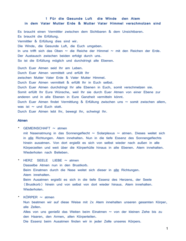 1 Für die Gesunde Luft die Winde den Atem in dem Vater Mutter Erde & Mutter Vater Himmel verschmolzen sind Es braucht einen Vermittler zwischen dem Sichtbaren & dem Unsichtbaren. Es braucht die Erfüllung. Vermittler & Erfüllung dies sind wir. Die Winde, die Gesunde Luft, die Euch umgeben. In uns trifft sich das Oben ~ die Reiche der Himmel ~ mit den Reichen der Erde. Der Austausch zwischen beiden erfolgt durch uns. So ist die Erfüllung möglich und durchdringt alle Ebenen. Durch Euer Atmen seid Ihr am Leben. Durch Euer Atmen vermittelt und erfüllt Ihr zwischen Mutter Vater Erde & Vater Mutter Himmel. Durch Euer Atmen vermittelt & erfüllt Ihr in Euch selbst. Durch Euer Atmen durchdringt Ihr alle Ebenen in Euch, somit verschmelzen sie. Somit erfüllt Ihr Eure Wünsche, weil Ihr sie durch Euer Atmen von einer Ebene zur anderen und in alle Ebenen in Eure Ganzheit vermitteln könnt. Durch Euer Atmen findet Vermittlung & Erfüllung zwischen uns ~ somit zwischen allem, was ist ~ und Euch statt. Durch Euer Atmen lebt Ihr, bewegt Ihr, schwingt Ihr. Atmen ¬ GEMEINSCHAFT ~ atmen mit Nasenatmung in das Sonnengeflecht ~ Solarplexus ~ atmen. Dieses weitet sich in alle Richtungen. Atem innehalten. Nun in die tiefe Essenz des Sonnengeflechts hinein ausatmen. Von dort ergießt es sich von selbst wieder nach außen in alle Körperzellen und weit über die Körperhülle hinaus in alle Ebenen. Atem innehalten. Wiederholen nach Belieben. ¬ HERZ SEELE LIEBE ~ atmen Dasselbe Atmen nun in den Brustkorb. Beim Einatmen durch die Nase weitet sich dieser in alle Richtungen. Atem innehalten. Beim Ausatmen ergießt es sich in die tiefe Essenz des Herzens, der Seele (Brustkorb) hinein und von selbst von dort wieder hinaus. Atem innehalten. Wiederholen. ¬ KÖRPER ~ atmen Nun beatmen wir auf diese Weise mit 2x Atem innehalten unseren gesamten Körper, alle Zellen. Alles von uns genießt das Weiten beim Einatmen ~ von der kleinen Zehe bis zu den Haaren, den Armen, allen Körperteilen. Die Essenz beim Ausatmen finden wir in jeder Zelle unseres Körpers. 1 ¬ KRISTALL ~ Körperpunkte atmen Derselbe Atemablauf mit 2x Atem innehalten ~ beim Einatmen ist unsere Aufmerksamkeit kurz und mit Leichtigkeit bei « Nieren & Iliosakralgelenk, Beckengelenke unter den Nieren als 2 Grübchen erkennbar « Augenpunkt zwischen den Augenbrauen « Knie (auch innen, außen, hinten) « Fußknöchel (innen und außen) Die Essenz beim Ausatmen finden wir vor allem in einer Linie, die diagonal vom Augenpunkt vorne zu den Nieren & Beckengelenken hinten durch unseren Körper strahlt. Von dort ergießt es sich von selbst weiter. Diese Körperpunkte sind Zugänge zur Aktivierung unserer Kristallebene. Die kurze, leichte Hinwendung zu diesen Punkten und das Beatmen verbindet sie miteinander, erschafft eine Schwingungsbahn unserer Kristallebene. Unser Kristall Ich durchdringt uns als Ganzes, ist überall in uns angelegt. Die Schwingungen, die nun Vater Mutter Erde erfahren und somit auch wir, erlauben die Aktivierung und das Leben, Erleben, dieses Kristalls in uns. Es ist eine komplett neue Ausrichtung, mit der wir neu geboren werden in unserem jetzigen Körper. Das Kristall Ich ist die direkte Anbindung an die 1. Seele. ¬ SCHÖPFERKRAFT ~ Körperpunkte atmen Dieselbe Atemabfolge mit 2x Atem innehalten. Dabei beatmen wir ein Quadrat, das sich auf unserem Rücken von den Schultern abwärts befindet ~ hinterer Herzraum ~ und die Wirbelsäule, die sich als Stab über den Atlas in unser Gehirn und von dort aus unserem Kopf hinaus fortsetzt. Ebenso verlängert sie sich senkrecht über das Steißbein nach unten. Diese Zentren in uns verbunden richten unsere Sexualkraft und somit unsere Schöpferkraft neu aus. Aus der Herzenskraft heraus, der Liebe, erschaffen wir. Hier fließt auch die Heilkraft. So erschaffen wir Gesundsein. Diese 5 Atemübungen in der vorgegebenen Abfolge! atmen oder eine einzelne Atemübung wählen und diese wiederholen. Die Körperhaltung ist, stehend oder sitzend, aufrecht – elastisch, mit lockeren Schultern und beiden Fußsohlen am Boden bei hüftbreiter Beinstellung. Die Knie im Stand nicht durchstrecken. Die „Atem-Meditation“ nach Belieben sanft, dem Rhythmus des eigenen Körpers folgend, wiederholen und anschließend in angenehmer Körperhaltung nachwirken lassen! Geschehen lassen, beobachten – Bilder, die auftauchen, Farben, Gefühle, Körperempfinden, Gedanken. Auch ein „Nichts-Wahrnehmen“ ist Zeichen tiefer Wirkung. Danach den gesamten Körper langsam dehnen und strecken, um aus der Meditation nicht abrupt auszusteigen. Maria Loise Semler www.klang-in-balanc e.com 2