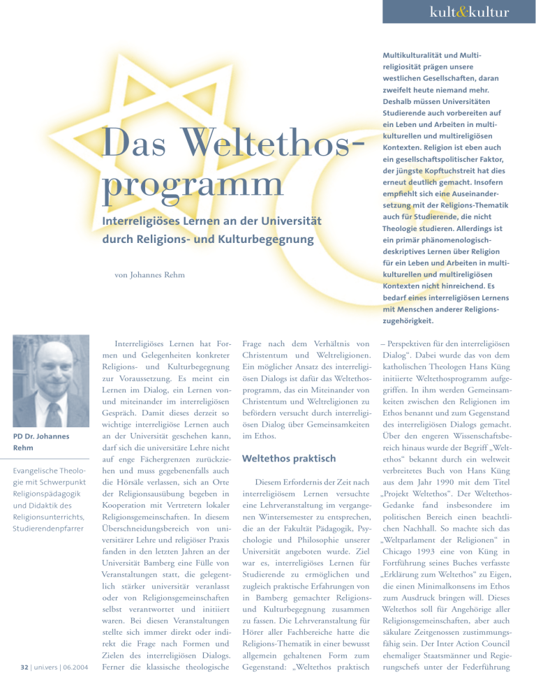 kult&kultur Multikulturalität und Multireligiosität prägen unsere westlichen Gesellschaften, daran zweifelt heute niemand mehr. Deshalb müssen Universitäten Studierende auch vorbereiten auf Das Weltethosprogramm Interreligiöses Lernen an der Universität durch Religions- und Kulturbegegnung ein Leben und Arbeiten in multikulturellen und multireligiösen Kontexten. Religion ist eben auch ein gesellschaftspolitischer Faktor, der jüngste Kopftuchstreit hat dies erneut deutlich gemacht. Insofern empfiehlt sich eine Auseinandersetzung mit der Religions-Thematik auch für Studierende, die nicht Theologie studieren. Allerdings ist ein primär phänomenologischdeskriptives Lernen über Religion für ein Leben und Arbeiten in multi- von Johannes Rehm kulturellen und multireligiösen Kontexten nicht hinreichend. Es bedarf eines interreligiösen Lernens mit Menschen anderer Religionszugehörigkeit. PD Dr. Johannes Rehm Evangelische Theologie mit Schwerpunkt Religionspädagogik und Didaktik des Religionsunterrichts, Studierendenpfarrer 32 | uni.vers | 06.2004 Interreligiöses Lernen hat Formen und Gelegenheiten konkreter Religions- und Kulturbegegnung zur Voraussetzung. Es meint ein Lernen im Dialog, ein Lernen vonund miteinander im interreligiösen Gespräch. Damit dieses derzeit so wichtige interreligiöse Lernen auch an der Universität geschehen kann, darf sich die universitäre Lehre nicht auf enge Fächergrenzen zurückziehen und muss gegebenenfalls auch die Hörsäle verlassen, sich an Orte der Religionsausübung begeben in Kooperation mit Vertretern lokaler Religionsgemeinschaften. In diesem Überschneidungsbereich von universitärer Lehre und religiöser Praxis fanden in den letzten Jahren an der Universität Bamberg eine Fülle von Veranstaltungen statt, die gelegentlich stärker universitär veranlasst oder von Religionsgemeinschaften selbst verantwortet und initiiert waren. Bei diesen Veranstaltungen stellte sich immer direkt oder indirekt die Frage nach Formen und Zielen des interreligiösen Dialogs. Ferner die klassische theologische Frage nach dem Verhältnis von – Perspektiven für den interreligiösen Christentum und Weltreligionen. Dialog“. Dabei wurde das von dem Ein möglicher Ansatz des interreligi- katholischen Theologen Hans Küng ösen Dialogs ist dafür das Weltethos- initiierte Weltethosprogramm aufgeprogramm, das ein Miteinander von griffen. In ihm werden GemeinsamChristentum und Weltreligionen zu keiten zwischen den Religionen im befördern versucht durch interreligi- Ethos benannt und zum Gegenstand ösen Dialog über Gemeinsamkeiten des interreligiösen Dialogs gemacht. im Ethos. Über den engeren Wissenschaftsbereich hinaus wurde der Begriff „WeltWeltethos praktisch ethos“ bekannt durch ein weltweit verbreitetes Buch von Hans Küng Diesem Erfordernis der Zeit nach aus dem Jahr 1990 mit dem Titel interreligiösem Lernen versuchte „Projekt Weltethos“. Der Weltethoseine Lehrveranstaltung im vergange- Gedanke fand insbesondere im nen Wintersemester zu entsprechen, politischen Bereich einen beachtlidie an der Fakultät Pädagogik, Psy- chen Nachhall. So machte sich das chologie und Philosophie unserer „Weltparlament der Religionen“ in Universität angeboten wurde. Ziel Chicago 1993 eine von Küng in war es, interreligiöses Lernen für Fortführung seines Buches verfasste Studierende zu ermöglichen und „Erklärung zum Weltethos“ zu Eigen, zugleich praktische Erfahrungen von die einen Minimalkonsens im Ethos in Bamberg gemachter Religions- zum Ausdruck bringen will. Dieses und Kulturbegegnung zusammen Weltethos soll für Angehörige aller zu fassen. Die Lehrveranstaltung für Religionsgemeinschaften, aber auch Hörer aller Fachbereiche hatte die säkulare Zeitgenossen zustimmungsReligions-Thematik in einer bewusst fähig sein. Der Inter Action Council allgemein gehaltenen Form zum ehemaliger Staatsmänner und RegieGegenstand: „Weltethos praktisch rungschefs unter der Federführung – interreligiös von Helmut Schmidt, dem ehemaligen deutschen Bundeskanzler, gab eine Menschenpflichtenerklärung heraus, die als Fortschreibung der Küngschen Weltethos-Erklärung zu verstehen ist. Das Weltethosprogramm war und ist Gegenstand kontroverser wissenschaftlicher Diskussionen und erfreut sich eines ungewöhnlich lebhaften Interesses einer breiten Öffentlichkeit. Es will einen interreligiösen Dialog zwischen den verschiedenen Religionsgemeinschaften anregen auf der Grundlage einer Übereinstimmung in grundlegenden ethischen Werten und Normen. Es versteht sich als Alternative zu einer ‚Theologie der Religionen’, die eine Übereinstimmung in den Grundlagen des Glaubens konstruiert und in Gefahr ist, in einen verallgemeinernden Synkretismus oder in eine konturenlose Einheitsreligion abzugleiten. Dieser grundsätzlichen Gefährdung jeder Auseinandersetzung mit anderen Religionen entgeht man allerdings bei der Beschäftigung mit dem Weltethosprogramm nur dann, wenn die Übereinstimmungen im Ethos zurückgebunden werden an die Grundlagen des Glaubens. Denn Dogma und Ethos sind im christlichen Glauben nicht voneinander zu trennen, sondern wechselseitig aufeinander bezogen. In diesem Sinne lässt sich das Weltethosprogramm verstehen als Ausdruck von Religionen übergreifenden Erfahrungen gelingenden Lebens, die zum Ausgangspunkt von interreligiösen Dialogen gemacht werden können und einen religionspädagogischen hermeneutischen Schlüssel zum Kennenlernen anderer Religionen bilden. Angehörigen anderer Religionen in der Lehrveranstaltung breiten Raum ein. Hinzu kamen Besuche in einer Bamberger Moschee und der Synagoge der Israelitischen Kultusgemeinde. Für die Studierenden war es dabei eine besondere Erfahrung, authentische Vertreter einer anderen Religion, aber auch sich selbst als Vertreter des Christentums zu erleben. Dabei wurde die Erfahrung gemacht, dass durch die Auseinandersetzung mit anderen Religionen das Interesse an der eigenen Religion und an