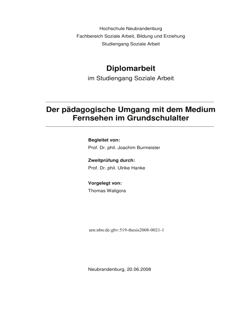 Hochschule Neubrandenburg Fachbereich Soziale Arbeit, Bildung und Erziehung Studiengang Soziale Arbeit Diplomarbeit im Studiengang Soziale Arbeit ______________________________________________________________________ Der pädagogische Umgang mit dem Medium Fernsehen im Grundschulalter ______________________________________________________________________ Begleitet von: Prof. Dr. phil. Joachim Burmeister Zweitprüfung durch: Prof. Dr. phil. Ulrike Hanke Vorgelegt von: Thomas Waligora urn:nbn:de:gbv:519-thesis2008-0021-1 Neubrandenburg, 20.06.2008 Inhaltsverzeichnis Inhaltsverzeichnis ...............................................................................................1 1. Einleitung.....................................................................................................3 2. Die Entwicklung von Kindern im Grundschulalter ........................................8 2.1 Kognitive Entwicklung von Kindern im Grundschulalter........................8 2.2 Sozial-kognitive Entwicklung von Kindern im Grundschulalter .............9 2.3 Kindliche Fähigkeiten und Bedingungen aus sozialisationstheoretischer Sicht.........................................................10 2.4 Alterspezifische Entwicklungsaufgaben..............................................14 3. Der Umgang von Grundschülern mit Fernsehinhalten...............................17 4. Einbindung und Wirkungen von Fernsehen im kindlichen Leben ..............26 4.1 Zusammenhang von kindlichen Alltagsthemen und Fernsehen .........26 4.2 Fernsehpräferenzen von Kindern .......................................................27 4.3 Die Bedeutung der Familienkonstellation für das Sehverhalten der Kinder .................................................................................................30 4.3.1 Die Veränderung der Familien.....................................................30 4.3.2 Unterschiede in Fernsehnutzung und Fernseherziehung in den Familienformen ............................................................................32 4.3.3 Bedeutung des sozialen Kontextes und der Einfluss von Bildungsvoraussetzungen auf die Mediensozialisation ................39 4.4 Bedeutung von Gewaltdarstellungen für das Aggressionspotential....43 4.5 Beispiele für Ausprägungen bzw. für Umstände, die das Risiko von negativen Wirkungen von Fernseh-Gewalt erhöhen können ..............45 4.5.1 Zugang zu extremer Gewalt im Fernsehen .................................45 4.5.2 Gefahrenpotential durch Vermischung von Gewalt und Humor...47 4.6 Der Zusammenhang von Fernsehinhalten und prosozialem Verhalten ............................................................................................48 4.7 Der Umgang von Eltern mit „fernsehenden“ Kindern ..........................50 4.8 Exzessiver und pathologischer Fernsehkonsum ................................54 1 5. Medienpädagogische Konzepte zum erzieherischen Umgang von Kindern und dem Medium Fernsehen..................................................................57 5.1 Medienpädagogische Richtungen ......................................................57 5.2 Notwendigkeit, Ziele und Rollenverteilung der Medienpädagogik ......59 5.3 Medienpädagogische Ansätze bezogen auf Arbeit in der Schule.......65 5.3.1 Zugang zu unverarbeiteten Fernsehinhalten ...............................65 5.3.2 Reflexion des Nutzungsvorgehens von Schülern und der Erziehungsansätze ihrer Eltern....................................................67 6. 5.4 Begleitende Eltern- und Familienarbeit...............................................69 5.5 Medienpädagogische Empfehlungen für Eltern ..................................75 Quintessenz und Zusammenfassung der wichtigsten Grundsätze zum pädagogischen Umgang mit dem Medium Fernsehen im Grundschulalter ......................................................................................84 7. Literaturverzeichnis....................................................................................90 2 1. Einleitung Das Medium Fernsehen vermittelte für viele Menschen lange Zeit kein offensichtliches Gefahrenpotential. Das Fernsehgerät entwickelte sich im letzten Jahrhundert im Kreis von Familiensystemen vom reinen Luxusgut zum elementaren Unterhaltungs- und Informationsfaktor bis hin zum überwiegend akzeptierten Teil des Alltags. Die Nutzung von Fernsehgeräten ist unlängst alltäglich und selbstverständlich geworden. Mittlerweile steht fast jedem deutschen Haushalt mindestens ein Fernseher zur Verfügung (vgl. KIM-Studie 2006, S. 7) und die Wirkung des Fernsehens als Sozialisationsfaktor ist weitestgehend unbestritten. Das Programm-Angebot befindet sich seit der Zulassung von Privatsendern Mitte der 80er Jahre im ständigen Wachstum. Durch den Konkurrenzdruck der zunehmenden Sendermenge ist der Kampf um die Gunst der Konsumenten offensichtlich härter geworden. Zugunsten der Massenattraktivität und damit einer vermeintlich sicheren Basis Profite zu erlangen, ist der Anteil an Unterhaltungsangeboten und Mischformaten (z.B. Mix aus Werbung, Unterhaltung, Beratung, Information) deutlich angestiegen. Diese vor allem kommerziell bedingte Forcierung betrifft Kinder, aber auch verstärkt ein gemischtes Publikum aus Erwachsenen und Kindern als Empfänger des Fernsehangebotes. Durch die zunehmende Auflockerung der Grenzen, von Erwachsenen- und Kinderprogrammen hin zu unspezifischer Familienunterhaltung, sind die pädagogischen Ansprüche an Eltern deutlich angewachsen (vgl. Hurrelmann/ Hammer/Stelberg 1996, S.12 ff.). „Sie müssen selbst Definitionen vornehmen, Grenzen aushandeln, Verbote begründen und durchsetzen, Handlungsalternativen zeigen, andere Möglichkeiten der Freizeitgestaltung eröffnen“ (Hurrelmann/ Hammer/ Stelberg 1996, S.13). In der Diskussion zunehmender Mediennutzung folgt speziell die Kritik am Medium Fernsehen Fernsehkonsum von einer Kindern langjährigen weiterhin Tradition. besonders Dabei im steht Fokus. der Andere 