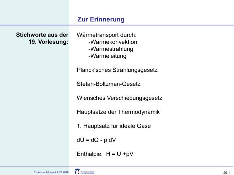Zur Erinnerung Stichworte aus der 19. Vorlesung: Wärmetransport durch: -Wärmekonvektion -Wärmestrahlung -Wärmeleitung Planck‘sches Strahlungsgesetz Stefan-Boltzman-Gesetz Wiensches Verschiebungsgesetz Hauptsätze der Thermodynamik 1. Hauptsatz für ideale Gase dU = dQ - p dV Enthalpie: H = U +pV Experimentalphysik I SS 2010 20-1 Zur Erinnerung Isochorer Prozess: dU = dQ − p ⋅ dV dQ = dU = CV ⋅ dT , ⇒ CV = Isobarer Prozess: Enthalpie H: dp = 0 ⇒ dQ = dU + p ⋅ dV dQ = C p ⋅ dT Def.: H = U + p ⋅ V , dQ = dH (für dp = 0) C p = Isothermer Prozess: ∂U ∂T V dU = 0 ∂H ∂T H = „Maß für die Energie eines thermodynamischen Systems“ p ⇒ dQ = p ⋅ dV V W = R ⋅ T0 ⋅ ln 1 V2 Experimentalphysik I SS 2010 20-2 Erster Hauptsatz: Konsequenzen Adiabatischer Prozess: dQ = 0 ⇒ dU = − p ⋅ dV R ⋅T V dV dT = −R∫ CV ⋅ ∫ V T dU = − p ⋅ dV = CV ⋅ dT p= dV ⇒ V CV ⋅ ln T = − R ⋅ ln V + const. ⇒ CV ⋅ dT = − R ⋅ T ⋅ ln T CV + ln V R = const. T CV ⋅ V Poisson‘sche Gleichungen/AdiabatenGleichungen: T ⋅V (C p −CV ) κ −1 κ C p −CV = const. CV ⇒ κ= = const. p ⋅ V = const. Experimentalphysik I SS 2010 ln (T CV ⋅ V R ) = const. ⇒ da T= Cp CV T ⋅V f = 2 f R+R 2 = const. CV R = f +2 f p ⋅V R 20-3 Erster Hauptsatz: Konsequenzen Adiabatischer Prozess: In der Thermodynamik bedeutet: „adiabatisch“ meist „schneller Prozess“, damit ΔQ (Verlust durch Wärmeleitung) klein. Später (in Quantenmechanik) bedeutet „adiabatisch“ oft „langsamer Prozess“ (kein Energieverlust durch Übergang in anderen Energiezustand) (immer: ΔQ = 0 !) Experimentalphysik I SS 2010 20-4 Isothermer und adiabatischer Prozess p=p(V): Isothermen und Adiabaten in einem p-V-Diagramm isotherme Änderung: adiabatische Änderung: p ⋅ V = R ⋅ T0 ⇒ pisotherm (V ) = p ⋅ V = const.(= p0 ⋅ V0 κ κ ) ⇒ R ⋅ T0 V p0 ⋅ V0κ padiabatisch (V ) = Vκ p(V) Druck ändert sich mit V bei adiabtischem Prozess (dQ = 0) schneller als bei isothermem Prozess (dU = 0), da: dV < 0: Kompressionsarbeit, T steigt → p steigt dV > 0: Expansionsarbeit, T sinkt → p sinkt Experimentalphysik I SS 2010 20-5 Isothermer und adiabatischer Prozess Isothermer Prozess: Vorgang (ΔV) „langsam“: ΔW: Kompressions-/Expansionsarbeit ΔQ: Erwärmung/Abkühlung ⇒ vollständiger Ausgleich durch Wärmebad adiabatischer Prozess: Vorgang (ΔV) „schnell“: ΔW: Kompressions-/Expansionsarbeit ΔQ: Erwärmung/Abkühlung ⇒ kein Ausgleich durch Wärme-Abfuhr/-Zufuhr T1 ⋅ V1κ −1 = T0 ⋅ V0κ −1 z.B. : (pneumatisches Feuerzeug) Experimentalphysik I SS 2010 V0 ⇒ T1 = T0 ⋅ V1 κ −1 V0 = 10, κ ( N 2 ) = 7 = 1,4 5 V1 ⇒ T1 = T0 ⋅100, 4 = T0 ⋅ 2,5 T0 = 293 K ⇒ T1 = 736 K 20-6 Versuchsbeispiel für adiabatischen Prozess Bestimmung von CP/CV durch periodische adiabatische Kompression und Expansion: Bewegungsgleichung für Kugel N2: f = 3+2 bei T = 300 K Experimentalphysik I SS 2010 20-7 2. Hauptsatz der Thermodynamik Kreisprozesse: p1, V1, T1 p1 Umwandlung von thermischer Energie in mechanische Arbeit p2 p4 p3 p2, V2, T1 p3, V3, T2 Wärme fließt von selbst nur vom wärmeren Körper zum kälteren! Ein thermodynamisches System durchläuft verschiedene Zustände mit unterschiedlichen Zustandsgrößen und kehrt in den Ausgangszustand (identische Zustandsgrößen) zurück. Es gibt reversible und irreversible Kreisprozesse Experimentalphysik I SS 2010 20-8 Carnot-Prozess Umwandlung von Wärme in Arbeit mit optimaler Effizienz p1 p Isotherme (1) Adiabate T1 p2 (2) p3 p4 ∆Q1 (4) T2 V V1 V4 V2 T1 (3) V1, p1 V3 V2, p2 nach Durchlaufen eines Zyklus: Wärmemenge ∆Q = ∆Q1 - ∆Q2 dem Arbeitsmedium zugeführt und in mechanische Arbeit umgewandelt Experimentalphysik I SS 2010 ∆Q2 V4, p4 T2 V3, p3 20-9 Carnot-Prozesse Prozess (1) → (2): guter Kontakt zum Reservoir T1 isothermer Prozess: Energie für Expansionsarbeit aus Reservoir T1 entnommen Prozess (2) → (3): kein Kontakt zu Reservoirs Ti adiabatischer Prozess: Energie für Expansionsarbeit aus innerer Energie entnommen, TMedium sinkt Prozess (3) → (4): guter Kontakt zu Reservoirs T2 isothermer Prozess: Wärme durch Kompressionsarbeit (von außen) wird an Reservoir T1 abgegeben Prozess (4) → (1): kein Kontakt zu Reservoirs Ti adiabatischer Prozess: Wärme durch Kompressionsarbeit geht in innere Energie, TMedium steigt Experimentalphysik I SS 2010 20-10 Carnot-Prozesse Expansion: Kompression: Netto: Experimentalphysik I SS 2010 auf hohem Druck-Niveau und hohem Temperatur-Niveau Expansionsarbeit wird geleistet, Wärmeenergie aus Wärmebad aufgenommen Energie für adiabatische Expansion aus ΔU(T1→ T2) auf niedrigem Druck-Niveau und niedrigem TemperaturNiveau, Kompressionsarbeit < Expansionsarbeit !! Wärmeenergie an Wärmebad abgegeben Wärme aus adiabatischer Kompression in ΔU(T2 → T1) Expansion, aus Reservoir 1 (T1 > T2) : ΔQ1 aufgenommen, Arbeit geleistet Kompression, an Reservoir 2(T2 < T1) : ΔQ2 < ΔQ1 abgegeben, Arbeit erforderlich (ΔQ1 - ΔQ2 ) = ΔW1,2,3,4 → mechanische Arbeit isotherme Prozesse: Umwandlung Wärme → Arbeit adiabatische Prozesse: Änderung der Temperatur des Mediums, damit ΔQ2 < ΔQ1 möglich wird. 20-11 Carnot-Prozesse: Energiebilanz (1) → (2) isotherm: dQ = pdV = − dW dV > 0 V2 V − ∆W1, 2 = ∫ pdV = RT1 ⋅ ln 2 > 0 V2 > V1 V1 V1 (2) → (3) adiabatisch: dQ = 0 dU = − pdV < 0 (dV > 0) V3 − ∆W2 , 3 = ∫ pdV = U (T1 ) − U (T2 ) > 0 Vk ∫ pdV = Vi Fläche unter der Kurve Vi ⇒ Vk V2 (3) → (4) isotherm: dQ = pdV = − dW V4 dV < 0 − ∆W3, 4 = ∫ pdV = RT1 ⋅ ln V3 (4) → (1) adiabatisch: V4 < 0 V3 > V4 V3 dQ = 0 dU = − pdV > 0 (dV < 0) V1 − ∆W4 ,1 = ∫ pdV = U (T2 ) − U (T1 ) < 0 V4 Experimentalphysik I SS 2010 20-12 Carnot-Prozesse: Energiebilanz Arbeit und pVDiagramm: V2 V3 V1 V2 − ∆WExpan. = ∫ pdV + ∫ pdV durch Expansion von der Maschine geleistete mechanische Arbeit = Fläche unter p(V) (V2 > V1, V3 > V2) V4 V1 V3 V4 