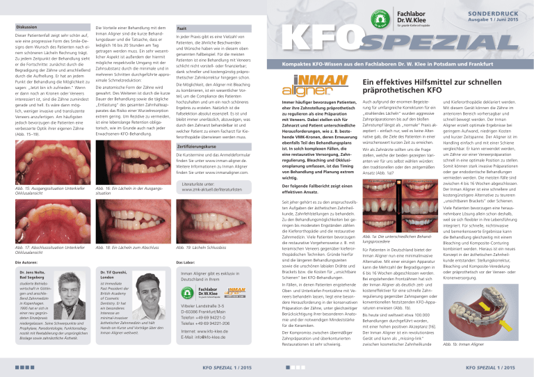 SONDERDRUCK Ausgabe 1 / Juni 2015 Diskussion Dieser Patientenfall zeigt sehr schön auf, wie eine progressive Form des Smile-Designs dem Wunsch des Patienten nach einem schöneren Lächeln Rechnung trägt. Zu jedem Zeitpunkt der Behandlung sieht er die Fortschritte: zunächst durch die Begradigung der Zähne und anschließend durch die Aufhellung. Er hat an jedem Punkt der Behandlung die Möglichkeit zu sagen: „Jetzt bin ich zufrieden.“ Wenn er dann noch an Kronen oder Veneers interessiert ist, sind die Zähne zumindest gerade und hell. Es wäre dann möglich, weniger invasive und transluzente Veneers anzufertigen. Am häufigsten jedoch bevorzugen die Patienten eine verbesserte Optik ihrer eigenen Zähne (Abb. 15–19). Die Vorteile einer Behandlung mit dem Inman Aligner sind die kurze Behandlungsdauer und die Tatsache, dass er lediglich 16 bis 20 Stunden am Tag getragen werden muss. Ein sehr wesentlicher Aspekt ist außerdem der hiermit mögliche respektvolle Umgang mit der Zahnsubstanz durch die minimale und in mehreren Schritten durchgeführte approximale Schmelzreduktion: Die anatomische Form der Zähne wird gewahrt. Des Weiteren ist durch die kurze Dauer der Behandlung sowie die tägliche „Entlastung“ des gesamten Zahnhalteapparates das Risiko einer Wurzelresorption extrem gering. Um Rezidive zu vermeiden, ist eine lebenslange Retention obligatorisch, wie im Grunde auch nach jeder Erwachsenen-KFO-Behandlung. Fazit In jeder Praxis gibt es eine Vielzahl von Patienten, die ähnliche Beschwerden und Wünsche haben wie in diesem oben genannten Fallbeispiel. Für die meisten Patienten ist eine Behandlung mit Veneers schlicht nicht vorstell- oder finanzierbar; dank schneller und kostengünstig präprothetischer Zahnkorrektur hingegen schon. Die Möglichkeit, den Aligner mit Bleaching zu kombinieren, ist ein wesentlicher Vorteil, um die Compliance des Patienten hochzuhalten und um ein noch schöneres Ergebnis zu erzielen. Natürlich ist die Fallselektion absolut essenziell. Es ist und bleibt immer unerlässlich, abzuwägen, was durch den Zahnarzt behandelbar ist und welcher Patient zu einem Facharzt für Kieferorthopädie überwiesen werden muss. Zertifizierungskurse Die Kurstermine und das Anmeldeformular finden Sie unter www.inman-aligner.de. Weitere Informationen zu Inman Aligner finden Sie unter www.inmanaligner.com. Abb. 15: Ausgangssituation Unterkiefer Okklusalansicht Abb. 17: Abschlusssituation Unterkiefer Okklusalansicht Abb. 16: Ein Lächeln in der Ausgangssituation Abb. 18: Ein Lächeln zum Abschluss Die Autoren: Literaturliste unter: www.zmk-aktuell.de/literaturlisten Abb. 19: Lächeln Schlussbiss Das Labor: Dr. Jens Nolte, Bad Segeberg Dr. Tif Qureshi, London studierte Betriebswirtschaft in Göttingen und anschließend Zahnmedizin in Kopenhagen. 1995 hat er sich in einer neu gegründeten Einzelpraxis niedergelassen. Seine Schwerpunkte sind Prophylaxe, Parodontologie, Funktionsdiagnostik mit Reetablierung der ursprünglichen Bisslage sowie zahnärztliche Ästhetik. ist Immediate Past President der British Academy of Cosmetic Dentistry. Er hat ein besonderes Interesse an minimal-invasiver ästhetischer Zahnmedizin und hält Hands-on-Kurse und Vorträge über den Inman Aligner weltweit. Inman Aligner gibt es exklusiv in Deutschland in Ihrem Vilbeler Landstraße 3-5 D-60386 Frankfurt/Main Telefon +49 69 94221-0 Telefax +49 69 94221-206 Internet: www.kfo-klee.de E-Mail: info@kfo-klee.de KFO SPEZIAL 1 / 2015 Kompaktes KFO-Wissen aus den Fachlaboren Dr. W. Klee in Potsdam und Frankfurt Ein effektives Hilfsmittel zur schnellen präprothetischen KFO Immer häufiger bevorzugen Patienten, eher ihre Zahnstellung präprothetisch zu regulieren als eine Präparation mit Veneers. Dabei stellen sich für Zahnarzt und Patient unterschiedliche Herausforderungen, wie z. B. bestehende VMK-Kronen, deren Erneuerung ebenfalls Teil des Behandlungsplans ist. In solch komplexen Fällen, die eine restaurative Versorgung, Zahnregulierung, Bleaching und Okklusionsplanung umfassen, ist das Timing von Behandlung und Planung extrem wichtig. Auch aufgrund der enormen Begeisterung für umfangreiche Korrekturen für ein „strahlendes Lächeln“ wurden aggressive Zahnpräparationen bis auf den bloßen Zahnstumpf längst als „normale“ Praxis akzeptiert – einfach nur, weil es keine Alternative gab, die Ziele des Patienten in einer wünschenswert kurzen Zeit zu erreichen. Wir als Zahnärzte sollten uns die Frage stellen, welche der beiden gezeigten Varianten wir für uns selbst wählen würden: den traditionellen oder den zeitgemäßen Ansatz (Abb. 1a)? Der folgende Fallbericht zeigt einen effektiven Ansatz. Seit jeher gehört es zu den anspruchsvollsten Aufgaben der ästhetischen Zahnheilkunde, Zahnfehlstellungen zu behandeln. Zu den Behandlungsmöglichkeiten bei geringen bis moderaten Engständen zählen die Kieferorthopädie und die restaurative Zahnmedizin. Viele Patienten bevorzugen die restaurative Vorgehensweise z. B. mit keramischen Veneers gegenüber kieferorthopädischen Techniken. Gründe hierfür sind die längeren Behandlungszeiten sowie die unschönen labialen Drähte und Brackets bzw. die Kosten für „unsichtbare Schienen“ bei KFO-Behandlungen. In Fällen, in denen Patienten engstehende Ober- und Unterkiefer-Frontzähne mit Veneers behandeln lassen, liegt eine besondere Herausforderung in der konservativen Präparation der Zähne, unter gleichzeitiger Berücksichtigung ihrer besonderen Anatomie und der notwendigen Mindeststärke für die Keramiken. Der Kompromiss zwischen übermäßiger Zahnpräparation und überkonturierten Restaurationen ist sehr schwierig. Abb. 1a: Die unterschiedlichen Behandlungsprocedere Für Patienten in Deutschland bietet der Inman Aligner nun eine minimalinvasive Alternative. Mit einer einzigen Apparatur kann die Mehrzahl der Begradigungen in 6 bis 16 Wochen abgeschlossen werden. Bei engstehenden Frontzähnen hat sich der Inman Aligner als deutlich zeit- un