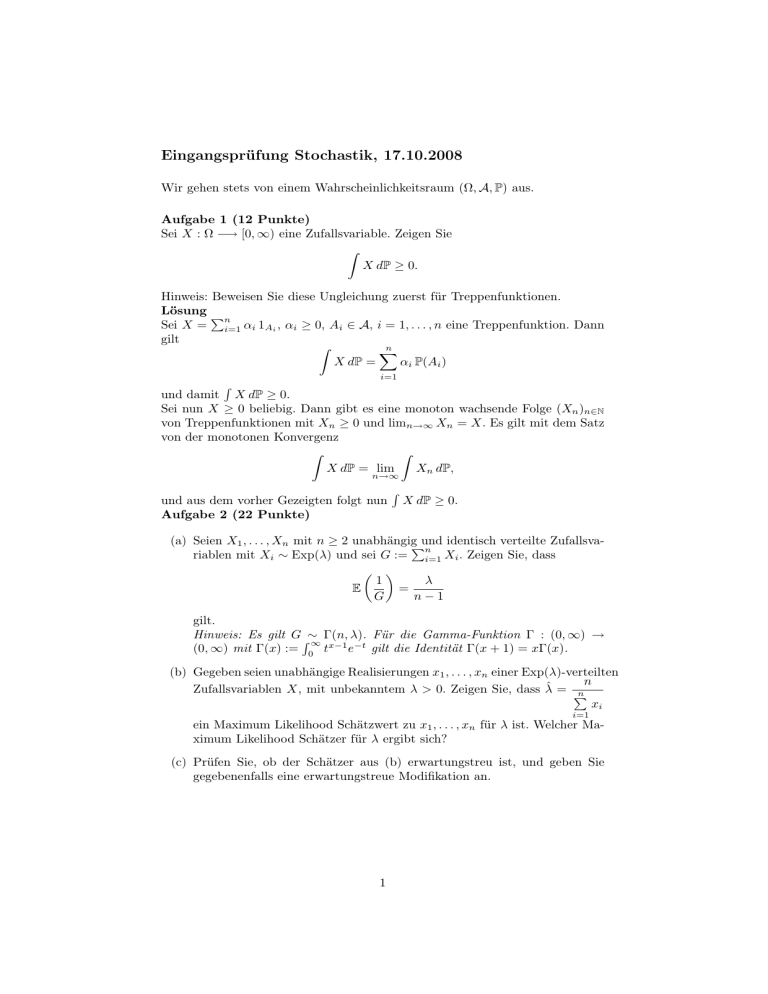 Eingangsprüfung Stochastik, 17.10.2008 Wir gehen stets von einem Wahrscheinlichkeitsraum (Ω, A, P) aus. Aufgabe 1 (12 Punkte) Sei X : Ω −→ [0, ∞) eine Zufallsvariable. Zeigen Sie Z X dP ≥ 0. Hinweis: Beweisen Sie diese Ungleichung zuerst für Treppenfunktionen. Lösung P n Sei X = i=1 αi 1Ai , αi ≥ 0, Ai ∈ A, i = 1, . . . , n eine Treppenfunktion. Dann gilt Z n X αi P(Ai ) X dP = i=1 und damit X dP ≥ 0. Sei nun X ≥ 0 beliebig. Dann gibt es eine monoton wachsende Folge (Xn )n∈N von Treppenfunktionen mit Xn ≥ 0 und limn→∞ Xn = X. Es gilt mit dem Satz von der monotonen Konvergenz Z Z Xn dP, X dP = lim R n→∞ und aus dem vorher Gezeigten folgt nun Aufgabe 2 (22 Punkte) R X dP ≥ 0. (a) Seien X1 , . . . , Xn mit n ≥ 2 unabhängigPund identisch verteilte Zufallsvan riablen mit Xi ∼ Exp(λ) und sei G := i=1 Xi . Zeigen Sie, dass 1 λ E = G n−1 gilt. Hinweis: Es gilt G R∼ Γ(n, λ). Für die Gamma-Funktion Γ : (0, ∞) → ∞ (0, ∞) mit Γ(x) := 0 tx−1 e−t gilt die Identität Γ(x + 1) = xΓ(x). (b) Gegeben seien unabhängige Realisierungen x1 , . . . , xn einer Exp(λ)-verteilten n Zufallsvariablen X, mit unbekanntem λ > 0. Zeigen Sie, dass λ̂ = P n xi i=1 ein Maximum Likelihood Schätzwert zu x1 , . . . , xn für λ ist. Welcher Maximum Likelihood Schätzer für λ ergibt sich? (c) Prüfen Sie, ob der Schätzer aus (b) erwartungstreu ist, und geben Sie gegebenenfalls eine erwartungstreue Modifikation an. 1 Lösung Zu (a) Es gilt G ∼ Γ(n, λ) und damit Z ∞ 1 λn n−1 −λx 1 = · x e dx E G x Γ(n) 0 Z ∞ λn = x(n−1)−1 e−λx dx Γ(n) 0 Z λ Γ(n − 1) ∞ λn−1 x(n−1)−1 e−λx dx = Γ(n) Γ(n − 1) 0 λ = . n−1 Zu (b) Sei x1 , . . . , xn eine Stichprobe. Aufgrund der Unabhängigkeit der Xi , i = 1, . . . , n gilt für die Likelihood ! n X n −λxn −λx1 xi . = λ exp −λ · . . . · λe L(λ; x1 , . . . , xn ) = λe i=1 Für die Loglikelihood-Funktion ℓ mit ℓ(λ) := ln(L(λ)) ergibt sich ℓ(λ) := ln L(λ) = ln(λn ) − λ n ℓ′ (λ) = ℓ′′ (λ) = n X xi − λ i=1 n − 2 <0 λ n X i=1 xi = n ln(λ) − λ n X xi i=1 n und somit liegt in P ein Maximum der Likelihoodfunktion vor. Damit ist n xi die Zufallsvariable i=1 n λ̂ = P n Xi i=1 ein Maximum Likelihood Schätzer. Zu (c) Aus (a) und (b) folgt 1 = λ =⇒ E(λ̂) = n · λ . E n P n−1 n−1 Xi i=1 n−1 ˆ ein erwarSomit ist λ̂ nicht erwartungstreu. Dagegen ist offenbar λ̂ = P n Xi i=1 tungstreuer Schätzer. 2 Aufgabe 3 (18 Punkte) Gegeben seien zwei Zufallsvariablen X und Λ. Dabei sei Λ ∼ U [1, 2] also gleichverteilt auf dem Intervall [1,2] und bei gegebenem Λ = λ sei X ∼ Exp(λ)verteilt. (a) Bestimmen Sie E(X|Λ) und Var(X|Λ). (b) Bestimmen Sie E(X) und Var(X). (c) Bestimmen Sie P(X ≥ 1). Lösung Zu (a) 1 1 und Var(X|Λ = λ) = 2 , also Bei gegebenem λ ∈ [1, 2] gilt E(X|Λ = λ) = λ λ 1 1 folgt E(X|Λ) = und Var(X) = 2 . Λ Λ Zu (b) Mit dem Satz vom iterierten Erwartungswert gilt Z 2 1 1 = dλ = ln 2 − ln 1 = ln 2. E(X) = E(E(X|Λ)) = E Λ λ 1 Für die Varianz erhalten wir aus der Varianz-Zerlegung Var(X) = Var(E(X|Λ)) + E(Var(X|Λ)) 1 1 +E = Var Λ Λ2 2 1 1 1 = E −E +E Λ2 Λ Λ2 2 1 1 = 2E − E . 2 Λ Λ Für den ersten Term ergibt sich E Insgesamt folgt also 1 Λ2 = Z 1 2 2 1 1 1 1 =− +1= . dλ = − λ2 λ 1 2 2 Var(X) = 2 · 1 2 2 − (ln 2) = 1 − (ln 2) . 2 Zu (c) Es gilt P(X ≥ 1) = Z 1 2 P(X ≥ 1|Λ = λ)fΛ (λ)dλ = 3 Z 1 2 2 e−λ dλ = −e−λ = e−1 − e−2 . 1 Aufgabe 4 (38 Punkte) Herr K. fährt täglich um 08:30 in die Arbeit, Arbeitsbeginn ist spätestens 09:15. Die Reisezeit T in Minuten sei normalverteilt. (a) Es gelte T ∼ N (40, 16). (i) Bestimmen Sie die Wahrscheinlichkeit, dass er zwischen 09:10 und 09:20 ankommt. (ii) Wie groß ist die Wahrscheinlichkeit des Zuspätkommens? (iii) An wievielen Arbeitstagen im Jahr (200 Tage pro Jahr) wird er im Mittel zu spät kommen? (iv) Welchen Abfahrtszeitpunkt (minutengenau) schlagen Sie vor, damit K. bei unveränderter Reisezeit T im Mittel an höchstens 2 Tagen im Jahr zu spät kommt? (b) Herr K. will weiterhin erst um 08:30 starten und probiert eine neue Route. Die Reisezeit sei weiter normalverteilt. An 30 Arbeitstagen kommt er im Mittel um 09:05 an, die empirische Varianz beträgt 12,25. (i) Herr K. vermutet, dass seine Reisezeit sich verkürzt hat. Überprüfen Sie anhand einer geeigneten Nullhypothese seine Vermutung zum Niveau von 5 %. (ii) Geben Sie für den Erwartungswert der Reisezeit ein Schätzintervall zum Niveau 5 % an. (c) Diskutieren Sie die Annahme der Normalverteilung. Lösung Zu (a) (i) Ankunftszeit liegt zwischen 09:10 und 09:20 genau dann wenn T ∈ [40, 50] gilt. P(40 ≤ T ≤ 50) = P(T ≤ 50) − P(T ≤ 40) = Φ = 0, 4938. 50 − 40 4 −Φ 40 − 40 4 (ii) Herr K. verspätet sich genau dann wenn T > 45 gilt. 5 = 0, 1056. P(45 > T ) = 1 − P(T ≤ 45) = 1 − Φ 4 (iii) Bezeichnet man mit N die Anzahl der Tage, an denen sich K. verspätet, und mit p := 0, 1056, dann ist laut (ii) N ∼ B(200, p)-verteilt und damit E(N ) = 200p = 21, 12. Im Mittel kommt Herr K. an 21,12 Tagen im Jahr zu spät. (iv) Die Wahrscheinlichkeit q, dass Herr K. sich verspätet, soll so bestimmt werden, dass 200q ≤ 2 gilt, also q ≤ 0, 01. Sei t0 die Reisezeit, die mit einer Wahrscheinlichkeit von maximal 0, 01 überschritten wird, also P(T ≥ t0 ) = 0, 01. 4 Wegen P(T ≥ t0 ) = 1 − P(T ≤ t0 ) = 1 − Φ t0 − 40 4 ergibt sich zunächst Φ und damit t0 − 40 4 = 0, 99 t0 = 40 + 4u0,99 = 40 + 4 · 2, 34 = 49, 36 ≈ 50. Herr K. sollte also um 08:25 starten. Zu (b) (i) Zu testen ist die Nullhypothese H0 : µ ≤ µ0 mit µ0 := 40. Es handelt sich um einen einseitigen t-Test, Testgröße ist T = x − µ0 √ n s und besitzt bei den vorliegenden Daten den Wert −5 √ 30 = −7, 82. 3, 5 Die Hypothese wird im Fall T > t29;0,95 = 1, 699 abgelehnt. Also wird H0 nicht verworfen. √ (ii) Das Schätzintervall lautet mit t29;0,975 