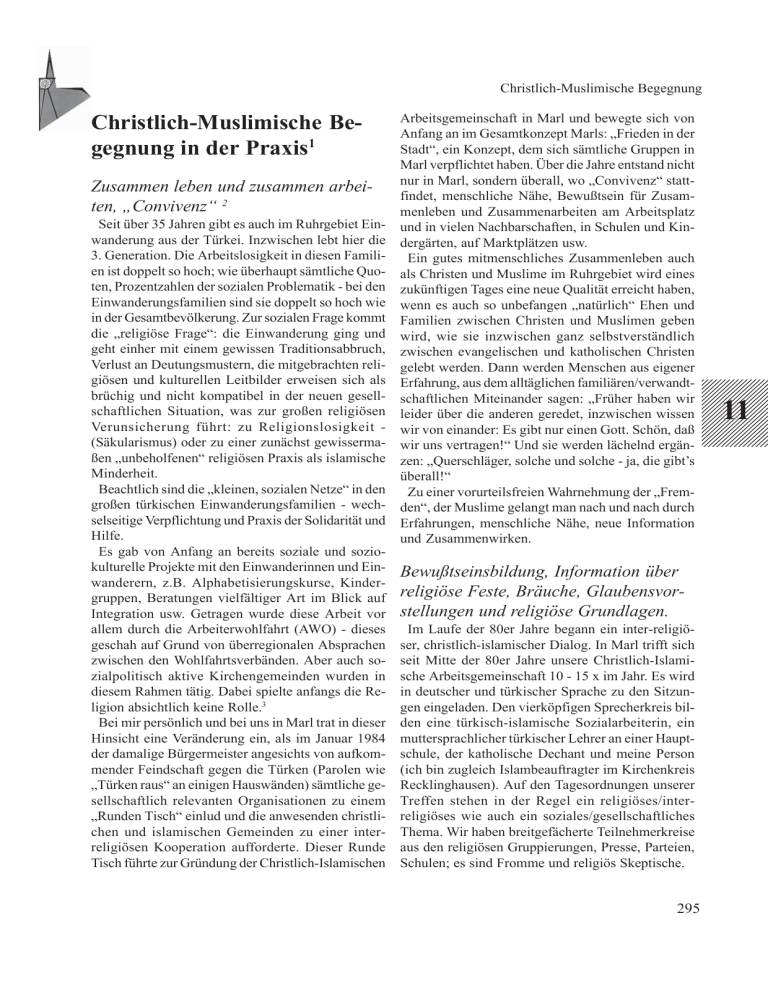 Christlich-Muslimische Begegnung Christlich-Muslimische Begegnung in der Praxis1 Zusammen leben und zusammen arbeiten, „Convivenz“ 2 Seit über 35 Jahren gibt es auch im Ruhrgebiet Einwanderung aus der Türkei. Inzwischen lebt hier die 3. Generation. Die Arbeitslosigkeit in diesen Familien ist doppelt so hoch; wie überhaupt sämtliche Quoten, Prozentzahlen der sozialen Problematik - bei den Einwanderungsfamilien sind sie doppelt so hoch wie in der Gesamtbevölkerung. Zur sozialen Frage kommt die „religiöse Frage“: die Einwanderung ging und geht einher mit einem gewissen Traditionsabbruch, Verlust an Deutungsmustern, die mitgebrachten religiösen und kulturellen Leitbilder erweisen sich als brüchig und nicht kompatibel in der neuen gesellschaftlichen Situation, was zur großen religiösen Verunsicherung führt: zu Religionslosigkeit (Säkularismus) oder zu einer zunächst gewissermaßen „unbeholfenen“ religiösen Praxis als islamische Minderheit. Beachtlich sind die „kleinen, sozialen Netze“ in den großen türkischen Einwanderungsfamilien - wechselseitige Verpflichtung und Praxis der Solidarität und Hilfe. Es gab von Anfang an bereits soziale und soziokulturelle Projekte mit den Einwanderinnen und Einwanderern, z.B. Alphabetisierungskurse, Kindergruppen, Beratungen vielfältiger Art im Blick auf Integration usw. Getragen wurde diese Arbeit vor allem durch die Arbeiterwohlfahrt (AWO) - dieses geschah auf Grund von überregionalen Absprachen zwischen den Wohlfahrtsverbänden. Aber auch sozialpolitisch aktive Kirchengemeinden wurden in diesem Rahmen tätig. Dabei spielte anfangs die Religion absichtlich keine Rolle.3 Bei mir persönlich und bei uns in Marl trat in dieser Hinsicht eine Veränderung ein, als im Januar 1984 der damalige Bürgermeister angesichts von aufkommender Feindschaft gegen die Türken (Parolen wie „Türken raus“ an einigen Hauswänden) sämtliche gesellschaftlich relevanten Organisationen zu einem „Runden Tisch“ einlud und die anwesenden christlichen und islamischen Gemeinden zu einer interreligiösen Kooperation aufforderte. Dieser Runde Tisch führte zur Gründung der Christlich-Islamischen Arbeitsgemeinschaft in Marl und bewegte sich von Anfang an im Gesamtkonzept Marls: „Frieden in der Stadt“, ein Konzept, dem sich sämtliche Gruppen in Marl verpflichtet haben. Über die Jahre entstand nicht nur in Marl, sondern überall, wo „Convivenz“ stattfindet, menschliche Nähe, Bewußtsein für Zusammenleben und Zusammenarbeiten am Arbeitsplatz und in vielen Nachbarschaften, in Schulen und Kindergärten, auf Marktplätzen usw. Ein gutes mitmenschliches Zusammenleben auch als Christen und Muslime im Ruhrgebiet wird eines zukünftigen Tages eine neue Qualität erreicht haben, wenn es auch so unbefangen „natürlich“ Ehen und Familien zwischen Christen und Muslimen geben wird, wie sie inzwischen ganz selbstverständlich zwischen evangelischen und katholischen Christen gelebt werden. Dann werden Menschen aus eigener 12345678901234567 12345678901234567 Erfahrung, aus dem alltäglichen familiären/verwandt- 12345678901234567 12345678901234567 12345678901234567 schaftlichen Miteinander sagen: „Früher haben wir 12345678901234567 12345678901234567 12345678901234567 12345678901234567 leider über die anderen geredet, inzwischen wissen 12345678901234567 12345678901234567 12345678901234567 12345678901234567 wir von einander: Es gibt nur einen Gott. Schön, daß 12345678901234567 12345678901234567 12345678901234567 12345678901234567 wir uns vertragen!“ Und sie werden lächelnd ergän- 12345678901234567 zen: „Querschläger, solche und solche - ja, die gibt’s überall!“ Zu einer vorurteilsfreien Wahrnehmung der „Fremden“, der Muslime gelangt man nach und nach durch Erfahrungen, menschliche Nähe, neue Information und Zusammenwirken. 11 Bewußtseinsbildung, Information über religiöse Feste, Bräuche, Glaubensvorstellungen und religiöse Grundlagen. Im Laufe der 80er Jahre begann ein inter-religiöser, christlich-islamischer Dialog. In Marl trifft sich seit Mitte der 80er Jahre unsere Christlich-Islamische Arbeitsgemeinschaft 10 - 15 x im Jahr. Es wird in deutscher und türkischer Sprache zu den Sitzungen eingeladen. Den vierköpfigen Sprecherkreis bilden eine türkisch-islamische Sozialarbeiterin, ein muttersprachlicher türkischer Lehrer an einer Hauptschule, der katholische Dechant und meine Person (ich bin zugleich Islambeauftragter im Kirchenkreis Recklinghausen). Auf den Tagesordnungen unserer Treffen stehen in der Regel ein religiöses/interreligiöses wie auch ein soziales/gesellschaftliches Thema. Wir haben breitgefächerte Teilnehmerkreise aus den religiösen Gruppierungen, Presse, Parteien, Schulen; es sind Fromme und religiös Skeptische. 295 Christlich-Muslimische Begegnung Der christlich-islamische Dialog hat viele Ebenen. An großen islamischen und christlichen Festtagen4 gratulieren wir und besuchen uns hin und her in aller Öffentlichkeit. Ramadan und Opferfest auf islamischer Seite, Weihnachten auf christlicher Seite. Bei unseren Sitzungen als Christlich-Islamische Arbeitsgemeinschaft werden dabei die besonderen biblischen und koranischen Texte gemeinsam gelesen und interpretiert. So ist es an vielen Orten. Zusätzlich zu solchen Besuchen in kirchlichen oder islamischen Zentren und Räumlichkeiten kommen allgemeine Besuche in Moschee oder Kirche, um Schwellenängste zu senken. Eine neuerbaute Moschee ist immer ein Anziehungspunkt für Gruppen und Einzelne. Die evangelischen Gemeinden in Marl haben einen 12345678901234567 12345678901234567 2345678901234567 gemeinsamen Gemeindebrief, der monatlich er2345678901234567 2345678901234567 2345678901234567 2345678901234567 scheint und in einer Auflage von ungefähr 40.000 2345678901234567 2345678901234567 2345678901234567 Stück verteilt wird. In diesem Gemeindebrief stehen 2345678901234567 2345678901234567 2345678901234567 2345678901234567 jeden Monat unter der Rubrik „Feste 
