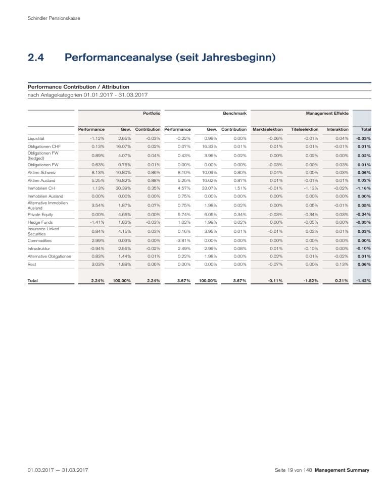 Schindler Pensionskasse 2.4 Performanceanalyse (seit Jahresbeginn) Performance Contribution / Attribution nach Anlagekategorien 01.01.2017 - 31.03.2017 Portfolio Performance Benchmark Gew. Contribution Performance Gew. Contribution Management Effekte Marktselektion Titelselektion Interaktion Total -1.12% 2.65% -0.03% -0.22% 0.99% 0.00% -0.06% -0.01% 0.04% -0.03% Obligationen CHF 0.13% 16.07% 0.02% 0.07% 16.33% 0.01% 0.01% 0.01% -0.01% 0.01% Obligationen FW (hedged) 0.89% 4.07% 0.04% 0.43% 3.96% 0.02% 0.00% 0.02% 0.00% 0.02% Obligationen FW 0.63% 0.76% 0.01% 0.00% 0.00% 0.00% -0.03% 0.00% 0.03% 0.01% Aktien Schweiz 8.13% 10.80% 0.86% 8.10% 10.09% 0.80% 0.04% 0.00% 0.03% 0.06% Aktien Ausland 5.25% 16.82% 0.88% 5.25% 16.62% 0.87% 0.01% -0.01% 0.01% 0.02% Immobilien CH 1.13% 30.39% 0.35% 4.57% 33.07% 1.51% -0.01% -1.13% -0.02% -1.16% Immobilien Ausland 0.00% 0.00% 0.00% 0.75% 0.00% 0.00% 0.00% 0.00% 0.00% 0.00% Alternative Immobilien Ausland 3.54% 1.87% 0.07% 0.75% 1.98% 0.02% 0.00% 0.05% -0.01% 0.05% Private Equity 0.00% 4.66% 0.00% 5.74% 6.05% 0.34% -0.03% -0.34% 0.03% -0.34% Hedge Funds -1.41% 1.83% -0.03% 1.02% 1.99% 0.02% 0.00% -0.05% 0.00% -0.05% 0.84% 4.15% 0.03% 0.16% 3.95% 0.01% -0.01% 0.03% 0.01% 0.03% Commodities 2.99% 0.03% 0.00% -3.81% 0.00% 0.00% 0.00% 0.00% 0.00% 0.00% Infrastruktur -0.94% 2.56% -0.02% 2.49% 2.99% 0.08% 0.01% -0.10% 0.00% -0.10% Alternative Obligationen 0.83% 1.44% 0.01% 0.22% 1.98% 0.00% 0.02% 0.01% -0.02% 0.01% Rest 3.03% 1.89% 0.06% 0.00% 0.00% 0.00% -0.07% 0.00% 0.13% 0.06% Total 2.24% 100.00% 2.24% 3.67% 100.00% 3.67% -0.11% -1.52% 0.21% -1.42% Liquidität Insurance Linked Securities 01.03.2017 — 31.03.2017 Seite 19 von 148 Management Summary Schindler Pensionskasse Performance Attribution — Management Effekte nach Anlagekategorien 01.01.2017 - 31.03.2017 0.20% 0.00% -0.20% -0.40% -0.60% -0.80% -1.00% Marktselektion 01.03.2017 — 31.03.2017 Titelselektion Rest Alternative Obligationen Infrastruktur Commodities Insurance Linked Securities Hedge Funds Private Equity Alternative Immobilien Ausland Immobilien Ausland Immobilien CH Aktien Ausland Aktien Schweiz Obligationen FW Obligationen FW (hedged) Obligationen CHF Liquidität -1.20% Interaktion Seite 20 von 148 Management Summary