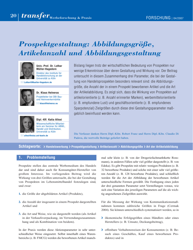 20 transferWerbeforschung & Praxis FORSCHUNG | 04/2007 Prospektgestaltung: Abbildungsgröße, Artikelanzahl und Abbildungsgestaltung Univ.-Prof. Dr. Lothar Müller-Hagedorn Direktor des Instituts für Handelsforschung an der Universität zu Köln Lothar@Mueller-Hagedorn.de Dr. Klaus Helnerus Projektleiter bei OBI Bauund Heimwerkermärkte klaus@helnerus.eu Bislang liegen trotz der wirtschaftlichen Bedeutung von Prospekten nur wenige Erkenntnisse über deren Gestaltung und Wirkung vor. Der Beitrag untersucht in diesem Zusammenhang drei Parameter, die bei der Gestaltung von Handelsprospekten besonders relevant sind: die Abbildungsgröße, die Anzahl der in einem Prospekt beworbenen Artikel und die Art der Artikelabbildung. Es zeigt sich, dass die Wirkung von Prospekten auf artikelorientierte (z. B. Anzahl erinnerter Marken), werbemittelorientierte (z. B. empfundene Lust) und geschäftsorientierte (z. B. empfundenes Sparpotenzial) Zielgrößen durch diese drei Gestaltungsparameter maßgeblich beeinflusst werden kann. Dipl.-Kff. Katia Allexi Wissenschaftliche Mitarbeiterin am Seminar für ABWL, Handel und Distribution, Universität zu Köln allexi@wiso.uni-koeln.de Schlagworte: 1. Die Verfasser danken Herrn Dipl.-Kfm. Robert Franz und Herrn Dipl.-Kfm. Claudio Di Padova, die wertvolle Beiträge geliefert haben. ❯ Handelswerbung ❯ Prospektgestaltung ❯ Artikelanzahl ❯ Abbildungsgröße ❯ Art der Artikelabbildung Problemstellung Prospekte stellen das zentrale Werbemedium des Handels dar und sind daher auch für Konsumgüter-Hersteller von großem Interesse. Im vorliegenden Beitrag wird die Wirkung von drei Größen untersucht, die bei der Gestaltung von Prospekten im Lebensmittelhandel festzulegen sind, und zwar: 1. die Größe der abgebildeten Artikel (Produkte), 2. die Anzahl der insgesamt in einem Prospekt dargestellten Artikel und mal sehr klein (z. B. von der Drogeriefachmarktkette Rossmann), in anderen Fällen sehr viel größer dargestellt (z. B. von Edeka). Es gibt Prospekte mit relativ wenigen Produkten (z. B. 32 beworbene Produkte) und solche mit einer sehr viel größeren Anzahl (z. B. 128 beworbene Produkte), und schließlich werden für die Art der Abbildung der beworbenen Artikel unterschiedliche Formen gewählt. Die Festlegung eines jeden der drei genannten Parameter setzt Vorstellungen voraus, wie sich eine Variation des jeweiligen Parameters auf die als wichtig angesehenen Zielgrößen auswirkt. Für die Messung der Wirkung von Kommunikationsmaßnahmen kommen zahlreiche Größen in Frage (Cermak 2004). Sie können unterschiedlich systematisiert werden, so in 3. die Art und Weise, wie sie dargestellt werden (als Artikel in der Verkaufsverpackung, im Verwendungszusammenhang und als Kombination von beidem). ❯ ökonomische Erfolgsgrößen eines Händlers oder eines Herstellers (z. B. Umsatz, Deckungsbeitrag), In der Praxis werden diese Aktionsparameter in sehr unterschiedlicher Weise eingesetzt. Selbst innerhalb eines Warenbereichs (z. B. FMCG) werden die beworbenen Artikel manch- ❯ offenbare Verhaltensweisen der Konsumenten (z. B. Besuch eines Geschäftes, Kauf eines beworbenen Produktes) und in 04/2007 | transferWerbeforschung & Praxis FORSCHUNG Abb. 1: Ausgewählte Zielgrößen der Beurteilung von Handelswerbung Ausgewählte psychographische Ziele Artikelorientierte Größen Werbemittelorientierte Zielgrößen Geschäftsorientierte Zielgrößen die Anzahl erinnerter Marken die empfundene Eignung der Abbildungen der empfundene Informationsgehalt die empfundene Lust die Einstellung zum Werbemittel insgesamt die empfundene Bedarfsdeckung das empfundene Sparpotenzial die Besuchsabsicht bzgl. des Geschäfts die Einstellung zum Geschäft (Image) ❯ Reaktionen im Insystem der Konsumenten (z. B. Einstellungen, Absichten). Diese Größen sind nicht unabhängig voneinander. In zahlreichen Stufen- und Prozessmodellen wird versucht, die Zusammenhänge zwischen Stimulusexposition, Wahr nehmung, Verarbeitung und Verhaltensweisen der Konsumenten darzustellen. Es ergeben sich Wirkungspfade bzw. Wirkungsnetze. Sie stellen auch die Grundlage für die im Rahmen der Planung der Kommunikationspolitik zu treffende Wahl geeigneter Wirkungsgrößen dar, denn in Abhängigkeit von der Strategie des planenden Unternehmens können sich, vermittelt über die Marketing- und Categoryziele des Unternehmens, unterschiedliche Wertigkeiten einzelner Ziele für die Prospektgestaltung ergeben. Wie unterschiedlich diese auch immer ausfallen mögen, für die Prospektplanung erscheinen Wirkungen auf drei Ebenen relevant, und zwar artikelorientierte, werbemittelorientierte und geschäftsorientierte Zielgrößen (ZMG 2003, S. 25; Müller-Hagedorn et al. 2006). Diese drei Ebenen spiegeln die Bereiche wider, über die sich der Konsument eine vorteilhafte Vorstellung bilden soll. Der vorliegende Beitrag soll klären, wie sich die drei oben genannten Aktionsparameter der Prospektgestaltung auf die in ❯ Abbildung 1 ausgewählten Werbeziele auswirken. Es handelt sich jeweils um psychographische Größen, die zum einen zu den Standardgrößen der Werbewirkungsforschung gehören (wie die Anzahl erinnerter Marken, Einstellungen und deren Antezedenzen, wie beurteilte Eignung eines Werbeprospektes, empfundene Bedarfsdeckung, empfundenes Sparpotential sowie Absichten). Zum anderen können sie aus Vorstellungen erwachsen, wie sich aufgrund des Kontaktes mit einzelnen Stimuli und ihrer Verarbeitung bestimmte Verhaltensweisen ergeben. Dabei werden auch Emotionen Verwendung für Aktionsparameter Größe Anzahl Abbildungsart X X X X X X X X X X („Lust“) berücksichtigt, sodass die vorwiegend kognitiv orientierten Ansätze ergänzt werden. Obwohl es aufschlussreich wäre, die Wirkung im gesamten Wirkungsnetz zu verfolgen, wird aus darstellungstechnischen Gründen in dem vorliegenden Beitrag nur in isolierender Betrachtung auf die in ❯ Abbildung 1 dargestellten Größen abgestellt (zu einer umfassenderen Analyse vgl. 