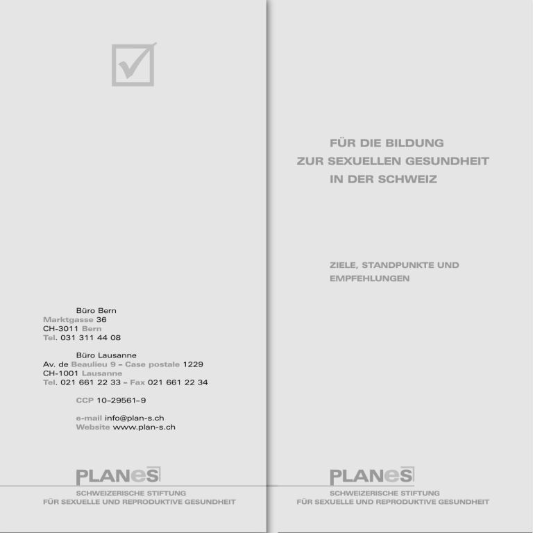 ! FÜR DIE BILDUNG ZUR SEXUELLEN GESUNDHEIT IN DER SCHWEIZ ZIELE, STANDPUNKTE UND EMPFEHLUNGEN Büro Bern Marktgasse 36 CH-3011 Bern Tel. 031 311 44 08 Büro Lausanne Av. de Beaulieu 9 – Case postale 1229 CH-1001 Lausanne Tel. 021 661 22 33 – Fax 021 661 22 34 CCP 10–29561– 9 e-mail info@plan-s.ch Website www.plan-s.ch PLANeS SCHWEIZERISCHE STIFTUNG FÜR SEXUELLE UND REPRODUKTIVE GESUNDHEIT PLANeS SCHWEIZERISCHE STIFTUNG FÜR SEXUELLE UND REPRODUKTIVE GESUNDHEIT Was PLANeS mit dieser Publikation möchte PLANeS – eine anerkannte Organisation von ExpertInnen Diese Publikation PLANeS ! ist als Beitrag von PLANeS, der Schweizerischen ! der gesamtschweizerische Dachverband Stiftung für sexuelle und reproduktive Gesundheit, zur schweizweiten Umsetzung von Bildung zur sexuellen Gesundheit zu verstehen; ! beschreibt Standpunkte und Empfehlungen für die Etablierung der Bildung zur sexuellen Gesundheit in der Schweiz; ! verdeutlicht Bedeutung, Notwendigkeit und Nutzen einer qualitativ hoch stehenden Bildung zur sexuellen Gesundheit für alle Menschen in allen Lebensphasen; ! informiert über die Fachlichkeit der in PLANeS organisierten Beratungs- und Fachstellen und begründet die Empfehlung ihrer Beteiligung in entsprechenden Bildungsangeboten; ! richtet sich als Orientierungshilfe in erster Linie an Bildungsverantwortliche und Entscheidungstragende in den verschiedenen gesellschaftlichen Arbeitsfeldern des Bildungs-, Gesundheits- und Sozialwesens. der Beratungsstellen für Familienplanung, Schwangerschaft, Sexualität und Sexualerziehung; ! parteipolitisch und konfessionell unabhängig; ! angetreten, die Förderung der sexuellen und reproduktiven Gesundheit sowie der damit verbundenen Rechte für die Bevölkerung umzusetzen; ! der Aufgabe verpflichtet, Respekt und Aufrechterhaltung des Anspruchs auf bestmögliche sexuelle und reproduktive Gesundheit, insbesondere in der freien Wahl von Angeboten und der Sicherstellung des Zugangs zu den damit verbundenen Leistungen für alle Menschen zu verwirklichen; ! befasst mit der Entwicklung und Förderung von Aus- und Weiterbildungen sowie der Qualitätssicherung für die Arbeitsfelder der sexuellen Gesundheit; ! Partnerorganisation des Bundesamtes für VERANTWORTLICH FÜR DIE HERAUSGABE PLANeS Schweizerische Stiftung für sexuelle und reproduktive Gesundheit MITARBEIT Catherine Agthe, Fausta Borsani, Bruno Bühlmann, Marina Costa, Anita Cotting, Caroline Jacot-Descombes, Daniel Kunz, Gilberte Voide Crettenand GRAFIK Chantal Esseiva DRUCK Imprigraf SA, Fribourg © 2010 PLANeS Gesundheit zu Themen der sexuellen Gesundheit; ! Schweizer Mitglied der IPPF (International Planned Parenthood Federation). 1. Ziele und Nutzen von Bildungsangeboten zu sexueller Gesundheit ZIELE UND NUTZEN VON BILDUNGSANGEBOTEN ZU SEXUELLER GESUNDHEIT Was ist sexuelle Gesundheit ? Die Weltgesundheitsorganisation (WHO) hat sie 2006 wie folgt definiert: «SEXUELLE GESUNDHEIT IST EIN ZUSTAND PHYSISCHEN, EMOTIONALEN, GEISTIGEN UND SOZIALEN WOHLBEFINDENS IN BEZUG AUF DIE SEXUALITÄT UND NICHT NUR DIE ABWESENHEIT VON KRANKHEIT, EINSCHRÄNKUNGEN ODER GEBRECHEN. SEXUELLE GESUNDHEIT ERFORDERT EINEN POSITIVEN UND RESPEKTVOLLEN UMGANG MIT SEXUALITÄT UND SEXUELLEN BEZIEHUNGEN. SEXUELLE GESUNDHEIT SCHLIESST DIE MÖGLICHKEIT VON BEFRIEDIGENDEN UND SICHEREN SEXUELLEN ERFAHRUNGEN FREI VON ZWANG, DISKRIMINIERUNG UND GEWALT MIT EIN. UM SEXUELLE GESUNDHEIT ZU ERREICHEN UND AUFRECHT ZU ERHALTEN, MÜSSEN DIE SEXUELLEN RECHTE ALLER MENSCHEN RESPEKTIERT, GESCHÜTZT UND DURCHGESETZT WERDEN.»1 Ethische Grundlage der Arbeit von PLANeS ist daher die Erklärung der sexuellen Rechte der IPPF2, die aus den Menschenrechten abgeleitet wurde. Sie ist ein Instrument der Einforderung sexualitätsbezogener Menschenrechte und beruht auf grundlegenden internationalen Menschenrechtsabkommen. Die rechtlichen Grundlagen für die Arbeit von PLANeS sind durch die nationale Gesetzgebung formuliert und bilden die Rahmenbedingungen des konkreten Handelns im Alltag. Die Tätigkeit von PLANeS zielt darauf, die in der nationalen Gesetzgebung verankerten Grundsätze umzusetzen: vor allem diejenigen betreffend die sexuelle Gesundheit und die Menschenrechte in Zusammenhang mit der Sexualität. Sexuelle Gesundheit schliesst in diesem Verständnis die reproduktive Gesundheit ein, d.h. die Fähigkeit zur Fortpflanzung allen Menschen zu ermöglichen, wie auch die Freiheit zu haben, sich zu entscheiden, ob, wann und wie viele Kinder sie haben möchten. PLANeS versteht unter der Verwirklichung des bestmöglichen Gesundheitsstandards, dass Menschen in jedem Lebensabschnitt, in eigener Verantwortung, informiert über ihr sexuelles und reproduktives Leben entscheiden können. Bildungsangebote, die auf faktenbasierten Informationen beruhen und zur kritischen Reflexion von Sexualität, Beziehungen und gesellschaftlichen Zusammenhängen anregen, stellen Entwicklungschancen für eindeutige Kommunikation, egalitäre Geschlechternormen und -beziehungen sowie ein Sexualleben frei von Zwang, Diskriminierung und Gewalt dar3 -4. Aktuelle Untersuchungen zeigen, dass der Zugang zu solchen Angeboten für Frauen, Männer und Jugendliche gleichbedeutend mit einem höheren sexuellen Wohlbefinden ist, in dem sie weniger anfällig für physische und psychische Beeinträchtigungen im Zusammenhang mit ihrer Sexualität und Partnerschaft sind5. 1. Erste Empfehlung PLANeS empfiehlt eine schweizweite Bereitstellung, Etablierung und Verankerung von Angeboten zur Bildung sexueller Gesundheit in den verschiedenen Institutionen der Kinder-, Jugend- und Erwachsenenbildung. Sie sollen in eine umfassende Strategie der Förderung sexueller Gesundheit eingebettet werden. Hierzu wird weiter empfohlen, Qualitätsstandards zu formulieren, die auf den sexuellen Rechten basieren, aktuelle wissenschaftliche Erkenntnisse einbeziehen und überprüfbar sind. PLANeS regt die Kooperation mit den in ihr organisierten Beratungs- und Fachstellen an6, um von ihrer vielfälti