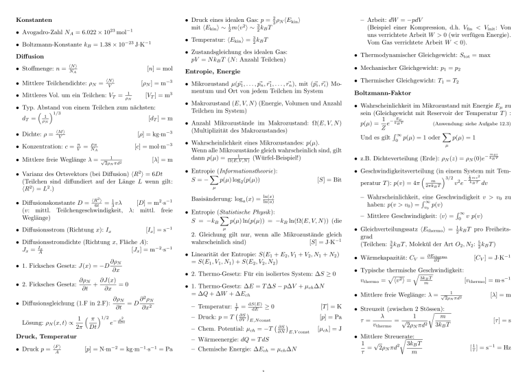 • Druck eines idealen Gas: p = 23 ρN hEkin i mit hEkin i ∼ 12 mhv 2 i ∼ 32 kB T Konstanten • Avogadro-Zahl NA = 6.022 × 1023 mol−1 • Temperatur: hEkin i = 23 kB T • Boltzmann-Konstante kB = 1.38 × 10−23 J·K−1 • Zustandsgleichung des idealen Gas: pV = N kB T (N : Anzahl Teilchen) Diffusion • Stoffmenge: n = hN i NA [n] = mol • Mittlere Teilchendichte: ρN = hN i V • Mittleres Vol. um ein Teilchen: VT = [ρN ] = m−3 1 ρN [VT ] = m3 • Typ. Abstand von einem Teilchen zum nächsten: 1/3 dT = ρ1N [dT ] = m • Dichte: ρ = hM i V • Konzentration: c = [ρ] = kg·m n V = ρN NA • Mittlere freie Weglänge λ = −3 [c] = mol·m−3 √ 1 2ρN πd2 [λ] = m • Varianz des Ortsvektors (bei Diffusion) hR2 i = 6Dt (Teilchen sind diffundiert auf der Länge L wenn gilt: hR2 i = L2 .) 2 • Diffusionskonstante D = hR6t i = 13 vλ [D] = m2 ·s−1 (v: mittl. Teilchengeschwindigkeit, λ: mittl. freie Weglänge) • Diffusionsstrom (Richtung x): Ix [Ix ] = s−1 • Diffusionsstromdichte (Richtung x, Fläche A): Jx = IAx [Jx ] = m−2 ·s−1 ∂ρN • 1. Ficksches Gesetz: J(x) = −D ∂x ∂J(x) ∂ρN + =0 • 2. Ficksches Gesetz: ∂t ∂x ∂ρN ∂ 2 ρN • Diffusionsgleichung (1.F in 2.F): =D ∂t ∂x2 1 π 1/2 − x2 Lösung: ρN (x, t) ∝ e 4Dt 2π Dt Druck, Temperatur • Druck p = – Arbeit: dW = −pdV (Beispiel einer Kompression, d.h. Vfin < Vinit : Von uns verrichtete Arbeit W > 0 (wir verfügen Energie). Vom Gas verrichtete Arbeit W < 0). hF i A • Mechanischer Gleichgewicht: p1 = p2 Entropie, Energie • Mikrozustand µ(p~1 , . . . , p~n , r~1 , . . . , r~n ), mit (~ pi , r~i ) Momentum und Ort von jedem Teilchen im System • Makrozustand (E, V, N ) (Energie, Volumen und Anzahl Teilchen im System) • Anzahl Mikrozustände im Makrozustand: Ω(E, V, N ) (Multiplizität des Makrozustandes) • Wahrscheinlichkeit eines Mikrozustandes: p(µ). Wenn alle Mikrozustände gleich wahrscheinlich sind, gilt 1 dann p(µ) = Ω(E,V,N ) (Würfel-Beispiel!) • Entropie X(Informationstheorie): p(µ) log2 (p(µ)) S=− [S] = Bit µ Basisänderung: loga (x) = ln(x) ln(a) • Entropie (Statistische Physik ): X S = −kB p(µ) ln(p(µ)) = −kB ln(Ω(E, V, N )) (die µ 2. Gleichung gilt nur, wenn alle Mikrozustände gleich wahrscheinlich sind) [S] = J·K−1 • Thermischer Gleichgewicht: T1 = T2 Boltzmann-Faktor • Wahrscheinlichkeit im Mikrozustand mit Energie Eµ zu sein (Gleichgewicht mit Reservoir der Temperatur T ) : 1 − Eµ p(µ) = e kB T (Anwendung: siehe Aufgabe 12.3) Z X R∞ Und es gilt 0 p(µ) = 1 oder p(µ) = 1 µ • z.B. Dichteverteilung (Erde): ρN (z) = ρN (0)e − kmgz T B • Geschwindigkeitsverteilung (in einem System mit Tem1 mv 2 3/2 −2 v 2 e kB T dv peratur T ): p(v) = 4π 2πkmB T – Wahrscheinlichkeit, Reine Geschwindigkeit v > v0 zu ∞ haben: p(v > v0 ) = v0 p(v) R∞ – Mittlere Geschwindigkeit: hvi = 0 v p(v) • Gleichverteilungssatz hEthermo i = 21 kB T pro Freiheitsgrad (Teilchen: 23 kB T , Molekül der Art O2 , N2 : 25 kB T ) • Linearität der Entropie: S(E1 + E2 , V1 + V2 , N1 + N2 ) = S(E1 , V1 , N1 ) + S(E2 , V2 , N2 ) • Wärmekapazität: CV = • 2. Thermo-Gesetz: Für ein isoliertes System: ∆S ≥ 0 • Typische thermischeqGeschwindigkeit: p BT vthermo = hv 2 i = 3km [vthermo ] = m·s−1 • 1. Thermo-Gesetz: ∆E = T ∆S − p∆V + µch ∆N = ∆Q + ∆W + ∆Ech – Temperatur: – Druck: p = T 1 T = dS(E) dE ≥0 [T ] = K ∂S ∂V [p] = Pa E,N const – Chem. Potential: µch = −T ∂S ∂N E,V const – Wärmeenergie: dQ = T dS [p] = N·m−2 = kg·m−1 ·s−1 = Pa • Thermodynamischer Gleichgewicht: Stot = max – Chemische Energie: ∆Ech = µch ∆N [µch ] = J ∂Ethermo ∂T • Mittlere freie Weglänge: λ = √ 1 2ρN πd2 • Streuzeit (zwischen 2 Stössen): r λ 1 m √ τ= = 2 vthermo 3k 2ρN πd BT • Mittlere Streuerate: r 1 √ 3kB T 2 = 2ρN πd τ m [CV ] = J·K−1 [λ] = m [τ ] = s [ τ1 ] = s−1 = Hz