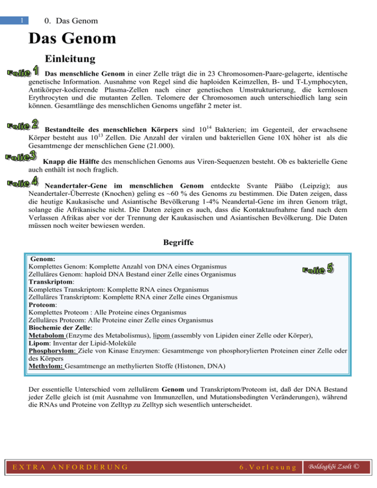 1 0. Das Genom Das Genom Einleitung Das menschliche Genom in einer Zelle trägt die in 23 Chromosomen-Paare-gelagerte, identische genetische Information. Ausnahme von Regel sind die haploiden Keimzellen, B- und T-Lymphocyten, Antikörper-kodierende Plasma-Zellen nach einer genetischen Umstrukturierung, die kernlosen Erythrocyten und die mutanten Zellen. Telomere der Chromosomen auch unterschiedlich lang sein können. Gesamtlänge des menschlichen Genoms ungefähr 2 meter ist. Bestandteile des menschlichen Körpers sind 1014 Bakterien; im Gegenteil, der erwachsene Körper besteht aus 1013 Zellen. Die Anzahl der viralen und bakteriellen Gene 10X höher ist als die Gesamtmenge der menschlichen Gene (21.000). Knapp die Hälfte des menschlichen Genoms aus Viren-Sequenzen besteht. Ob es bakterielle Gene auch enthält ist noch fraglich. Neandertaler-Gene im menschlichen Genom entdeckte Svante Pääbo (Leipzig); aus Neandertaler-Überreste (Knochen) geling es ~60 % des Genoms zu bestimmen. Die Daten zeigen, dass die heutige Kaukasische und Asiantische Bevölkerung 1-4% Neandertal-Gene im ihren Genom trägt, solange die Afrikanische nicht. Die Daten zeigen es auch, dass die Kontaktaufnahme fand nach dem Verlassen Afrikas aber vor der Trennung der Kaukasischen und Asiantischen Bevölkerung. Die Daten müssen noch weiter bewiesen werden. Begriffe Genom: Komplettes Genom: Komplette Anzahl von DNA eines Organismus Zelluläres Genom: haploid DNA Bestand einer Zelle eines Organismus Transkriptom: Komplettes Transkriptom: Komplette RNA eines Organismus Zelluläres Transkriptom: Komplette RNA einer Zelle eines Organismus Proteom: Komplettes Proteom : Alle Proteine eines Organismus Zelluläres Proteom: Alle Proteine einer Zelle eines Organismus Biochemie der Zelle: Metabolom (Enzyme des Metabolismus), lipom (assembly von Lipiden einer Zelle oder Körper), Lipom: Inventar der Lipid-Moleküle Phosphorylom: Ziele von Kinase Enzymen: Gesamtmenge von phosphorylierten Proteinen einer Zelle oder des Körpers Methylom: Gesamtmenge an methylierten Stoffe (Histonen, DNA) Der essentielle Unterschied vom zellulärem Genom und Transkriptom/Proteom ist, daß der DNA Bestand jeder Zelle gleich ist (mit Ausnahme von Immunzellen, und Mutationsbedingten Veränderungen), während die RNAs und Proteine von Zelltyp zu Zelltyp sich wesentlich unterscheidet. EXTRA ANFORDERUNG 6.Vorlesung Boldogkői Zsolt © 2 0. Das Genom „Omiken“ – Disziplinen der Genombiologie Die Nomenklatur der Genombiologie ist ein wenig chaotisch. Folgend sind die wichtigsten Interpretationen; die Genomik beschäftigt sich mit dem Genom. Genaugenommen beschäftigt sie sich mit der Struktur (Bestimmung von DNA Sequenzen, strukturelle Genomik) des Genoms. Im weiteren Sinne beinhaltet sie auch die Transkriptomik und manchmal auch die Proteomik (funktionelle Genomik). Transkriptomik (im engeren Sinne funktionelle Genomik) beschäftigt sich mit dem RNA gehalt einer Zelle/Organismus. Generell betrifft sich die Transkriptomik mit RNA gehalt in Erkrankten/behandelten Zellen/Geweben. Proteomik untersucht den Proteingehalt einer Zelle oder Gewebes. Untersucht Unterschiede in Proteinen in erkrankten/gesunden Zellen, behandelten/unbehandelten Zellen im Vergleich zu gesunden/normalen Zellen. Die neueste Labortechniken ermöglichen quantitative Bestimmung der Gesamt-RNA und-Protein einer einziger Zelle. Weitere Verteilung Genomik: Oftmals wird das gesamte Gebiet so benannt Strukturelle Genomik beschäftigt sich nicht mit der Funktion, sondern beschreibt und klassifiziert ausschliesslich DNA und DNA Elemente. Funktionelle Genomik: Veränderungen des Transkriptoms und Proteoms in: (1) verschiedene Zelltypen (2) erkrankte/gesunde Zellen (3) behandelte/unbehandelte Zellen Integrative Genomik/Interaktomik: Interaktion zwischen Elementen des Transkriptoms und Proteoms. Interaktionskarten: Netzwerke der interagierenden Elemente Bioinformatik: Computer-basierte Unterstützung bei der Behandlung gewaltiger Menge an Daten, statistische Auswertung Hefe Phosphorylom: Verwandtschaft zwischen Kinasen (Enzyme hängen Phosphategruppen an spezifische Proteine) und ihren Substraten. Kinasen spielen eine eminente Rolle in der Signaltransduktion wo sie aktivieren (seltener inhibieren). Hefe-Protein Interaktionskarten. Punkte beschreiben Proteine, Linien die Verbindungen zwischen Proteinen und deren Interaktionen. Interaktionsnetzwerke sind redundant. Ausfall eines Elementes zerstört nicht das ganze System unbedingt, da andere Proteine die ausfallene Funktion mehr oder weniger übernehmen können und minimalisieren die nachteilhafte Wirkung der Mutationen. Proteine können mit weniger oder mit einer Protein in Wechselwirkung eintreten, aber die s.g. Hubs stehen mit vielen Proteine in Wechselwirkung. Ausfall der Hub hat schwere Folgen. EXTRA ANFORDERUNG 6.Vorlesung Boldogkői Zsolt ©