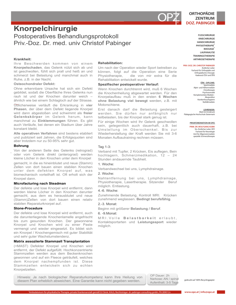 © Knorpelchirurgie Postoperatives Behandlungsprotokoll Priv.-Doz. Dr. med. univ Christof Pabinger Krankheit: Ihre Beschwerden kommen von einem Knorpelschaden, das Gelenk nützt sich ab und ist geschwollen, fühlt sich prall und heiß an und schmerzt bei Belastung und manchmal auch in Ruhe, z.B. in der Nacht. Osteochondraler Defekt: Ohne erkennbare Ursache hat sich ein Defekt gebildet, sodaß die Oberfläche Ihres Gelenks nun rauh ist und der Knochen darunter weich – ähnlich wie bei einem Schlagloch auf der Strasse. Üblicherweise verläuft die Erkrankung in vier Phasen, der über dem Defekt liegende Knorpel wird dann abgestoßen und schwimmt als freier Gelenkskörper im Gelenk herum, kann manchmal zu Einklemmungen führen. Es gibt auch Verläufe, bei denen ein Stadium über Jahre konstant bleibt. Alle operativen Verfahren sind bestens etabliert und publiziert seit Jahren, die Erfolgsquoten sind aber trotzdem nur zu 50-95% sehr gut. Bohrung Von der anderen Seite des Gelenks (retrograd) oder vom Gelenk direkt (anterograd) werden kleine Löcher in den Knochen unter dem Knorpel gemacht, in die es hineinblutet und neue (Stamm) Zellen von dort bauen einen stabilen Knochen unter dem defekten Knorpel auf, was biomechanisch vorteilhaft ist. Oft erholt sich der Knorpel dann. Microfacturing nach Steadman Der defekte und lose Knorpel wird entferrnt, dann werden kleine Löcher in den Knochen darunter gemacht, aus dem es herausblutet und neue (Stamm)Zellen von dort bauen einen relativ stabilen Reparaturknorpel auf. Stone-Procedure Der defekte und lose Knorpel wird entferrnt, auch die darunterliegende Knochenlamelle angefrischt bis zum gesunden Knochen. Der gewonnene Knorpel und Knochen wird zu einer Paste vermengt und wieder eingesetzt. Es bildet sich ein Knorpel / Knochengemisch mit guter Stabilität und sehr guter Wachstumstendenz. Matrix assoziierte Stammzell Transplantation (=MAST) Defekter Knorpel und Knochen wird entferrnt, der Defekt aufgefüllt. Hochkonzentrierte Stammzellen werden aus dem Beckenknochen gewonnen und auf ein Fleece geträufelt, welches dem Knorpel nachempfunden ist. Diese Stammzellen entwickeln sich zu echten Knorpelzellen. FUSSCHIRURGIE KNIECHIRURGIE HANDCHIRURGIE PHYSIOTHERAPIE* MASSAGE* LAUFANALYSE TRAININGSTHERAPIE ARTHROSETHERAPIE Rehabilitation: Um nach der Operation wieder Sport betreiben zu können, folgt auf die Operation eine Serie Physiotherapie, die von mir extra für die Rehabilitation entwickelt wurde. Spezifischer postoperativer Verlauf: Wenn Knochen durchtrennt wird, muß 6 Wochen die Knochenheilung abgewartet werden. Für den Knorpelaufbau muß in den ersten 6 Wochen ohne Belastung viel bewegt werden, z.B. mit Motorschiene. Erst danach darf die Belastung gesteigert werden. Sie dürfen nur anfänglich nur teilbelasten, bis der Knorpel stark genug ist. Für einige Wochen wird Ihr Gelenk geschwollen sein, gelegentlich auch dauerhaft, z.B. bei Umstellung im Oberschenkel. Bis zur Wiederherstellung der Kraft werden Sie mit 3-6 Monaten Aufbautraining rechnen müssen. Tag 1-3: Verband mit Tupfer, 2 Krücken, Eis auflegen, Bein hochlagern, Schmerzmedikation, 12 – 24 Stunden andauernde Taubheit. 1. Woche: Verbandwechsel bei uns, Lymphdrainage. 2. Woche: Nahtentfernung bei uns, Lymphdrainage, Physiotherapie, Lasertherapie. Sitzender Beruf möglich. Entlastung. 4.-6. Woche: Zunehmende Belastung, Kontroll MRI. Krücken zunehmend weglassen. Bedingt berufsfähig. 2.-3. Monat: Beginn mit größerer Belastung / Beruf. 6. -9.Monat: M R I . Vo l l e B e l a s t b a r k e i t e r l a u b t , Kontaktsportarten und Leistungssport wieder möglich. Hinweis: Je nach biologischer Reparaturkompetenz kann Ihre Heilung von diesem Plan erheblich abweichen. Eine Garantie kann nicht gegeben werden. PRIV.-DOZ. DR. CHRISTOF PABINGER Ärztlicher Leiter Facharzt für Orthopädie und Orthopädische Chirurgie Kaderarzt ÖSV und ÖFB ÖÄK - DIPLOME: Sportmedizin Alpin- und Höhenmedizin Chirotherapie Psychosomatik Komplementäre Medizin Akupunktur Krankenhaushygiene Notfallmedizin LEHRENDER: Med Uni Innsbruck Pädagogische Hochschule Steiermark PRIVATORDINATION IM OPZ: PRIM. DR. WOLFGANG KUBIK Stv. Ärztlicher Leiter OPZ Facharzt für Neurologie Arzt für Allgemeinmedizin spezielle Schmerztherapie OPZ GRAZ* Plüddemanngasse 45 A-8010 Graz T +43 316 90 82 04 0 F +43 316 90 82 04 20 GESUNDHEITSZENTRUM PARKHOTEL IGLS Igler Straße 51 A-6080 Innsbruck / Igls T +43 699 / 19 08 20 40 F +43 0316 / 90 82 04-20 Mitglied als erstes steirisches Gesundheitsunternehmen OP Dauer: 2h Narkose: AN / spinal Aufenthalt: 3-5 Tage Ambulatorium für physikalische Therapie, private Krankenanstalt gemäß §3 Stmk. KALG, Rechtsträger: dr. pabinger consulting gmbh, FN 289012v * ORTHOPÄDIE ZENTRUM DOZ. PABINGER proEthik gedruckt auf 100% Recyclingpapier www.opz.at | info@opz.at