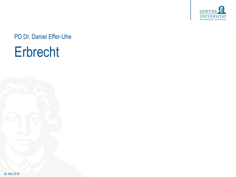 PD Dr. Daniel Effer-Uhe Erbrecht 24. Mai 2016 Erbrecht Gewillkürte Erbfolge Widerruf von Testamenten Widerrufsmöglichkeiten Widerrufstestament, §§ 2253, 2254 Widerruf durch Vernichtung oder Veränderung, §§ 2253, 2255 Widerruf durch Rücknahme aus amtlicher Verwahrung, §§ 2253, 2256 Widerruf durch späteres, widersprechendes Testament, §§ 2253, 2258 Beispiel: Erblasser E testiert im Januar 2014 folgendermaßen: „Mein Sohn S soll mein Alleinerbe sein“. Nachdem er Ende 2014 erneut geheiratet hat, errichtet er im Februar 2015 formwirksam ein neues Testament, in dem er testiert: „Meine Frau F soll Erbin zu ½ sein.“ Weitere Verfügungen enthält das neue Testament nicht. Im März 2016 errichtet er ein weiteres Testament, in dem es heißt „Mein Tischtennisverein T erhält ein Vermächtnis von 1.000 EUR.“ 24. Mai 2016 2 Erbrecht Gewillkürte Erbfolge Widerruf von Testamenten Beispiel (nach Leipold, Erbrecht, 20. Aufl. 2014, S. 125): Der verwitwete Werner (W) hat zwei Söhne, Martin (M) und Franz (F) sowie eine Tochter Odette (O), bei der er seit einiger Zeit wohnt. Am 1.6.2013 errichtet W ein formgültiges eigenhändiges Testament, in dem er O zur alleinigen Erbin einsetzt. Dieses Testament zeigte er auch seiner Tochter. Zum nächsten Weihnachtsfest bekam W von seinen Söhnen eine Kiste besten französischen Rotweins geschenkt, von der Tochter dagegen nur ein kleines Buch über den Glauben im Alter. W nahm die unterschiedlichen Weihnachtsgeschenke zum Anlass, am 26.12.2013 ein neues formgültiges Testament niederzuschreiben, in dem er M und F jeweils hälftig zu Erben einsetzte. Als O davon erfuhr, machte sie ihrem Vater heftige Vorwürfe. In einer eigenhändig geschriebenen und unterschriebenen Erklärung vom 15.2.2014 erklärte W daher, er hebe das Testament vom 26.12.2013 auf. Im April 2014 verstirbt W. Bei der Durchsicht seiner Sachen findet man die Erklärung vom 15.2.2014 in fünf Teile auseinandergerissen im Papierkorb des Erblassers; wie sie dorthin gekommen ist, lässt sich nicht sicher feststellen. Wie ist die Erbfolge nach W zu beurteilen? 24. Mai 2016 3 Erbrecht Gewillkürte Erbfolge Widerruf von Testamenten Widerrufsmöglichkeiten Widerrufstestament, §§ 2253, 2254 24. Mai 2016 Widerruf durch Vernichtung oder Veränderung, §§ 2253, 2255 Widerruf durch Rücknahme aus amtlicher Verwahrung, §§ 2253, 2256 Widerruf durch späteres, widersprechendes Testament, §§ 2253, 2258 4 Erbrecht Gewillkürte Erbfolge Typenzwang für den zulässigen Inhalt letztwilliger Verfügungen: Der Erblasser kann nur solche Verfügungen wirksam treffen, die ihrer Art nach im Gesetz ausdrücklich erwähnt werden oder deren Zulässigkeit jedenfalls durch Auslegung oder Analogie aus dem Gesetz abgeleitet werden kann. Wichtigste testamentarisch mögliche Verfügungen: die Bestimmung des Erben (Benennung von Erben und deren Erbanteil, § 1937, Ausschluss bestimmter Personen von der gesetzlichen Erbfolge, § 1938; Einsetzung von Ersatzerben, § 2096, und Nacherben, § 2100) Vermächtnisse (§ 1939) Auflagen (§ 1940) Anordnungen für die Nachlassabwicklung (Teilungsanordnung, § 2048; Testamentsvollstreckung, § 2197; Vorsehung eines Schiedsgerichts für Konflikte zwischen den Erben, § 1066 ZPO) Pflichtteilsentziehung bei bestimmten schweren Verfehlungen des Pflichtteilsberechtigten (§ 2336) Bestimmte familienrechtliche Anordnungen (z.B. Vormundbenennung, § 1777) Widerruf letztwilliger Verfügungen (§ 2254) Errichtung einer Stiftung (§ 83) 24. Mai 2016 5 Erbrecht Gewillkürte Erbfolge Auslegung eines Testaments bestimmt sich grundsätzlich nach den allgemeinen Regeln über die Auslegung einer Willenserklärung viele Sonderregelungen, die den allgemeinen Regeln vorgehen grundsätzlich Ermittlung des wirklichen Willens des Erblassers (§ 133, „erklärende Auslegung“) keine normative Auslegung aus der Sicht eines objektiven Erklärungsempfängers aufgrund von § 157, da es keinen schutzwürdigen Erklärungsempfänger gibt hypothetischer Wille relevant, wenn der wirkliche Wille zwar feststeht, aber von unzutreffenden Motiven beeinflusst war, oder wenn das Erklärte aufgrund von Änderungen der Umstände nicht mehr realisierbar ist („ergänzende Auslegung“) Problem: Selbst wenn der Wille ermittelt ist, muss er auch formgerecht vom Erblasser erklärt sein. H.M.: Andeutungstheorie: das Gemeinte muss in der formbedürftigen Willenserklärung zumindest angedeutet sein; str. Faustformel: Die erläuternde Auslegung fragt bei Verfügungen mehrdeutigen Inhalts: Was hat der Erblasser mit diesen Worten sagen wollen? Die ergänzende Auslegung fragt bei unvollständigen Verfügungen: Was hätte der Erblasser erklärt, wenn er von diesem Umstand gewusst hätte? 24. Mai 2016 6 Erbrecht Gewillkürte Erbfolge Beispielsfall (nach Lipp, Examensrepetitorium Erbrecht, 3. Aufl. 2013, Rdnr. 257 ff.): E hinterlässt folgendes formwirksam errichtete Testament: "Nach meinem Tod soll Mutter alles gehören. Mein Skatbruder B soll den italienischen Intarsientisch erhalten." Nach dem Tod des E verlangt seine Mutter M Herausgabe der Erbschaft. Die Witwe des E, W, verweigert dies mit dem zutreffenden Hinweis, ihr Mann habe - seit die Kinder größer wurden - stets sie als "Mutter" bezeichnet, während seine Mutter in der Familie als "Oma" angesprochen wurde. Ferner stellt sich anhand der Tagebuchaufzeichnungen des E heraus, dass E dem zweiten Skatbruder D deshalb nichts vermacht hat, weil er ihn für den Dieb einer teuren Cognacflasche hielt. Tatsächlich hatte B die Flasche "mitgehen" lassen. Wie ist die erbrechtliche Lage? 24. Mai 2016 7 Erbrecht Gewillkürte Erbfolge Beispiel (nach Lange, Erbrecht, 2011, S. 340): Die Eheleute M und F erklären in ihrem gemeinschaftlichen Testament: „Wir setzen unsere gemeinsamen Kinder je zur Hälfte als Erben ein.“ Tatsächlich wollten sie sich jedoch gegenseitig zu Alleinerben und ihre Kinder zu Erben des zuletzt versterbenden Ehegatten einsetzen, wie sich aufgrund e