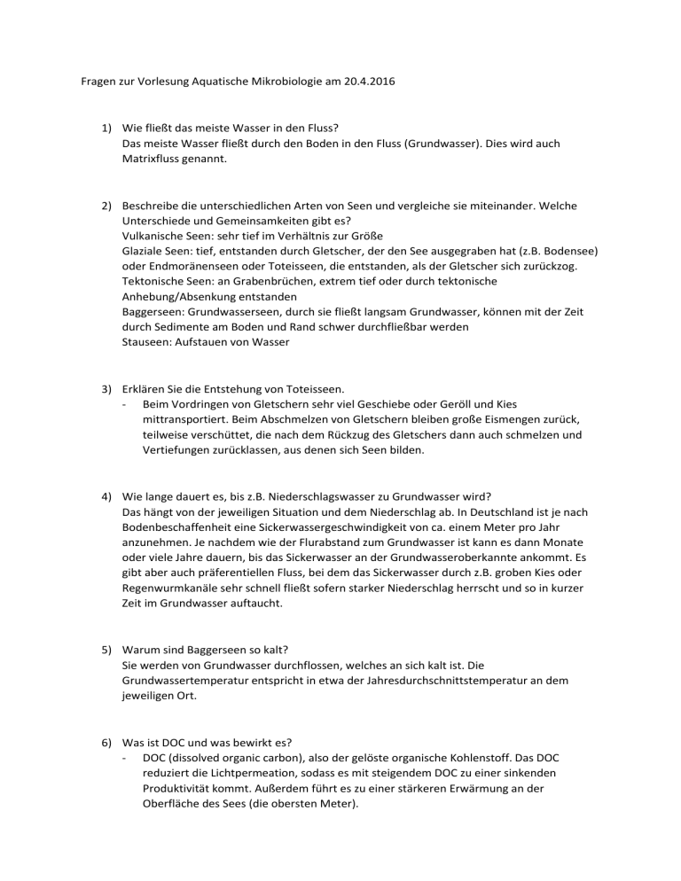 Fragen zur Vorlesung Aquatische Mikrobiologie am 20.4.2016 1) Wie fließt das meiste Wasser in den Fluss? Das meiste Wasser fließt durch den Boden in den Fluss (Grundwasser). Dies wird auch Matrixfluss genannt. 2) Beschreibe die unterschiedlichen Arten von Seen und vergleiche sie miteinander. Welche Unterschiede und Gemeinsamkeiten gibt es? Vulkanische Seen: sehr tief im Verhältnis zur Größe Glaziale Seen: tief, entstanden durch Gletscher, der den See ausgegraben hat (z.B. Bodensee) oder Endmoränenseen oder Toteisseen, die entstanden, als der Gletscher sich zurückzog. Tektonische Seen: an Grabenbrüchen, extrem tief oder durch tektonische Anhebung/Absenkung entstanden Baggerseen: Grundwasserseen, durch sie fließt langsam Grundwasser, können mit der Zeit durch Sedimente am Boden und Rand schwer durchfließbar werden Stauseen: Aufstauen von Wasser 3) Erklären Sie die Entstehung von Toteisseen. - Beim Vordringen von Gletschern sehr viel Geschiebe oder Geröll und Kies mittransportiert. Beim Abschmelzen von Gletschern bleiben große Eismengen zurück, teilweise verschüttet, die nach dem Rückzug des Gletschers dann auch schmelzen und Vertiefungen zurücklassen, aus denen sich Seen bilden. 4) Wie lange dauert es, bis z.B. Niederschlagswasser zu Grundwasser wird? Das hängt von der jeweiligen Situation und dem Niederschlag ab. In Deutschland ist je nach Bodenbeschaffenheit eine Sickerwassergeschwindigkeit von ca. einem Meter pro Jahr anzunehmen. Je nachdem wie der Flurabstand zum Grundwasser ist kann es dann Monate oder viele Jahre dauern, bis das Sickerwasser an der Grundwasseroberkannte ankommt. Es gibt aber auch präferentiellen Fluss, bei dem das Sickerwasser durch z.B. groben Kies oder Regenwurmkanäle sehr schnell fließt sofern starker Niederschlag herrscht und so in kurzer Zeit im Grundwasser auftaucht. 5) Warum sind Baggerseen so kalt? Sie werden von Grundwasser durchflossen, welches an sich kalt ist. Die Grundwassertemperatur entspricht in etwa der Jahresdurchschnittstemperatur an dem jeweiligen Ort. 6) Was ist DOC und was bewirkt es? - DOC (dissolved organic carbon), also der gelöste organische Kohlenstoff. Das DOC reduziert die Lichtpermeation, sodass es mit steigendem DOC zu einer sinkenden Produktivität kommt. Außerdem führt es zu einer stärkeren Erwärmung an der Oberfläche des Sees (die obersten Meter). 7) Welchen Einfluss bzw. welche Bedeutung hat DOC (dissolved organic carbon) auf Seen ? - signifikante Reduktion der Lichtpermeation - Erhöhung der Erwärmung in den obersten Schichten 8) 1. 2. 3. Erkläre wie man Flüsse in 1., 2. und 3. Ordnung unterteilt. Ordnung : keine Zuflüsse Ordnung : Fluss aus mindestens 2 Flüssen 1. Ordnung Ordnung : Fluss aus mindestens 2 Flüssen 2. Ordnung 9) Welcher Fließweg ist schneller: der Matrixfluss oder der preferentielle Fließweg ? Der preferentielle Fließweg ist schneller. Grund dafür sind Regenwurmkanäle und Risse in der Sedimentschicht, welche eine schnelle Versickerung begünstigen. 10) Welche Arten von Wasserabfluss und Wasserversickerung gibt es und wie ist die Geschwindigkeitsbeziehung ? - durch Versickerung gelangt das meiste Wasser in den Fluss (sehr langsam) - Oberflächenabfluss ist nicht so häufig aber auch sehr schnell - Matrixabfluss durch Sedimente ist sehr langsam - preferentielle Fließwege sind sehr viel schneller Fließt schneller auf Grund von Regenwurmkanälen, Trockenrissen und grobkörnigen Sedimentschichten mit hoher hydraulischer Leitfähigkeit 11) Wie können Baggerseen ohne sichtbare Zu- oder Abflüsse weiterbestehen? Baggerseen werden vom Grundwasser durchflossen, deswegen nennt man sie auch Grundwasserseen. 12) Was ist ein produktiver See, welcher ist produktiver, tief oder flach ? Warum ? Ein produktiver See ist ein See, wo genügend Sonnenlicht als Energiequelle vorhanden ist, damit Photosynthese stattfinden kann. Ein flacher See ist produktiver, weil das Sonnenlicht dort den kompletten See abdeckt. Bei einem tiefen See reicht das Sonnenlicht nicht bis auf den Grund, wodurch relativ gesehen pro Volumen weniger Photosynthese stattfindet. Flache Seen erwärmen sich schneller. 13) Nach welchen Kriterien lassen sich Seen morphologisch beschreiben ? Tiefe, Länge, Breite 14) Was ist ein Toteissee und wie entsteht so einer ? Ein Toteissee entsteht wenn ein Gletscher sich zurückzieht und dabei größere Eisbrocken im Sediment zurück bleiben und sich durch Schmelzen in eine See verwandeln. 15) Wie lassen sich die unterschiedlichen Temperaturen in den 3 Schichten in einem See erklären? Die drei Schichten sind: Nährschicht, Sprungschicht und Zehrschicht. Limnologisch heißen sie Epilimnion, Metalimnion, Hypolimnion. Im Sommer wird das Epilimnion stark erwärmt. Dadurch bilden sich die drei Kompartimente aus. Jede Schicht weist eine unterschiedliche Dichte auf. Dadurch wird die Mischung verhindert bis das Epilimnion wieder signifikant abkühlt und die Stratifizierung durch Wind aufgebrochen wird. 16) In welchen Seen ist die Produktivität am höchsten? Erklären Sie warum. In flachen, Seen mit hohem Nährstoffgehalt ist die Produktivität am höchsten, da diese Bedingungen für eine maximale Photosyntheseproduktion ideal sind. Es ist genug Licht vorhanden und alle Organismen können das Maximum ihrer Produktivität erreichen. Flache Seen erwärmen sich relativ schnell und können somit produktiver sein. 17) Wie entsteht ein Fluss 4. Ordnung? Ein Fluss 4ter Ordnung entsteht durch den Zusammenfluss zweier Flüsse dritter Ordnung (3+34) 18) Wie entstehen besonders tiefe Seen? Besonders tiefe Seen entstehen durch tektonische Aktivitäten wie z.B. Grabenbrüche. Weiterhin entstehen sehr tiefe Seen durch Gletscher (z.B. Bodensee) 19) Warum steigt das Flusswasser bei starken Regefällen stark an, obwohl es nur von alten Grundwasser gespeist wird? Bei starken Regenfällen versickert das Regenwasser in den Boden und „drückt“ das schon vorhandene Grundwasser in den Fluss. Dieses „alte“ Grundwa