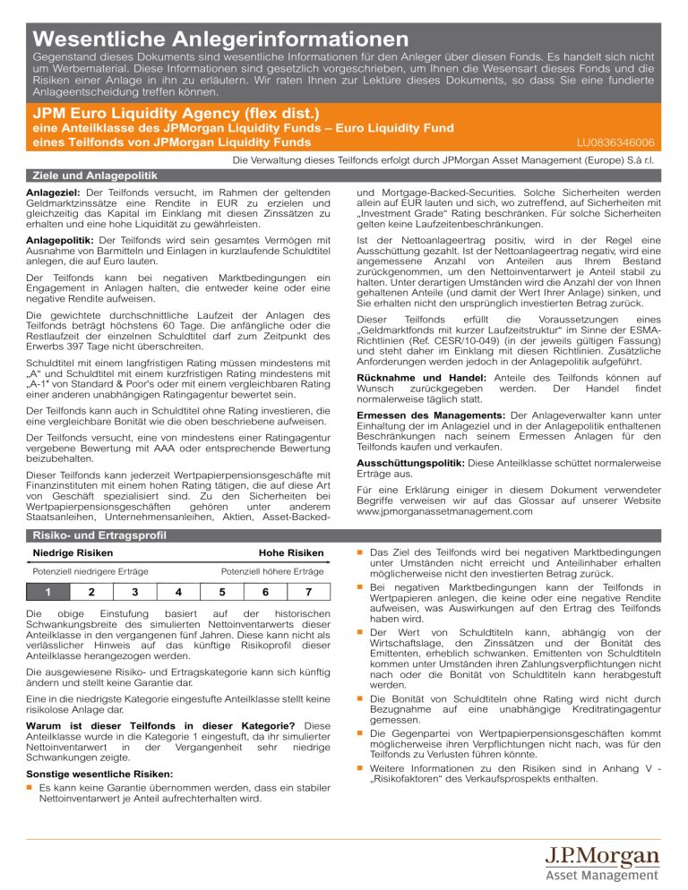 Wesentliche Anlegerinformationen Gegenstand dieses Dokuments sind wesentliche Informationen für den Anleger über diesen Fonds. Es handelt sich nicht um Werbematerial. Diese Informationen sind gesetzlich vorgeschrieben, um Ihnen die Wesensart dieses Fonds und die Risiken einer Anlage in ihn zu erläutern. Wir raten Ihnen zur Lektüre dieses Dokuments, so dass Sie eine fundierte Anlageentscheidung treffen können. JPM Euro Liquidity Agency (flex dist.) eine Anteilklasse des JPMorgan Liquidity Funds – Euro Liquidity Fund eines Teilfonds von JPMorgan Liquidity Funds LU0836346006 Die Verwaltung dieses Teilfonds erfolgt durch JPMorgan Asset Management (Europe) S.à r.l. Ziele und Anlagepolitik Anlageziel: Der Teilfonds versucht, im Rahmen der geltenden Geldmarktzinssätze eine Rendite in EUR zu erzielen und gleichzeitig das Kapital im Einklang mit diesen Zinssätzen zu erhalten und eine hohe Liquidität zu gewährleisten. und Mortgage-Backed-Securities. Solche Sicherheiten werden allein auf EUR lauten und sich, wo zutreffend, auf Sicherheiten mit „Investment Grade“ Rating beschränken. Für solche Sicherheiten gelten keine Laufzeitenbeschränkungen. Anlagepolitik: Der Teilfonds wird sein gesamtes Vermögen mit Ausnahme von Barmitteln und Einlagen in kurzlaufende Schuldtitel anlegen, die auf Euro lauten. Ist der Nettoanlageertrag positiv, wird in der Regel eine Ausschüttung gezahlt. Ist der Nettoanlageertrag negativ, wird eine angemessene Anzahl von Anteilen aus Ihrem Bestand zurückgenommen, um den Nettoinventarwert je Anteil stabil zu halten. Unter derartigen Umständen wird die Anzahl der von Ihnen gehaltenen Anteile (und damit der Wert Ihrer Anlage) sinken, und Sie erhalten nicht den ursprünglich investierten Betrag zurück. Der Teilfonds kann bei negativen Marktbedingungen ein Engagement in Anlagen halten, die entweder keine oder eine negative Rendite aufweisen. Die gewichtete durchschnittliche Laufzeit der Anlagen des Teilfonds beträgt höchstens 60 Tage. Die anfängliche oder die Restlaufzeit der einzelnen Schuldtitel darf zum Zeitpunkt des Erwerbs 397 Tage nicht überschreiten. Schuldtitel mit einem langfristigen Rating müssen mindestens mit „A“ und Schuldtitel mit einem kurzfristigen Rating mindestens mit „A-1" von Standard & Poor's oder mit einem vergleichbaren Rating einer anderen unabhängigen Ratingagentur bewertet sein. Der Teilfonds kann auch in Schuldtitel ohne Rating investieren, die eine vergleichbare Bonität wie die oben beschriebene aufweisen. Der Teilfonds versucht, eine von mindestens einer Ratingagentur vergebene Bewertung mit AAA oder entsprechende Bewertung beizubehalten. Dieser Teilfonds kann jederzeit Wertpapierpensionsgeschäfte mit Finanzinstituten mit einem hohen Rating tätigen, die auf diese Art von Geschäft spezialisiert sind. Zu den Sicherheiten bei Wertpapierpensionsgeschäften gehören unter anderem Staatsanleihen, Unternehmensanleihen, Aktien, Asset-Backed- Dieser Teilfonds erfüllt die Voraussetzungen eines „Geldmarktfonds mit kurzer Laufzeitstruktur“ im Sinne der ESMARichtlinien (Ref. CESR/10-049) (in der jeweils gültigen Fassung) und steht daher im Einklang mit diesen Richtlinien. Zusätzliche Anforderungen werden jedoch in der Anlagepolitik aufgeführt. Rücknahme und Handel: Anteile des Teilfonds können auf Wunsch zurückgegeben werden. Der Handel findet normalerweise täglich statt. Ermessen des Managements: Der Anlageverwalter kann unter Einhaltung der im Anlageziel und in der Anlagepolitik enthaltenen Beschränkungen nach seinem Ermessen Anlagen für den Teilfonds kaufen und verkaufen. Ausschüttungspolitik: Diese Anteilklasse schüttet normalerweise Erträge aus. Für eine Erklärung einiger in diesem Dokument verwendeter Begriffe verweisen wir auf das Glossar auf unserer Website www.jpmorganassetmanagement.com Risiko- und Ertragsprofil Niedrige Risiken Hohe Risiken Potenziell niedrigere Erträge 1 2 3 Q Potenziell höhere Erträge 4 5 6 7 Die obige Einstufung basiert auf der historischen Schwankungsbreite des simulierten Nettoinventarwerts dieser Anteilklasse in den vergangenen fünf Jahren. Diese kann nicht als verlässlicher Hinweis auf das künftige Risikoprofil dieser Anteilklasse herangezogen werden. Q Q Die ausgewiesene Risiko- und Ertragskategorie kann sich künftig ändern und stellt keine Garantie dar. Eine in die niedrigste Kategorie eingestufte Anteilklasse stellt keine risikolose Anlage dar. Warum ist dieser Teilfonds in dieser Kategorie? Diese Anteilklasse wurde in die Kategorie 1 eingestuft, da ihr simulierter Nettoinventarwert in der Vergangenheit sehr niedrige Schwankungen zeigte. Sonstige wesentliche Risiken: Q Es kann keine Garantie übernommen werden, dass ein stabiler Nettoinventarwert je Anteil aufrechterhalten wird. Q Q Q Das Ziel des Teilfonds wird bei negativen Marktbedingungen unter Umständen nicht erreicht und Anteilinhaber erhalten möglicherweise nicht den investierten Betrag zurück. Bei negativen Marktbedingungen kann der Teilfonds in Wertpapieren anlegen, die keine oder eine negative Rendite aufweisen, was Auswirkungen auf den Ertrag des Teilfonds haben wird. Der Wert von Schuldtiteln kann, abhängig von der Wirtschaftslage, den Zinssätzen und der Bonität des Emittenten, erheblich schwanken. Emittenten von Schuldtiteln kommen unter Umständen ihren Zahlungsverpflichtungen nicht nach oder die Bonität von Schuldtiteln kann herabgestuft werden. Die Bonität von Schuldtiteln ohne Rating wird nicht durch Bezugnahme auf eine unabhängige Kreditratingagentur gemessen. Die Gegenpartei von Wertpapierpensionsgeschäften kommt möglicherweise ihren Verpflichtungen nicht nach, was für den Teilfonds zu Verlusten führen könnte. Weitere Informationen zu den Risiken sind in Anhang V „Risikofaktoren“ des Verkaufsprospekts enthalten. Kosten Einmalige Kosten vor und nach der Anlage Ausgabeaufschläge Keine Rücknahmeabschläge (Max.) Keine (falls fällig) Q Dabei handelt es sich um den Höchstbetrag,