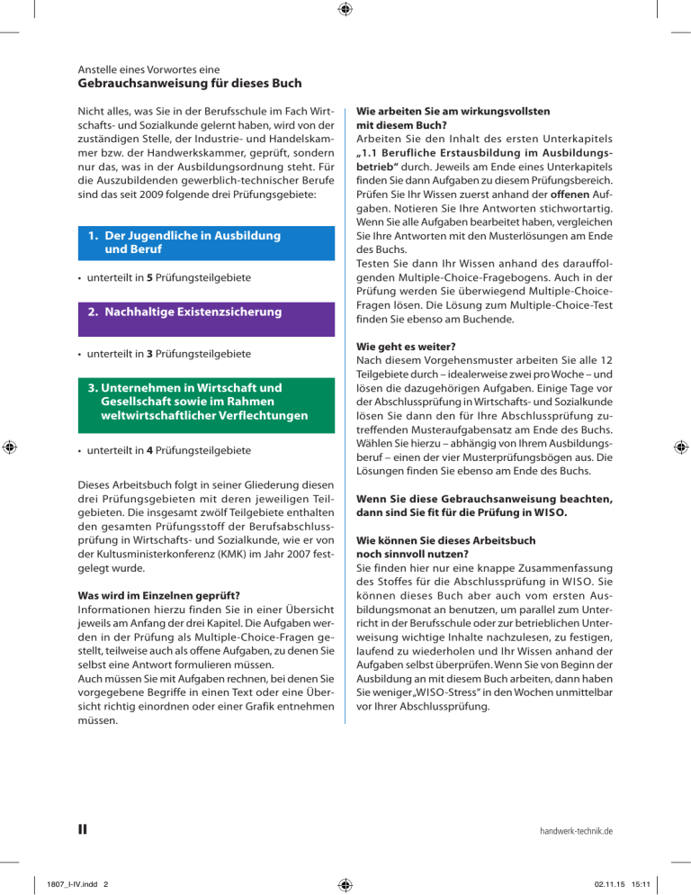 Anstelle eines Vorwortes eine Gebrauchsanweisung für dieses Buch Nicht alles, was Sie in der Berufsschule im Fach Wirtschafts- und Sozialkunde gelernt haben, wird von der zuständigen Stelle, der Industrie- und Handelskammer bzw. der Handwerkskammer, geprüft, sondern nur das, was in der Ausbildungsordnung steht. Für die Auszubildenden gewerblich-technischer Berufe sind das seit 2009 folgende drei Prüfungsgebiete: 1. Der Jugendliche in Ausbildung und Beruf • unterteilt in 5 Prüfungsteilgebiete 2. Nachhaltige Existenzsicherung • unterteilt in 3 Prüfungsteilgebiete 3. Unternehmen in Wirtschaft und Gesellschaft sowie im Rahmen weltwirtschaftlicher Verflechtungen • unterteilt in 4 Prüfungsteilgebiete Dieses Arbeitsbuch folgt in seiner Gliederung diesen drei Prüfungsgebieten mit deren jeweiligen Teil­ gebieten. Die insgesamt zwölf Teilgebiete enthalten den gesamten Prüfungsstoff der Berufsabschluss­ prüfung in Wirtschafts- und Sozialkunde, wie er von der Kultusministerkonferenz (KMK) im Jahr 2007 festgelegt wurde. Was wird im Einzelnen geprüft? Informationen hierzu finden Sie in einer Übersicht ­jeweils am Anfang der drei Kapitel. Die Aufgaben werden in der Prüfung als Multiple-Choice-Fragen gestellt, teilweise auch als offene Aufgaben, zu denen Sie selbst eine Antwort formulieren müssen. Auch müssen Sie mit Aufgaben rechnen, bei denen Sie vorgegebene Begriffe in einen Text oder eine Übersicht richtig einordnen oder einer Grafik entnehmen müssen. II 1807_I-IV.indd 2 Wie arbeiten Sie am wirkungsvollsten mit diesem Buch? Arbeiten Sie den Inhalt des ersten Unterkapitels „1.1 Berufliche Erstausbildung im Ausbildungs­ betrieb“ durch. Jeweils am Ende eines Unterkapitels finden Sie dann Aufgaben zu diesem Prüfungsbereich. Prüfen Sie Ihr Wissen zuerst anhand der offenen Aufgaben. Notieren Sie Ihre Antworten stichwortartig. Wenn Sie alle Aufgaben bearbeitet haben, vergleichen Sie Ihre Antworten mit den Musterlösungen am Ende des Buchs. Testen Sie dann Ihr Wissen anhand des darauffolgenden Multiple-Choice-Fragebogens. Auch in der Prüfung werden Sie überwiegend Multiple-ChoiceFragen lösen. Die Lösung zum Multiple-Choice-Test finden Sie ebenso am Buchende. Wie geht es weiter? Nach diesem Vorgehensmuster arbeiten Sie alle 12 Teilgebiete durch – idealerweise zwei pro Woche – und lösen die dazugehörigen Aufgaben. Einige Tage vor der Abschlussprüfung in Wirtschafts- und Sozialkunde lösen Sie dann den für Ihre Abschlussprüfung zu­ treffenden Musteraufgabensatz am Ende des Buchs. Wählen Sie hierzu – abhängig von Ihrem Ausbildungsberuf – einen der vier Musterprüfungsbögen aus. Die Lösungen finden Sie ebenso am Ende des Buchs. Wenn Sie diese Gebrauchsanweisung beachten, dann sind Sie fit für die Prüfung in WISO. Wie können Sie dieses Arbeitsbuch noch sinnvoll nutzen? Sie finden hier nur eine knappe Zusammenfassung des Stoffes für die Abschlussprüfung in WISO. Sie ­k önnen dieses Buch aber auch vom ersten Aus­ bildungsmonat an benutzen, um parallel zum Unterricht in der Berufsschule oder zur betrieblichen Unterweisung wichtige Inhalte nachzulesen, zu festigen, laufend zu wiederholen und Ihr Wissen anhand der Aufgaben selbst überprüfen. Wenn Sie von Beginn der Ausbildung an mit diesem Buch arbeiten, dann haben Sie weniger „WISO-Stress“ in den Wochen unmittelbar vor Ihrer Abschlussprüfung. handwerk-technik.de 02.11.15 15:11 Prüfungsgebiet Themenbereiche Prüfungsinhalte In der Abschlussprüfung WISO müssen Sie im Prüfungsgebiet „Der Jugendliche in Ausbildung und Beruf“ Aufgaben zu folgenden Bereichen bearbeiten: Präsentation des Ausbildungsbetriebs, Rechtsrahmen von Ausbildung und Berufstätigkeit • Der Ausbildungsbetrieb in der Branche und der Gesamtwirtschaft • Wandel von Berufen • Berufsausbildungsvertrag • Berufsbildungsgesetz, Handwerksordnung • Arbeitsvertrag Rechte und Pflichten der Beteiligten • Arbeitsrecht und -schutz • Arbeitsgerichtsbarkeit Möglichkeiten und Grenzen betrieblicher Mitbestimmung • Arbeitgeberverbände • Gewerkschaften • Tarifrecht und Tarifverträge • Betriebsrat, Jugend- und Auszubildendenvertretung Lebenslanges Lernen, Wandel der Arbeitswelt • Berufliche Fortbildung und Umschulung • Staatliche Fördermaßnahmen • Mobilität und Flexibilität Leben, Lernen und Arbeiten in Europa • Europass und Mobilitätsprogramme • Europäische Sozialcharta 1.1Berufliche Erstausbildung im Ausbildungsbetrieb 1.1.1Der Ausbildungsbetrieb in der Wirtschaft – ein Mosaikstein unter vielen Sie haben vor Kurzem eine gewerbliche Ausbildung in einem Betrieb begonnen – oder Sie stehen am Ende Ihrer Berufsausbildung und damit vor Ihrer Abschluss­ prüfung. Ihr Ausbildungsbetrieb nimmt in der Wirt­ schaft eine Sonderstellung ein, denn nur gut 30 % der Betriebe bilden aus. Das hat viele Gründe, u. a.: •Manche Betriebe sind sehr spezialisiert, sie könnten die Inhalte einer Ausbildungsordnung nur zu einem geringen Teil vermitteln. •Ausbildung verursacht Kosten, die manche Betrie­ be scheuen und daher ihren Mitarbeiternachwuchs lieber auf dem Arbeitsmarkt rekrutieren. •Der technische Fortschritt lässt klassische Aus­bil­ dungsberufe verschwinden, neue Berufe entwickeln sich aber erst allmählich, denn ausgebildet werden darf erst, wenn eine Ausbildungsordnung vorliegt – das dauert oft Jahre. •Es stehen keine geeigneten Ausbilder mit aus­ reichender Qualifikation zur Verfügung. handwerk-technik.de 1807_001-058.indd 1 Berufsbildung 1 Der Jugendliche in Ausbildung und Beruf Sie haben während Ihrer Ausbildung schon einen ­ersten Einblick in die Struktur der Wirtschaft gewinnen können. Verschiedene Ordnungsmerkmale erleich­ tern den Überblick über die Stellung eines Betriebes im Geflecht einer Volkswirtschaft. So lassen sich Be­ triebe betrachten nach: • Produktionsfaktoren: Welche werden gebraucht? • Produktionsformen: Wie und was wird produziert? Unternehmen und Betriebe werde