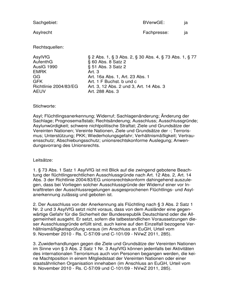Sachgebiet: BVerwGE: ja Asylrecht Fachpresse: ja Rechtsquellen: AsylVfG AufenthG AuslG 1990 EMRK GG GFK Richtlinie 2004/83/EG AEUV § 2 Abs. 1, § 3 Abs. 2, § 30 Abs. 4, § 73 Abs. 1, § 77 § 60 Abs. 8 Satz 2 § 51 Abs. 3 Satz 2 Art. 3 Art. 16a Abs. 1, Art. 23 Abs. 1 Art. 1 F Buchst. b und c Art. 3, 12 Abs. 2 und 3, Art. 14 Abs. 3 Art. 288 Abs. 3 Stichworte: Asyl; Flüchtlingsanerkennung; Widerruf; Sachlagenänderung; Änderung der Sachlage; Prognosemaßstab; Rechtsänderung; Ausschluss; Ausschlussgründe; Asylunwürdigkeit; schwere nichtpolitische Straftat; Ziele und Grundsätze der Vereinten Nationen; Vereinte Nationen, Ziele und Grundsätze der -; Terrorismus; Unterstützung; PKK; Wiederholungsgefahr; Verhältnismäßigkeit; Vertrauensschutz; Abschiebungsschutz; unionsrechtskonforme Auslegung; Anwendungsvorrang des Unionsrechts. Leitsätze: 1. § 73 Abs. 1 Satz 1 AsylVfG ist mit Blick auf die zwingend gebotene Beachtung der flüchtlingsrechtlichen Ausschlussgründe nach Art. 12 Abs. 2, Art. 14 Abs. 3 der Richtlinie 2004/83/EG unionsrechtskonform dahingehend auszulegen, dass bei Vorliegen solcher Ausschlussgründe der Widerruf einer vor Inkrafttreten der Ausschlussregelungen ausgesprochenen Flüchtlings- und Asylanerkennung zulässig und geboten ist. 2. Der Ausschluss von der Anerkennung als Flüchtling nach § 3 Abs. 2 Satz 1 Nr. 2 und 3 AsylVfG setzt nicht voraus, dass von dem Ausländer eine gegenwärtige Gefahr für die Sicherheit der Bundesrepublik Deutschland oder die Allgemeinheit ausgeht. Er setzt, sofern die tatbestandlichen Voraussetzungen dieser Ausschlussgründe erfüllt sind, auch keine auf den Einzelfall bezogene Verhältnismäßigkeitsprüfung voraus (im Anschluss an EuGH, Urteil vom 9. November 2010 - Rs. C-57/09 und C-101/09 - NVwZ 2011, 285). 3. Zuwiderhandlungen gegen die Ziele und Grundsätze der Vereinten Nationen im Sinne von § 3 Abs. 2 Satz 1 Nr. 3 AsylVfG können jedenfalls bei Aktivitäten des internationalen Terrorismus auch von Personen begangen werden, die keine Machtposition in einem Mitgliedstaat der Vereinten Nationen oder einer staatsähnlichen Organisation innehaben (im Anschluss an EuGH, Urteil vom 9. November 2010 - Rs. C-57/09 und C-101/09 - NVwZ 2011, 285). 4. Allein die Zugehörigkeit einer Person zu einer Organisation, die ihre Ziele (auch) mit terroristischen Mitteln zu erreichen sucht, rechtfertigt nicht automatisch die Annahme eines Ausschlussgrundes nach § 3 Abs. 2 Satz 1 Nr. 2 oder 3 AsylVfG. Es bedarf vielmehr in jedem Einzelfall einer Würdigung der genauen tatsächlichen Umstände, um zu ermitteln, ob die von der Organisation begangenen Handlungen schwere nichtpolitische Straftaten oder Zuwiderhandlungen gegen die Ziele und Grundsätze der Vereinten Nationen im Sinne dieser Ausschlussgründe sind und der betreffenden Person eine individuelle Verantwortung für die Handlungen zugerechnet werden kann (im Anschluss an EuGH, Urteil vom 9. November 2010 - Rs. C-57/09 und C-101/09 - NVwZ 2011, 285). 5. Wegen der Verwechselbarkeit der Rechtsstellung eines Asylberechtigten nach Art. 16a GG und eines Flüchtlings im Sinne der Richtlinie 2004/83/EG verbieten es die unionsrechtlichen Vorgaben in Art. 3 der Richtlinie, eine nach Art. 12 Abs. 2 der Richtlinie von der Anerkennung als Flüchtling ausgeschlossene Person als Asylberechtigten anzuerkennen oder diese Anerkennung aufrechtzuerhalten (wie Urteil vom 31. März 2011 - BVerwG 10 C 2.10). Urteil des 10. Senats vom 7. Juli 2011 - BVerwG 10 C 26.10 I. VG Gelsenkirchen vom 29.11.2005 - Az.: VG 14a K 2880/04.A II. OVG Münster vom 27.03.2007 - Az.: OVG 8 A 5118/05.A - BUNDESVERWALTUNGSGERICHT IM NAMEN DES VOLKES URTEIL BVerwG 10 C 26.10 OVG 8 A 5118/05.A Verkündet am 7. Juli 2011 Werner als Urkundsbeamtin der Geschäftsstelle In der Verwaltungsstreitsache -2- hat der 10. Senat des Bundesverwaltungsgerichts auf die mündliche Verhandlung vom 7. Juli 2011 durch den Vorsitzenden Richter am Bundesverwaltungsgericht Prof. Dr. Berlit, den Richter am Bundesverwaltungsgericht Prof. Dr. Dörig, die Richterin am Bundesverwaltungsgericht Beck, den Richter am Bundesverwaltungsgericht Prof. Dr. Kraft und die Richterin am Bundesverwaltungsgericht Fricke für Recht erkannt: Auf die Revision der Beklagten wird das Urteil des Oberverwaltungsgerichts für das Land Nordrhein-Westfalen vom 27. März 2007 aufgehoben. Die Sache wird zur erneuten Verhandlung und Entscheidung an das Oberverwaltungsgericht zurückverwiesen. Die Entscheidung über die Kosten bleibt der Schlussentscheidung vorbehalten. Gründe: I 1 Der Kläger wendet sich gegen den Widerruf seiner Asyl- und Flüchtlingsanerkennung. 2 Der 1968 geborene Kläger ist türkischer Staatsangehöriger kurdischer Volkszugehörigkeit. Im Mai 2001 reiste er aus dem Iran auf dem Luftweg nach Deutsch- -3land ein und beantragte Asyl. Zur Begründung gab er an: Er befürchte Verfolgung sowohl von Seiten des türkischen Staates als auch von Seiten der Kurdischen Arbeiterpartei (PKK). Er sei schon während seines Studiums an der Universität Istanbul Ende der 80er Jahre wegen seines Eintretens für ein Selbstbestimmungsrecht der Kurden dreimal festgenommen und gefoltert worden. Danach sei er jeweils aus Mangel an Beweisen freigelassen worden. 1990 sei er in die Berge geflohen, um sich der PKK anzuschließen. Er sei dort Guerillakämpfer und hoher Funktionär der PKK gewesen. Ende 1998 habe ihn die PKK in den Nordirak geschickt. Aufgrund politischer Differenzen mit der Führung der PKK habe er sich im Mai 2000 von dieser getrennt und werde seitdem als Abtrünniger von Seiten der PKK bedroht. Er habe sich noch ungefähr ein Jahr im Nordirak aufgehalten, sei aber auch dort nicht sicher gewesen. Deshalb sei er im Mai 2001 über den Iran nach Deutschland geflohen. 3 Das Bundesamt für die Anerkennung ausländischer Flüchtlinge (jetzt: Bundesamt für Migration und Flüchtlinge) - Bundesamt - erkannte den Kläger daraufhin im Mai 2001 als Asylberechtigten an und stellte fest, das