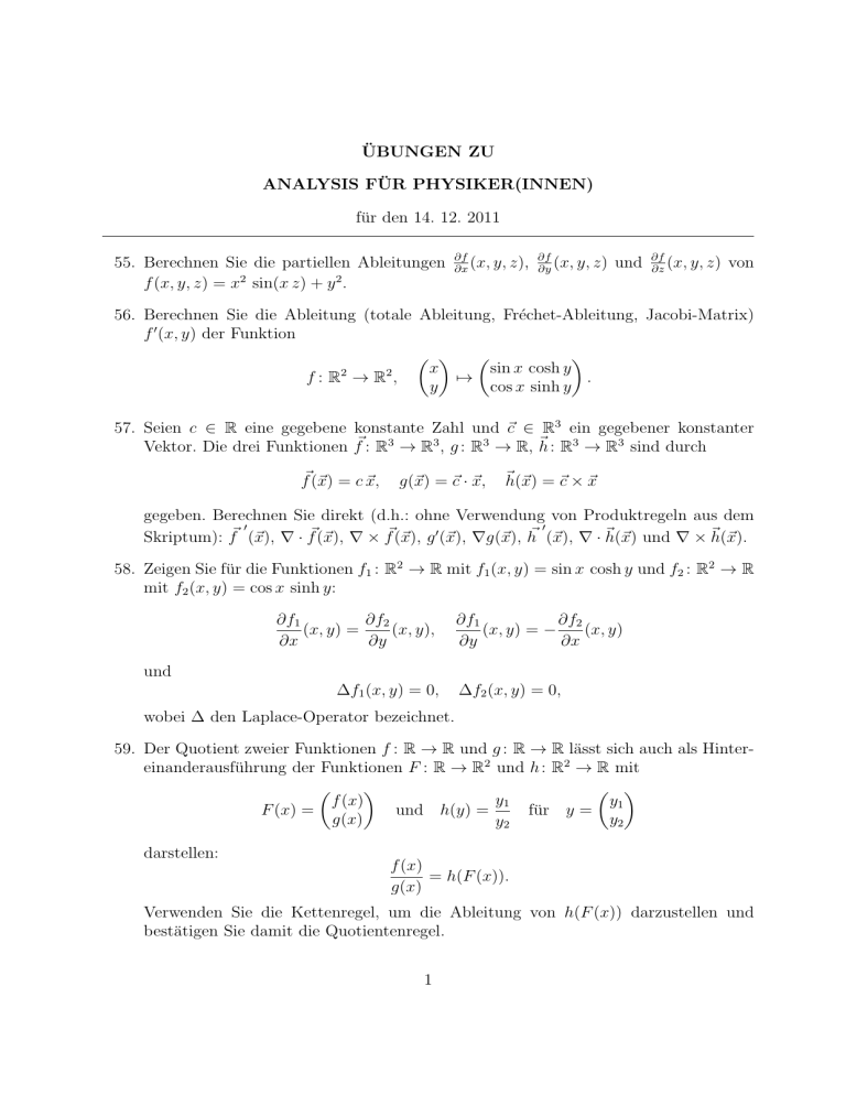 ÜBUNGEN ZU ANALYSIS FÜR PHYSIKER(INNEN) für den 14. 12. 2011 55. Berechnen Sie die partiellen Ableitungen f (x, y, z) = x2 sin(x z) + y 2 . ∂f (x, y, z), ∂f (x, y, z) ∂x ∂y und ∂f (x, y, z) ∂z von 56. Berechnen Sie die Ableitung (totale Ableitung, Fréchet-Ableitung, Jacobi-Matrix) f 0 (x, y) der Funktion x sin x cosh y 2 2 f: R →R , 7→ . y cos x sinh y 57. Seien c ∈ R eine gegebene konstante Zahl und ~c ∈ R3 ein gegebener konstanter Vektor. Die drei Funktionen f~ : R3 → R3 , g : R3 → R, ~h : R3 → R3 sind durch f~(~x) = c ~x, g(~x) = ~c · ~x, ~h(~x) = ~c × ~x gegeben. Berechnen Sie direkt (d.h.: ohne Verwendung von Produktregeln aus dem 0 0 Skriptum): f~ (~x), ∇ · f~(~x), ∇ × f~(~x), g 0 (~x), ∇g(~x), h~ (~x), ∇ · ~h(~x) und ∇ × ~h(~x). 58. Zeigen Sie für die Funktionen f1 : R2 → R mit f1 (x, y) = sin x cosh y und f2 : R2 → R mit f2 (x, y) = cos x sinh y: ∂f2 ∂f1 (x, y) = (x, y), ∂x ∂y ∂f1 ∂f2 (x, y) = − (x, y) ∂y ∂x und ∆f1 (x, y) = 0, ∆f2 (x, y) = 0, wobei ∆ den Laplace-Operator bezeichnet. 59. Der Quotient zweier Funktionen f : R → R und g : R → R lässt sich auch als Hintereinanderausführung der Funktionen F : R → R2 und h : R2 → R mit y1 f (x) y F (x) = und h(y) = für y = 1 g(x) y2 y2 darstellen: f (x) = h(F (x)). g(x) Verwenden Sie die Kettenregel, um die Ableitung von h(F (x)) darzustellen und bestätigen Sie damit die Quotientenregel. 1 60. Sei f : R2 → R eine differenzierbare Funktion. Die partielle Ableitungen von f werden mit ∂f (x, y) und ∂f (x, y) bezeichnet. Sei g : [0, ∞) × (−π, π] → R durch ∂x ∂y g(r, ϕ) = f (r cos ϕ, r sin ϕ) gegeben. Die partielle Ableitungen von g werden mit ∂g (r, ϕ) ∂r und ∂g (r, ϕ) ∂ϕ bezeichnet. Zeigen Sie: ∂g ∂f ∂f (r, ϕ) = cos ϕ (r cos ϕ, r sin ϕ) + sin ϕ (r cos ϕ, r sin ϕ) ∂r ∂x ∂y ∂g ∂f ∂f (r, ϕ) = −r sin ϕ (r cos ϕ, r sin ϕ) + r cos ϕ (r cos ϕ, r sin ϕ) ∂ϕ ∂x ∂y Hinweis: Kettenregel für g = f ◦ T mit 2 T : [0, ∞) × (−π, π] → R , r r cos ϕ 7→ . ϕ r sin ϕ 61. Mit den Abkürzungen x = r cos ϕ und y = r sin ϕ lassen sich die Beziehungen aus der Übungsaufgabe 60 folgendermaßen schreiben: ∂f ∂f (x, y) + sin ϕ (x, y) = ∂x ∂y ∂f ∂f −r sin ϕ (x, y) + r cos ϕ (x, y) = ∂x ∂y cos ϕ ∂g (r, ϕ) ∂r ∂g (r, ϕ) ∂ϕ Folgern Sie daraus für r 6= 0: ∂f ∂g sin ϕ (x, y) = cos ϕ (r, ϕ) − ∂x ∂r r ∂g cos ϕ ∂f (x, y) = sin ϕ (r, ϕ) + ∂y ∂r r ∂g (r, ϕ) ∂ϕ ∂g (r, ϕ). ∂ϕ Hinweis: Betrachten Sie die Beziehungen aus Übungsaufgabe 60 als lineares Gleichungssystem für die Größen ∂f (x, y) und ∂f (x, y). Lösen Sie das Gleichungssystem ∂x ∂y nach diesen Größen auf. 62. Seien r ∈ (0, ∞) und ϕ ∈ (−π, π] vorgegeben. Berechnen Sie die Richtungsableitung ∂f (x0 , y0 ) der Funktion f (x, y) = x2 + y 2 an der Stelle (x0 , y0 ) = (r cos ϕ, r sin ϕ) für ∂v die Richtung v = n und für die Richtung v = t mit cos ϕ − sin ϕ n= und t = . sin ϕ cos ϕ 63. Seien f : X −→ R und ~g : X −→ Rn differenzierbare Funktionen auf X ⊂ Rn . Bestätigen Sie die folgende Produktregel: ∇ · f (x)~g (x) = ∇f (x) · ~g (x) + f (x) ∇ · ~g (x) . 2