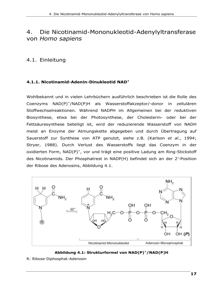 4. Die Nicotinamid-Mononukleotid-Adenylyltransferase von Homo sapiens 4. Die Nicotinamid-Mononukleotid-Adenylyltransferase von Homo sapiens 4.1. Einleitung 4.1.1. Nicotinamid-Adenin-Dinukleotid NAD+ Wohlbekannt und in vielen Lehrbüchern ausführlich beschrieben ist die Rolle des Coenzyms NAD(P)+/NAD(P)H als Wasserstoffakzeptor/-donor in zellulären Stoffwechselreaktionen. Während NADPH im Allgemeinen bei der reduktiven Biosynthese, etwa bei der Photosynthese, der Cholesterin- oder bei der Fettsäuresynthese beteiligt ist, wird der reduzierende Wasserstoff von NADH meist an Enzyme der Atmungskette abgegeben und durch Übertragung auf Sauerstoff zur Synthese von ATP genutzt, siehe z.B. (Karlson et al., 1994; Stryer, 1988). Durch Verlust des Wasserstoffs liegt das Coenzym in der oxidierten Form, NAD(P)+, vor und trägt eine positive Ladung am Ring-Stickstoff des Nicotinamids. Der Phosphatrest in NADP(H) befindet sich an der 2’-Position der Ribose des Adenosins, Abbildung 4.1. Abbildung 4.1: Strukturformel von NAD(P)+/NAD(P)H R: Ribose-Diphosphat-Adenosin 17 Erik Werner: Zwei Wege, Nukleotide zu binden Weitere Bedeutung besitzt NAD+ in zellulären Signaltransduktionswegen (Review in (Ziegler, 2000)). Es dient z.B. als Substrat für die kovalente Modifikation von Proteinen. ADP-Ribose wird dabei etwa von bakteriellen Toxinen oder von eukaryotischen ADP-Ribosyltransferasen auf Zielproteine übertragen. NAD+ kann zudem als Ausgangsstoff für die Synthese des Botenstoffes cyclo-ADP-Ribose (cADPR) dienen. Ein besonders gut studiertes Protein ist die Poly(ADP-Ribosyl)Polymerase, PARP1, die Poly(ADP-Ribose) synthetisiert und auf ein Zielprotein überträgt. Zielproteine sind z.B. Histone, Topoisomerasen oder auch PARP1 selbst. Das Zellkern-Protein und sein Syntheseprodukt werden mit zahlreichen Reaktionen des DNA-Stoffwechsels in Zusammenhang gebracht, so z.B. mit der Rekrutierung von DNA-Reparaturenyzmen, der Regulation der Genom-Stabilität, und der DNA-Replikation, aber auch mit der Transkription, der Genexpression und mit Apoptose (Reviews in (Bürkle, 2001; D'Amours et al., 1999; Oei et al., 1997)). 4.1.2. Nicotinamid-Mononukleotid-Adenylyltransferase NMNAT NAD+ kann de Rückgewinnung synthetisiert novo aus werden oder über Nukleotiden (Magni et der al., den Bergungs-Stoffwechselweg, Nukleinsäuren 1999), („salvage Abbildung 4.2. der pathway“) Das Enzym Nicotinamid/Nicotinat-Mononukleotid-Adenylyltransferase, NMNAT/NaMNAT (E.C. 2.7.7.1), ist dabei an beiden Wegen beteiligt. Da es sowohl NicotinamidMononukleotid (NMN) als auch Nicotinat-Mononukleotid (NaMN) bindet und mit ATP umsetzt (Dahmen et al., 1967; Emanuelli et al., 2001; Emanuelli et al., 1992), sind als Reaktionsprodukte sowohl NAD+ als auch deamido-NAD+ (NaAD+) möglich. Letzteres kann durch die NAD+-Synthetase zu NAD+ amidiert werden. Es handelt sich also bei NaMNAT und NMNAT um das gleiche Enzym. NMNAT ist ein 32 kDa-Protein, welches aus Plazenta (Emanuelli et al., 1992) und als rekombinantes Protein (Emanuelli et al., 2001; Schweiger et al., 2001) gereinigt wurde. Seine Aktivität kann indirekt verfolgt werden. Das Endprodukt der Synthese, NAD+, wird dabei von Alkohol-Dehydrogenase zu NADH reduziert, eine Reaktion, die spektroskopisch nachvollzogen werden kann (Balducci et al., 1995). 18 4. Die Nicotinamid-Mononukleotid-Adenylyltransferase von Homo sapiens Abbildung 4.2: Biosynthese von NAD+ Die Reaktionen werden von den folgenden Enzymen katalysiert: (1) ChinolinatPhosphoribosyltransferase, (2) Nicotinat-Phosphoribosyltransferase, (3) NicotinatMononukleotid Adenylyltransferase (NaMNAT), (4) Nicotinamid-Phosphoribosyltransferase, (5) NAD+-Synthetase, (6) Nicotinamid-Mononukleotid-Adenylyltransferase (NMNAT). PRPP: Phosphoribosylpyrophosphat. Humane NMNAT ist ausschließlich im Zellkern zu finden, wird dort phosphoryliert und ist mit PARP1 assoziiert, welche von NMNAT inhibiert wird (Balducci et al., 1992; Ruggieri et al., 1990; Schweiger et al., 2001; Uhr und Smulson, 1982). 19 Erik Werner: Zwei Wege, Nukleotide zu binden NMNAT wird daher eine wichtige Rolle bei der Regulation des intrazellulären NAD+-Pools zugeschrieben, insbesondere in Episoden mit erhöhten DNASchäden. PARP1 ist unter anderem an der Basen-Excisions-Reparatur (BER) beteiligt (D'Amours et al., 1999; Lindahl and Wood, 1999; Oei et al., 1997) und könnte daher einen großen Teil des zellulären NAD+ unter den Bedingungen von genotoxischem Stress aufbrauchen. Zudem wird die Expression von NMNAT in Tumorzellen, die resistent gegen Tiazofurin (2-β-D-Ribofuranosyltiazol-4-carboxamid) sind, herunter reguliert (Boulton et al., 1997). NMNAT überträgt AMP auf Thiazofurin-Phosphat (TMN) im geschwindigkeitsbestimmenden Schritt der Synthese von Tiazofurin-AdeninDinukleotid, TAD (Cooney et al., 1993). TAD inhibiert mit Inosin-MonophosphatDehydrogenase ein wichtiges Enzym der GTP/dGTP Biosynthese und bewirkt somit eine Unterbrechung der DNA- und RNA-Synthese sowie eine Blockierung von G-Protein-gekoppelten Signaltransduktionswegen (Jayaram et al., 1999). Da NMNAT außerdem vom Chemotherapeutikum 1,3-Bis(2-Chloroethyl)-1- Nitrosoharnstoff (BCNU) inaktiviert wird (Emanuelli et al., 1995), kann das Enzym als Ziel pharmakologischer Anwendungen in Betracht gezogen werden. Für die humane NMNAT aus Plazenta wurden Michaelis-Konstanten KM gemessen von 23 µM für ATP, 38 µM für NMN, 180 µM für NaMN, 67 µM für NAD+ und 125 µM für PPi (Emanuelli et al., 1992). Damit scheint der Amido-Weg der Synthese hier bevorzugt zu sein, anders als in anderen Spezies (Dahmen et al., 1967; Magni et al., 1999). ATP inhibiert die Synthese von NAD+ genauso wie ADPRibose und verschiedene Schwermetalle (Emanuelli et al., 2001; Emanuelli et al., 1992). Der Vergleich von NMNAT-Proteinsequenzen verschiedener Spezies ergibt zwei konservierte Motive, deren Konsensus-Sequenz mit G15XXXP19X(H/T)21XXH24- und S222XT224XXR227 angegeben werden (D'Angelo et al., 2000; Garavaglia et al., 2001; Olla