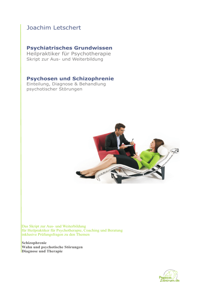 Joachim Letschert Psychiatrisches Grundwissen Heilpraktiker für Psychotherapie Skript zur Aus- und Weiterbildung Psychosen und Schizophrenie Einteilung, Diagnose & Behandlung psychotischer Störungen Das Skript zur Aus- und Weiterbildung für Heilpraktiker für Psychotherapie, Coaching und Beratung inklusive Prüfungsfragen zu den Themen Schizophrenie Wahn und psychotische Störungen Diagnose und Therapie Dieses Skript dient der Prüfungsvorbereitung zum Heilpraktiker für Psychotherapie und der Weiterbildung für Menschen in therapeutischen und beratenden Berufen. © PegasusZentrum, Bad Vilbel Nachdruck und Vervielfältigung jeglicher Art, auch auszugsweise, nur mit schriftlicher Genehmigung des PegasusZentrums. Weitere Informationen finden Sie auf www.PegasusZentrum.de. Alle Inhalte dieses Skripts wurden sorgfältig recherchiert. Für die Richtigkeit oder evtl. aus nicht richtigen Angaben entstandenen Schaden können wir keine Haftung Übernehmen. Coverfoto: woman by the psychologist, © Ambrophoto - Fotolia.com 2 Hinweise zum Inhalt des Skriptes Dieses Skript und die gesamte Skriptreihe stellt die „Krankheitsbilder in der Psychiatrie“ in detaillierter Weise dar. Ein Wissen über diese Krankheitsbilder ist nicht nur für die amtsärztliche Überprüfung zum Heilpraktiker für Psychotherapie wichtig, sondern sie dient auch zur Weiterbildung für alle beratende Berufe, in denen es notwendig ist, Störungen frühzeitig zu erkennen, um sie einer entsprechenden Behandlung zuzuführen. Alle Informationen in diesem Skript wurden sorgfältig recherchiert und werden, wenn nötig, aktualisiert. Trotzdem kann der Autor nicht ausschließen, dass Informationen in anderen Quellen anders dargestellt oder interpretiert werden. Dies betrifft besonders die Darstellung von statistischen Daten oder Behandlungsmöglichkeiten. Besonders der medizinische und psychiatrische Bereich ist Veränderungen und Meinungen unterworfen, die unter Umständen in verschiedenen Quellen anders dargestellt oder vertreten werden. Hinweise zum Aufbau des Skripts Zu Beginn finden Sie eine Zusammenfassung des Themas unter „kurz & bündig“. Sie dient dem ersten Überblick. Im weiteren Skript wird das Thema detailliert behandelt. Die einzelnen Krankheitsbilder sind jeweils mit dem derzeit gültigen Code der ICD versehen. Sie sollten diese Codes kennen und einordnen können. In der späteren Berufspraxis sind sie zum Beispiel zur Kennzeichnung Ihrer Diagnose für die Abrechnung mit privaten Krankenkassen wichtig. Hierfür stehen Ihnen sowohl im Internet, als auch im Buchhandel Listen zur Verfügung, die Sie verwenden können. In den rot unterlegten Feldern und den Randnotizen finden Sie Zusammenfassungen und Hinweise im Hinblick auf die Überprüfung zum Heilpraktiker für Psychotherapie. Auch hier ist es, je nach Prüfungssituation, möglich, dass andere Schwerpunkte von Interesse sind. Am Ende des Skripts finden Sie Prüfungsfragen mit den jeweiligen Antworten am unteren Rand der Seite. Bei Fragen, Wünschen oder Anregungen freuen wir uns über Ihre Rückmeldung an uns. Die Erarbeitung und Herstellung eines Skriptes kostet Zeit und Geld. Bitte respektieren Sie deshalb die Urheberschaft an diesem Skript. Sie liegt beim Autor - Joachim Letschert - und dem PegasusZentrum. Sollten Sie Interesse an der Vervielfältigung oder Veröffentlichung von Teilen des Skripts haben, sprechen Sie uns gerne persönlich an. Viel Spaß und vor allem Erfolg mit diesem Skript Ihr Joachim Letschert PegasusZentrum Wissen zum Heilpraktiker für Psychotherapie Psychosen und Schizophrenie 3 Inhaltsverzeichnis Psychosen und Schizophrenie Seite 5 Kurz und bündig Hier erfahren Sie in einer Zusammenfassung, welche Inhalte Sie erwarten. Seite 6-18 Schizophrenie Hier erfahren Sie, was eine Schizophrenie ist, wie sie sich zeigt, welche Subtypen und Behandlungsmöglichkeiten es gibt. Seite 19-20 Andere psychotische Störungen Hier erfahren Sie, welche anderen psychotischen Störungen es neben der Schizophrenie gibt. Seite 21-28 Prüfungsfragen Hier können Sie Ihr erlangtes Wissen testen. Wissen zum Heilpraktiker für Psychotherapie Psychosen und Schizophrenie 4 Kurz & bündig – Schizophrenie Die Schizophrenie ist von affektiven Störungen begleitet. Ihr Hauptmerkmal allerdings sind die bizarren Erlebnisweisen, die sich aus den unterschiedlichsten Störungen zusammensetzen, wie Halluzinationen, Wahn und Störungen des Denkens, bis zum Zerfall der Denkinhalte und Sprachneubildung. Dabei sind schizophrene Menschen oft sehr intelligent und versuchen, aus den verschiedenen (gespaltenen = schizophrenen) Erlebniswelten, die sie durchmachen, immer noch ein einheitliches Erleben zu bilden, was Ihnen natürlich nicht oder schwerlich gelingt. Genau hier liegt das Drama der Schizophrenie. Dreiviertel der Schizophrenien beginnen vor dem 40. Lebensjahr, bei Frauen etwas später, Ihre Prognose ist dafür etwas besser als bei den männlichen Patienten. Eher selten kommt die jugendliche Schizophrenie, die Hebephrenie vor. Als Entstehungsursache nimmt man eine erhöhte Verletzlichkeit des Gehirns an. D.h. dass der Schizophrene besonders auf dauernde bspw. familiäre Stress-Situationen sehr sensibel reagiert und mitunter irgendwann eine Schizophrenie ausbilden kann. Allerdings ist man sich hier noch nicht wirklich sicher. Die Symptome einer Schizophrenie sind sehr unterschiedlich. Erstmals wurden sie von Eugen Bleuler, später von Kurt Schneider definiert. Heute erfolgt die Diagnose nach der ICD-10. Hier kommen Ich-Störungen, Wahnerleben, Stimmenhören, Störungen des Gedankenablaufs, motorische (katatone) Störungen und auch Negativsymptome wie Affektverarmung vor. Prinzipiell kann eine Schizophrenie viele Gesichter haben und ist oft nicht so spektakulär, wie man hört oder in Filmen sieht. Sie beginnt nicht selten schleichend und wird deshalb, oft sehr spät erkannt. Wenn äußerlich auch nicht sichtbar, bedeutet es für die Menschen eine oft ungeheure Qual. Man ste
