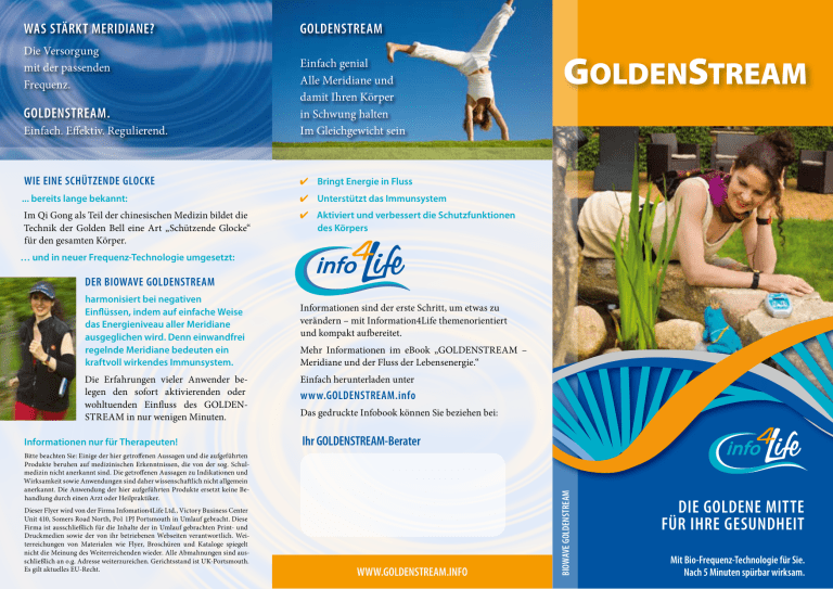 Was Stärkt Meridiane? Die Versorgung mit der passenden Frequenz. GOLDENSTREAM Einfach. Effektiv. Regulierend. Einfach genial Alle Meridiane und damit Ihren Körper in Schwung halten Im Gleichgewicht sein Wie eine schützende Glocke ✔✔ Bringt Energie in Fluss ... bereits lange bekannt: ✔✔ Unterstützt das Immunsystem Im Qi Gong als Teil der chinesischen Medizin bildet die Technik der Golden Bell eine Art „Schützende Glocke“ für den gesamten Körper. ✔✔ Aktiviert und verbessert die Schutzfunktionen des Körpers GOLDENSTREAM. GoldenStream … und in neuer Frequenz-Technologie umgesetzt: Der BIOWAVE GOLDENSTREAM Die Erfahrungen vieler Anwender belegen den sofort aktivierenden oder wohltuenden Einfluss des GOLDENSTREAM in nur wenigen Minuten. Informationen nur für Therapeuten! Informationen sind der erste Schritt, um etwas zu verändern – mit Information4Life themenorientiert und kompakt aufbereitet. Mehr Informationen im eBook „GOLDENSTREAM – Meridiane und der Fluss der Lebensenergie.“ Einfach herunterladen unter www.goldenstream.info Das gedruckte Infobook können Sie beziehen bei: Ihr GOLDENSTREAM-Berater Bitte beachten Sie: Einige der hier getroffenen Aussagen und die aufgeführten Produkte beruhen auf medizinischen Erkenntnissen, die von der sog. Schulmedizin nicht anerkannt sind. Die getroffenen Aussagen zu Indikationen und Wirksamkeit sowie Anwendungen sind daher wissenschaftlich nicht allgemein anerkannt. Die Anwendung der hier aufgeführten Produkte ersetzt keine Behandlung durch einen Arzt oder Heilpraktiker. Dieser Flyer wird von der Firma Infomation4Life Ltd., Victory Business Center Unit 410, Somers Road North, Po1 1PJ Portsmouth in Umlauf gebracht. Diese Firma ist ausschließlich für die Inhalte der in Umlauf gebrachten Print- und Druckmedien sowie der von ihr betriebenen Webseiten verantwortlich. Weiterreichungen von Materialen wie Flyer, Broschüren und Kataloge spiegelt nicht die Meinung des Weiterreichenden wieder. Alle Abmahnungen sind ausschließlich an o.g. Adresse weiterzureichen. Gerichtsstand ist UK-Portsmouth. Es gilt aktuelles EU-Recht. www.goldenstream.info biowave Goldenstream harmonisiert bei negativen Einflüssen, indem auf einfache Weise das Energieniveau aller Meridiane ausgeglichen wird. Denn einwandfrei regelnde Meridiane bedeuten ein kraftvoll wirkendes Immunsystem. Die goldene Mitte für Ihre Gesundheit Mit Bio-Frequenz-Technologie für Sie. Nach 5 Minuten spürbar wirksam. GOLDENSTREAM nutzen heiSSt Gewinnen So aktivieren Sie Ihr Immunsystem und bringen Ihre Meridiane in die Regelung! Viele Anwender bestätigen dies mit ihrer Erfahrung für eine neue Lebensqualität. regeln geht nur mit Energie Im menschlichen und tierischen Körper gibt es unzählige Regelkreisläufe, welche konstant gehalten werden müssen, z.B. für Blutdruck und Körpertemperatur. Hunderte von Regelkreisläufen lassen den Körper als Wunderwerk der Natur arbeiten. Innerhalb der Regelkreise spielen die Meridiane eine zentrale Rolle. Die Hauptmeridiane sind in der traditionellen chinesischen Medizin seit tausenden von Jahren bekannt. Sie sind die Energie-Leitbahnen im Körper und versorgen Organe und Regelkreise mit Energie, z.B. Lunge, Leber, Magen, Hormonsystem. Zum Regeln ist immer Energie erforderlich. Wird es einem Menschen z.B. kalt, dann muss die Körperregulation aktiv werden und mehr Wärme produzieren. Das verbraucht viel mehr Energie als im Normalzustand. Kommt es zu Störungen innerhalb eines Regelkreises, können Abweichungen nicht mehr ausbalanciert werden – der betroffene Meridian ist blockiert... es kommt zu einem Ungleichgewicht. Was sich zunächst als leichtes Unwohlsein äußert, kann dann zu einer Krankheit führen. Leistungsfähig für den Tag Gibt es für Meridiane Schutz und Stabilität? Im Qi Gong – bekannt aus der chinesischen Medizin als Anleitung für Entspannung, Zentrierung und Ausgleich – gibt es die Technik der „Golden Bell“. Bei dieser Methode kann man alle Meridiane sozusagen einmal durchfluten, zum Schwingen bringen und anschließend verbinden, so dass sich eine Art schützende Glocke (Golden Bell) ausbildet, die einen vor allen schädlichen äußeren Einflüssen bewahrt. Genau dieses Prinzip nutzt das GOLDENSTREAM Schwingungs-Programm: Als eine Art Grundausgleich regt es alle Meridiane in unserem Körper kurz mit deren eigenen Frequenzen an. In diesem kurzen Moment haben die Meridiane gerade genug Zeit, in Resonanz mit der ausgesendeten Frequenz zu gehen, wenn sie sie benötigen. Die Reihenfolge der anregenden Frequenzen ist genau ausgewählt und spielt in diesem Prozess eine große Rolle. NEU ist hieran: Harmonisierung, Schutz und Stabilität für alle Meridiane auf einmal*. Vorteile des Biowave GOLDENSTREAM GOLDENSTREAM ist ein Schwingungsprogramm für den ­Biowave 21® LCD Generator. ✔✔ Energieausgleich für alle Meridiane ✔✔ Bereits spürbar wirksam nach 5 Minuten ✔✔ Unterstützt das Immunsystem und den Stoffwechsel, z.B. ideal fürs Abnehmen ✔✔ Fördert die Regeneration ✔✔ Harmonisierend in Burn Out-Situationen ✔✔ Ergebnis: Mehr Energie im Alltag Die Biowave-Technologie bietet noch mehr Unterstützung bei der Behandlung von Schmerzen bei: ✔✔ Kopfschmerzen (Migräne) ✔✔ Rücken- und Gelenkschmerzen ✔✔ Postoperative Schmerzen ... und damit kann der Körper einwandfrei in seiner Regelung für Temperatur, Blut, Sauerstoff, Verdauung usw. arbeiten. GOLDENSTREAM bringt Energie in Fluss. ✔✔ Durchblutungsstörungen * Die gezielte Schwingung verbindet die Meridiane allerdings nur so lange, wie ein Meridian noch grundsätzlich in der Lage ist, den Energiefluss zu regeln. ✔✔ Rheumatische Beschwerden ✔✔ Schmerzen bei Eingriffen ✔✔ Beschwerden des Bewegungsapparats ✔✔ Regelschmerzen und vieles mehr … Harmonisierung aller Meridiane Damit Sie immer im Gleichgewicht sind