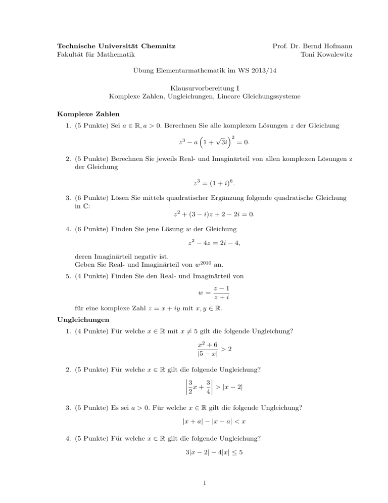 Technische Universität Chemnitz Fakultät für Mathematik Prof. Dr. Bernd Hofmann Toni Kowalewitz Übung Elementarmathematik im WS 2013/14 Klausurvorbereitung I Komplexe Zahlen, Ungleichungen, Lineare Gleichungssysteme Komplexe Zahlen 1. (5 Punkte) Sei a ∈ R, a > 0. Berechnen Sie alle komplexen Lösungen z der Gleichung √ 2 z 3 − a 1 + 3i = 0. 2. (5 Punkte) Berechnen Sie jeweils Real- und Imaginärteil von allen komplexen Lösungen z der Gleichung z 3 = (1 + i)6 . 3. (6 Punkte) Lösen Sie mittels quadratischer Ergänzung folgende quadratische Gleichung in C: z 2 + (3 − i)z + 2 − 2i = 0. 4. (6 Punkte) Finden Sie jene Lösung w der Gleichung z 2 − 4z = 2i − 4, deren Imaginärteil negativ ist. Geben Sie Real- und Imaginärteil von w2010 an. 5. (4 Punkte) Finden Sie den Real- und Imaginärteil von w= z−1 z+i für eine komplexe Zahl z = x + iy mit x, y ∈ R. Ungleichungen 1. (4 Punkte) Für welche x ∈ R mit x 6= 5 gilt die folgende Ungleichung? x2 + 6 >2 |5 − x| 2. (5 Punkte) Für welche x ∈ R gilt die folgende Ungleichung? 3 3 x + > |x − 2| 2 4 3. (5 Punkte) Es sei a > 0. Für welche x ∈ R gilt die folgende Ungleichung? |x + a| − |x − a| < x 4. (5 Punkte) Für welche x ∈ R gilt die folgende Ungleichung? 3|x − 2| − 4|x| ≤ 5 1 5. (5 Punkte) Für welche x ∈ R, x 6= 1 gilt die Ungleichung 4|x| − 5 ≤2 |x − 1| ? Lineare Gleichungssysteme 1. (7 Punkte) Lösen Sie das lineare Gleichungssystem in Abhängigkeit vom Parameter α ∈ R. 2x1 − 3x2 + 8x3 − 5x4 + 6 = 0, −3x1 + 2x2 − 7x3 + 5x4 − 4 = 0, 4x1 + 5x2 − 6x3 + x4 + α = 0, 2x1 + 3x2 − 4x3 + x4 − 6 = 0. 2. (5 Punkte) Lösen Sie das lineare Gleichungssystem. 2x1 + 7x2 + 3x3 + x4 = 5, x1 + 3x2 + 5x3 − 2x4 = 3, x1 + 5x2 − 9x3 + 8x4 = 1, 5x1 + 18x2 + 4x3 + 5x4 = 12. 3. (5 Punkte) Bestimmen Sie die Koeffizienten ai ∈ R(i = 0, 1, 2, 3) eines reellen Polynoms f (x) = a3 x3 + a2 x2 + a1 x + a0 aus folgenden vier Bedingungen, die zu einem linearen Gleichungssystem führen: f (1) = 0, f 0 (1) = −1, f (2) = 0, f 0 (2) = 1. Wieviele solcher Polynome gibt es? 4. (6 Punkte) Untersuchen Sie das lineare Gleichungssystem für c ∈ R auf Lösbarkeit, und finden Sie gegebenenfalls alle Lösungen: x1 − 2x2 + 2x3 + 3x4 = 3, x1 + 3x2 + x3 + 3x4 = 13, 2x1 + x2 + 5x3 − 4x4 = 6, 2x1 − 4x2 + 6x3 − 4x4 = c. 5. (6 Punkte) Untersuchen Sie das lineare Gleichungssystem für b ∈ R auf Lösbarkeit, und finden Sie gegebenenfalls alle Lösungen: x1 − 2x2 + x3 = −3, 3x1 − 3x2 + 2x3 = −5, 2x1 + 2x2 + bx3 = 4. 2