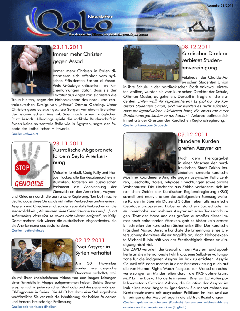 Ausgabe 21/2011 Newsletter Die Assyrische Stimme im deutschsprachigen Raum 08.12.2011 Kurdischer Direktor verbietet Studentenvereinigung 23.11.2011 Immer mehr Christen gegen Assad Immer mehr Christen in Syrien distanzieren sich offenbar vom syrischen Präsidenten Bashar al-Assad. Viele Gläubige kritisierten ihre Kirchenführungen dafür, dass sie der Diktatur aus Angst vor Islamisten die Treue hielten, sagte der Nahostexperte des nord- und zentraldeutschen Zweigs von „Missio“ Ottmar Oehring. Unter Christen gebe es zwar gewisse Sorgen vor einem Erstarken der islamistischen Muslimbrüder nach einem möglichen Sturz Assads. Allerdings spiele die radikale Bruderschaft in Syrien keine so zentrale Rolle wie in Ägypten, sagte der Experte des katholischen Hilfswerks. Quelle: kathweb.at 23.11.2011 Australische Abgeordnete fordern Seyfo Anerkennung Malcolm Turnbull, Craig Kelly und Hon Joe Hockey, alle Bundesabgeordnete in Australien, forderten im australischen Parlament die Anerkennung der Genozide an den Armeniern, Assyrern und Griechen durch die australische Regierung. Turnbull machte deutlich, dass diese Genozide nicht allein Verbrechen an Armeniern, Assyrern und Griechen sind, sondern ebenfalls Verbrechen an die Menschlichkeit. „Wir müssen diese Genozide anerkennen […] und sicherstellen, dass sich so etwas nicht wieder ereignet“, so Kelly. Damit mehren sich wieder die australischen Abgeordneten, die die Anerkennung des Seyfo fordern. Quellen: bethnahrin.de 02.12.2011 Zwei Assyrer in Syrien verhaftet Mitglieder der Chaldo-Assyrischen Studenten Union in ihre Schule in der nordirakischen Stadt Ankawa eintreten wollten, wurden sie vom kurdischen Direktor der Schule, Othman Qader, aufgehalten. Daraufhin fragte er die Studenten: „Wen wollt ihr repräsentieren? Es gibt nur die Kurdistan Studenten Union, und wir werden es nicht zulassen, dass ihr irgendwelche Aktivitäten habt, die etwas mit eurer Studentenorganisation zu tun haben.“ Ankawa befindet sich innerhalb der Grenzen der Kurdischen Regionalregierung. Quelle: ankawa.com (Arabisch) 09.12.2011 Hunderte Kurden greifen Assyrer an Nach dem Freitagsgebet in einer Moschee der nordirakischen Stadt Zakho inszinierten hunderte kurdische Muslime koordinierte Angriffe gegen assyrische Kulturzentren, Geschäfte, Hotels, religiöse Einrichtungen sowie private Wohnhäuser. Die Nachricht aus Zakho verbreitete sich im restlichen Gebiet der Kurdischen Regionalregierung (KRG) schnell und motivierte am darauffolgenden Samstag weitere Kurden in über ein Dutzend Städten, ebenfalls assyrische Gebäude anzugreifen. Dabei entstand ein Sachschaden in Millionenhöhe und mehrere Assyrer erhielten Todesdrohungen. Trotz der Härte und des großen Ausmaßes dieser immer noch anhaltenden Attacken, gab es bisher kein ernstes Einschreiten der kurdischen Sicherheitskräfte. Der kurdische Präsident Masud Barzani kündigte die Ernennung eines Untersuchungskomitees dieser Angriffe an, doch Nahostexperte Michael Rubin hält von der Ernsthaftigkeit dieser Ankündigung nicht viel. Der ZAVD verurteilt die Gewalt an den Assyrern und appellierte an die internationale Politik u.a. eine Selbstverwaltungszone für die indigenen Assyrer im Irak zu errichten. Assyria Council of Europe machte in einer Presseerklärung auch auf die von Human Rights Watch festgestellten Menschenrechtsverletzungen an Minderheiten durch die KRG aufmerksam. MEP Emine Bozkurt forderte in einem Brief an EU Außenpolitikvertreterin Cathrine Ashton, die Situation der Assyrer im Irak nicht mehr länger zu ignorieren. Sie mahnt Ashton zur Kontaktaufnahme mit assyrischen Politikern im Irak und zur Einbringung der Assyrerfrage in die EU-Irak Beziehungen. Am 30. November wurden zwei assyrische Studenten verhaftet, weil sie mit ihren Mobiltelefonen Videos von den langen Leitungen einer Tankstelle in Aleppo aufgenommen haben. Solche Szenen ereignen sich in jeder syrischen Stadt aufgrund des gegenwärtigen Öl-Engpasses in Syrien. Die ADO hat dazu eine Stellungnahme veröffentlicht. Sie verurteilt die Inhaftierung der beiden Studenten und fordern ihre sofortige Freilassung. Quellen: qolo.de youtube.com (Kurdisch) foxnews.com michaelrubin.org Quelle: ado-world.org (Englisch) assyriacouncil.eu assyriacouncil.eu (Englisch) Qolo Wir stellen vor Iraq Sustainable Democracy Project Weihnachtsaktion Wie bereits in den letzten Jahren wird die Assyria Foundation Niederlande auch dieses Jahr zusammen mit weiteren assyrischen Partnerorganisationen auf der ganzen Welt ein unvergessliches Weihnachten für die Kinder der assyrischen Flüchtlinge in der Ninive Ebene bescheren. „[…] Sowohl alte als auch junge Assyrer wurden traumatisiert durch die schrecklichen Ereignisse der letzten Jahre. Sie sind zur dauerhaften Zielscheibe politischer Gruppen und Extremisten geworden. Dies hat viele Familien dazu veranlasst, ihre Heimat zu verlassen, um an einem sichereren Ort zu flüchten. Ich hoffe, dass wir von den Niederlanden und dem Rest der Welt aus diesen Leuten ein ganz besonderes Weihnachtsgeschänk machen können,“ so Attiya Gamri, niederländische Parlamentarierin und Direktorin des Assyria Council of Europe. Mehr Infos und das Spendenkonto finden Sie auf assyrie.nl. Ankündigungen Am 10.12.2011 findet in Augsburg die Veranstaltung „Wie kommt der Mensch zu seinen Menschenrechten?“ statt. Das Programm beeinhaltet u.a. das Thema Menschenrechte am Beispiel der Assyrer in den heutigen Staaten Mesopotamiens. Assyrer in den heutigen Staaten Mesopotamiens aufgeführt. Die Veranstaltung wird unterstützt vom Assyrischen Mesopotamien Verein Augsburg. Erol Dora, der erste Christ seit 50 Jahren und der erste Assyrer überhaupt im türkischen Parlament, wird am 17.12.2011 im Vereinslokal des Assyrischen Mesopotamien Verein Augsburg ein Vortrag über die Situation der Assyrer und anderen Minderheiten in der Türkei geben. Ninib A. Lahdo feiert dieses Jahr sein 35. Jubiläum als Sänger und Künstler. Anlässlich dieses Jubil