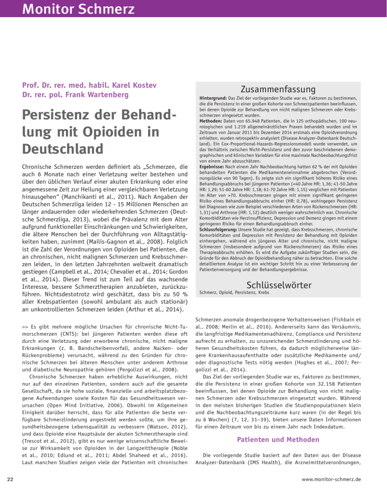 Monitor Schmerz Prof. Dr. rer. med. habil. Karel Kostev Dr. rer. pol. Frank Wartenberg Persistenz der Behandlung mit Opioiden in Deutschland Chronische Schmerzen werden definiert als „Schmerzen, die auch 6 Monate nach einer Verletzung weiter bestehen und über den üblichen Verlauf einer akuten Erkrankung oder eine angemessene Zeit zur Heilung einer vergleichbaren Verletzung hinausgehen“ (Manchikanti et al., 2011). Nach Angaben der Deutschen Schmerzliga leiden 12 - 15 Millionen Menschen an länger andauernden oder wiederkehrenden Schmerzen (Deutsche Schmerzliga, 2013), wobei die Prävalenz mit dem Alter aufgrund funktioneller Einschränkungen und Schwierigkeiten, die ältere Menschen bei der Durchführung von Alltagstätigkeiten haben, zunimmt (Mailis-Gagnon et al., 2008). Folglich ist die Zahl der Verordnungen von Opioiden bei Patienten, die an chronischen, nicht malignen Schmerzen und Krebsschmerzen leiden, in den letzten Jahrzehnten weltweit dramatisch gestiegen (Campbell et al., 2014; Chevalier et al., 2014; Gordon et al., 2014). Dieser Trend ist zum Teil auf das wachsende Interesse, bessere Schmerztherapien anzubieten, zurückzuführen. Nichtsdestotrotz wird geschätzt, dass bis zu 50 % aller Krebspatienten (sowohl ambulant als auch stationär) an unkontrollierten Schmerzen leiden (Arthur et al., 2014). >> Es gibt mehrere mögliche Ursachen für chronische Nicht-Tumorschmerzen (CNTS): bei jüngeren Patienten werden diese oft durch eine Verletzung oder erworbene chronische, nicht maligne Erkrankungen (z. B. Bandscheibenvorfall, andere Nacken- oder Rückenprobleme) verursacht, während zu den Gründen für chronische Schmerzen bei älteren Menschen unter anderem Arthrose und diabetische Neuropathie gehören (Pergolizzi et al., 2008). Chronische Schmerzen haben erhebliche Auswirkungen, nicht nur auf den einzelnen Patienten, sondern auch auf die gesamte Gesellschaft, da sie hohe soziale, finanzielle und arbeitsplatzbezogene Aufwendungen sowie Kosten für das Gesundheitswesen verursachen (Open Mind Initiative, 2006). Obwohl im Allgemeinen Einigkeit darüber herrscht, dass für alle Patienten die beste verfügbare Schmerzlinderung angestrebt werden sollte, um ihre gesundheitsbezogene Lebensqualität zu verbessern (Watson, 2012), und dass Opioide eine Hauptsäule der akuten Schmerztherapie sind (Trescot et al., 2012), gibt es nur wenige wissenschaftliche Beweise zur Wirksamkeit von Opioiden in der Langzeittherapie (Noble et al., 2010; Edlund et al., 2011; Abdel Shaheed et al., 2016). Laut manchen Studien zeigen viele der Patienten mit chronischen 22 Zusammenfassung Hintergrund: Das Ziel der vorliegenden Studie war es, Faktoren zu bestimmen, die die Persistenz in einer großen Kohorte von Schmerzpatienten beeinflussen, bei denen Opioide zur Behandlung von nicht malignen Schmerzen oder Krebsschmerzen eingesetzt wurden. Methoden: Daten von 65.948 Patienten, die in 125 orthopädischen, 100 neurologischen und 1.219 allgemeinärztlichen Praxen behandelt wurden und im Zeitraum von Januar 2011 bis Dezember 2014 erstmals eine Opioidverordnung erhielten, wurden retrospektiv analysiert (Disease Analyzer-Datenbank Deutschland). Ein Cox-Proportional-Hazards-Regressionsmodell wurde verwendet, um das Verhältnis zwischen Nicht-Persistenz und den zuvor beschriebenen demographischen und klinischen Variablen für eine maximale Nachbeobachtungsfrist von einem Jahr abzuschätzen. Ergebnisse: Nach einem Jahr Nachbeobachtung hatten 62 % der mit Opioiden behandelten Patienten die Medikamenteneinnahme abgebrochen (Verordnungslücke von 90 Tagen). Es zeigte sich ein signifikant höheres Risiko eines Behandlungsabbruchs bei jüngeren Patienten (<40 Jahre HR: 1,36; 41-50 Jahre HR: 1,29; 51-60 Jahre HR: 1,18; 61-70 Jahre HR: 1,15) verglichen mit Patienten im Alter von >70. Krebsschmerzen gingen mit einem signifikant geringeren Risiko eines Behandlungsabbruchs einher (HR: 0,78), wohingegen Persistenz bei Diagnosen wie zum Beispiel verschiedenen Arten von Rückenschmerzen (HR: 1,31) und Arthrose (HR: 1,12) deutlich weniger wahrscheinlich war. Chronische Komorbiditäten wie Herzinsuffizienz, Depression und Demenz gingen mit einem geringeren Risiko für einen Behandlungsabbruch einher. Schlussfolgerung: Unsere Studie hat gezeigt, dass Krebsschmerzen, chronische Komorbiditäten und Depression mit Persistenz der Behandlung mit Opioiden einhergehen, während ein jüngeres Alter und chronische, nicht maligne Schmerzen (insbesondere aufgrund von Rückenschmerzen) das Risiko eines Therapieabbruchs erhöhen. Es wird die Aufgabe zukünftiger Studien sein, die Gründe für den Abbruch der Opioidbehandlung näher zu betrachten. Eine solche detailliertere Analyse ist ein wichtiger Schritt hin zu einer Verbesserung der Patientenversorgung und der Behandlungsergebnisse. Schlüsselwörter Schmerz, Opioid, Persistenz, Krebs Schmerzen anomale drogenbezogene Verhaltensweisen (Fishbain et al., 2008; Merlin et al., 2016). Andererseits kann das Versäumnis, die langfristige Medikamentenadhärenz, Compliance und Persistenz aufrecht zu erhalten, zu unzureichender Schmerzlinderung und höheren Gesundheitskosten führen, da dadurch möglicherweise längere Krankenhausaufenthalte oder zusätzliche Medikamente und/ oder diagnostische Tests nötig werden (Hughes et al., 2007; Pergolizzi et al., 2014). Das Ziel der vorliegenden Studie war es, Faktoren zu bestimmen, die die Persistenz in einer großen Kohorte von 32.158 Patienten beeinflussen, bei denen Opioide zur Behandlung von nicht malignen Schmerzen oder Krebsschmerzen eingesetzt wurden. Während in den meisten bisherigen Studien die Studienpopulationen klein und die Nachbeobachtungszeiträume kurz waren (in der Regel bis zu 6 Wochen) (7, 12, 31–39), bieten unsere Daten Informationen für einen Zeitraum von bis zu einem Jahr nach Indexdatum. Patienten und Methoden Die vorliegende Studie basiert auf den Daten aus der Disease Analyzer-Datenbank (IMS Health), die Arzneimittelverordnungen, ww