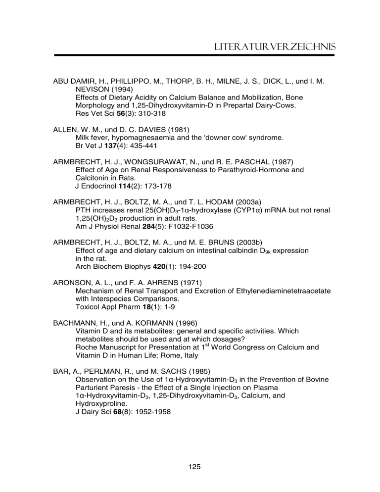 Literaturverzeichnis ABU DAMIR, H., PHILLIPPO, M., THORP, B. H., MILNE, J. S., DICK, L., und I. M. NEVISON (1994) Effects of Dietary Acidity on Calcium Balance and Mobilization, Bone Morphology and 1,25-Dihydroxyvitamin-D in Prepartal Dairy-Cows. Res Vet Sci 56(3): 310-318 ALLEN, W. M., und D. C. DAVIES (1981) Milk fever, hypomagnesaemia and the 'downer cow' syndrome. Br Vet J 137(4): 435-441 ARMBRECHT, H. J., WONGSURAWAT, N., und R. E. PASCHAL (1987) Effect of Age on Renal Responsiveness to Parathyroid-Hormone and Calcitonin in Rats. J Endocrinol 114(2): 173-178 ARMBRECHT, H. J., BOLTZ, M. A., und T. L. HODAM (2003a) PTH increases renal 25(OH)D3-1α-hydroxylase (CYP1α) mRNA but not renal 1,25(OH)2D3 production in adult rats. Am J Physiol Renal 284(5): F1032-F1036 ARMBRECHT, H. J., BOLTZ, M. A., und M. E. BRUNS (2003b) Effect of age and dietary calcium on intestinal calbindin D9k expression in the rat. Arch Biochem Biophys 420(1): 194-200 ARONSON, A. L., und F. A. AHRENS (1971) Mechanism of Renal Transport and Excretion of Ethylenediaminetetraacetate with Interspecies Comparisons. Toxicol Appl Pharm 18(1): 1-9 BACHMANN, H., und A. KORMANN (1996) Vitamin D and its metabolites: general and specific activities. Which metabolites should be used and at which dosages? Roche Manuscript for Presentation at 1st World Congress on Calcium and Vitamin D in Human Life; Rome, Italy BAR, A., PERLMAN, R., und M. SACHS (1985) Observation on the Use of 1α-Hydroxyvitamin-D3 in the Prevention of Bovine Parturient Paresis - the Effect of a Single Injection on Plasma 1α-Hydroxyvitamin-D3, 1,25-Dihydroxyvitamin-D3, Calcium, and Hydroxyproline. J Dairy Sci 68(8): 1952-1958 125 Literatur BARLET, J. P. (1980) Inhibition by calcitonin of hypercalcaemia induced by 1,25-dihydroxycholecalciferol. J Endocrinol 85(1): 63-67 BARLET, J. P., und R. ROSS (1984) The influence of calcium intake on plasma calcium and 1,25-dihydroxycholecalciferol concentrations in parturient cows. Br Vet J 140(4): 392-397 BARLET, J. P., und M. J. DAVICCO (1992) 1α-hydroxycholecalciferol for the treatment of the downer cow syndrome. J Dairy Sci 75(5): 1253-1256 BARRETT, E. J., und P. BARRETT (2003) The Parathyroid Glands and Vitamin D. In: Boron, W. E. und E. L. Boulpaep (Hrsg.): Medical Physiology, 1. Aufl. Philadelphia: Saunders-Verlag: 1086-1102 BARTON, B. A., JORGENSEN, N. A., und H. F. DELUCA (1987) Impact of Prepartum Dietary Phosphorus Intake on Calcium Homeostasis at Parturition. J Dairy Sci 70(6): 1186-1191 BECKMAN, M. J., GOFF, J. P., REINHARDT, T. A., BEITZ, D. C., und R. L. HORST (1994) In vivo regulation of rat intestinal 24-hydroxylase: potential new role of calcitonin. Endocrinology 135(5): 1951-1955 BELYEA, R. L., COPPOCK, C. E., und G. B. LAKE (1976) Effects of a low calcium diet on feed intake, milk production, and response to blood calcium challenge in lactating Holstein cows. J Dairy Sci 59(6): 1068-1077 BERGER, U., und H. GERBER (1977) Experimentelle Hypocalcämie bei Kühen: Auswirkungen auf verschiedene Blutparameter. Schweiz Arch Tierheilkd 119(1): 9-21 BERNDT, T. J., SCHIAVI, S., und R. KUMAR (2005) "Phosphatonins" and the regulation of phosphorus homeostasis. Am J Physiol Renal Physiol 289(6): F1170-F1182 BINDER, H. J., und A. REUBEN (2003) Nutrient Digestion and Absorption. In: Boron, W. E. und E. L. Boulpaep (Hrsg.): Medical Physiology, 1.Aufl. Philadelphia: Saunders-Verlag: 947-974 126 Literatur BLUM, J. W., MAYER, G. P., und J. T. POTTS (1974) Parathyroid-Hormone Responses During Parathyroid-Hormone Responses During Spontaneous Hypocalcemia and Induced Hypercalcemia in Cows. Endocrinology 95(1): 84-92 BLUM, J. W., TRECHSEL, U., BORN, W., TOBLER, P. H., TAYLOR, C. M., BINSWANGER, U., und J. A. FISCHER (1983) Rapidity of plasma 1,25-dihydroxyvitamin D responses to hypo- and hypercalcemia in steers. Endocrinology 113(2): 523-526 BLUMSOHN, A. (2004) What have we learnt about the regulation of phosphate metabolism? Curr Opin Nephrol Hypertens 13(4): 397-401 BODA, J. M., und COLE (1954) The influence of dietary calcium and phosphorus on the incidence of milk fever in dairy cattle. J. Dairy Sci 37(4); 360-372 BOJKOVSKI, J., BOROZAN, S., JOZEF, I., und H. SAMANC (2005) Colostrum composition before and after calving in Holstein-Friesian cows. Vet Rec 156(23): 744-745 BORT, R. E., und J. F. CRIVELLO (1988) Characterization of Monoclonal-Antibodies Specific to Bovine Renal Vitamin-D Hydroxylases. Endocrinology 123(5): 2491-2498 BOSTEDT, H. (1993) Gebärparese. In: Richter, J. und R. Götze (Hrsg.): Tiergeburtshilfe, 4. Aufl. Berlin, Hamburg: Paul Parey Verlag: 432-437 BOUILLON, R., VAN CROMPHAUT, S., und G. CARMELIET (2003) Intestinal calcium absorption: Molecular vitamin D mediated mechanisms. J Cell Biochem 88(2): 332-339 BOYAN, B. D., SYLVIA, V. L., DEAN, D. D., und Z. SCHWARTZ (2001) 24,25-(OH)2D3 regulates cartilage and bone via autocrine and endocrine mechanisms. Steroids 66(3-5): 363-374 BOYLE, W. J., SIMONET, W. S., und D. L. LACEY (2003) Osteoclast differentiation and activation. Nature 423(6937): 337-342 127 Literatur BRAUN, U., DIENER, M., HILBE, M., BUSCH, M., BISCHOFF, M., und G. BROSI (2000) Enzootische Kalzinose bei 16 Kühen aus 6 Milchviehbetrieben im Unterengadin. Schweiz Arch Tierheilkd 142(6): 333-338 BREVES, G., und B. SCHRÖDER (2005) Vergleichende Aspekte der gastrointestinalen Calcium-Umsetzungen beim Schwein und Wiederkäuer. Lohmann Information 2: 3-5 BRINGE, N. A., JORGENSEN, N. A., und H. F. DELUCA (1971) Efficacy of 25-hydroxycholecalciferol on prevention of parturient paresis in dairy cows. J. Dairy Sci 54(5); 792 BRINGHURST, F. R., B., D. M., und H. M. KRONENBERG (1998) Hormones and Disorders of Mineral Metabolism. In: Wilson, J. D, Foster, D. W., Kronenberg, H. M. und P. R. Larsen (Hrsg.): Williams Textbook of Endocrinology, 9. Aufl. Philadelphia, London, Toronto, Montreal, Sydney, Tokyo: W.B. Saunders Company: 1155-1209 BROWN, E. M., GAMBA, G., RICCARDI, D., LOMBARDI, M., BUTTERS, R., KIF