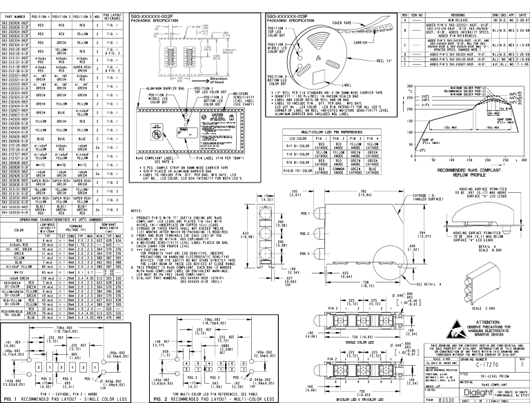 593-202020-002F 593-202020-013F 593-202024-002F 593-202024-013F 593-202324-002F 593-202324-013F 593-203120-002F 593-203120-013F 593-212121-002F 593-212121-013F 593-212130-002F 593-212130-013F 593-222221-002F 593-222221-013F 593-222222-002F 593-222222-013F 593-232323-002F 593-232323-013F 593-232424-002F 593-232424-013F 593-232627-002F 593-232627-013F 593-242320-002F 593-242320-013F 593-242424-002F 593-242424-013F 593-262626-002F 593-262626-013F 593-272129-002F 593-272129-013F 593-272727-002F 593-272727-013F 593-282828-002F 593-282828-013F 593-292929-002F 593-292929-013F 593-303030-002F 593-303030-013F 593-313131-002F 593-313131-013F 593-323232-002F 593-323232-013F 593-353535-002F 593-353535-013F POSITION 1 POSITION 2 POSITION 3 MSL PAD LAYOUT REFERENCE RED RED RED 2 FIG. 1 RED RED YELLOW 2 FIG. 1 RED GREEN YELLOW 2 FIG. 1 RED YELLOW/ GREEN RED 2 FIG. 1 & FIG. 2 AlGaAs RED AlGaAs RED AlGaAs RED 2 FIG. 1 AlGaAs RED AlGaAs RED SUPER-RED/ GREEN 2 FIG. 1 & FIG. 2 HI. INT. GREEN HI. INT. GREEN AlGaAs RED 2 FIG. 1 HI. INT. GREEN HI. INT. GREEN HI. INT. GREEN 2 FIG. 1 GREEN GREEN GREEN 2 FIG. 1 GREEN YELLOW YELLOW 2 FIG. 1 GREEN BLUE AllnGaP YELLOW 2 FIG. 1 YELLOW GREEN RED 2 FIG. 1 YELLOW YELLOW YELLOW 2 FIG. 1 593-XXXXXX-013F PACKAGING SPECIFICATION PACKAGING SPECIFICATION POSITION 3 BOTTOM LED COLOR DOT POSITION 2 MIDDLE LED COLOR DOT 2 BLUE FIG. 1 CAUTION AlGaAs RED InGaN GREEN AlInGaP YELLOW AlInGaP YELLOW AlInGaP YELLOW 2 WHITE WHITE WHITE 2 FIG. 1 InGaN GREEN InGaN GREEN InGaN GREEN 2a FIG. 1 SUPER-RED/ GREEN SUPER-RED/ GREEN SUPER-RED/ GREEN 2 FIG. 2 YELLOW/ GREEN YELLOW/ GREEN YELLOW/ GREEN 2 FIG. 2 SUPER-RED/ YELLOW SUPER-RED/ YELLOW SUPER-RED/ YELLOW 2 FIG. 2 BLUE/ GREEN/ RED BLUE/ GREEN/ RED BLUE/ GREEN/ RED 2a FIG. 2 2a FIG. 1 FIG. 1 OPERATING CHARACTERISTICS AT 25 $ C AMBIENT COLOR LUMINOUS INTENSITY @IF =20mA RED AlGaAs RED HI. INT. GREEN GREEN YELLOW BLUE AlInGaP YELLOW TYP 6 mcd 29 mcd 16 mcd 11 mcd 11 mcd 7 mcd 80 mcd TEST IF = IF = IF = IF = IF = IF = IF = WHITE 85 mcd IF = 10mA 3.1 3.7 InGaN GREEN RED RED/GREEN BI-COLOR GREEN YELLOW/GREEN YELLOW BI-COLOR GREEN RED RED/YELLOW BI-COLOR YELLOW RED RED/GRN/BLUE GREEN TRI-COLOR BLUE 150 mcd 7 mcd 10 mcd 6 mcd 10 mcd 45 mcd 70 mcd 35 mcd 70 mcd 20 mcd IF IF IF IF IF IF IF IF IF IF 3.4 2.0 2.0 2.0 2.0 2.0 2.0 1.9 3.4 3.4 4.05 2.5 2.5 2.5 2.5 2.3 2.4 2.4 4.05 4.05 DOMINANT WAVELENGTH (nm) FORWARD VOLTAGE (V) = = = = = = = = = = 20mA 10mA 10mA 10mA 10mA 20mA 20mA 20mA 20mA 20mA 1. Shelf life in sealed bag:24 months at <40 relative humidity (RH). MAX 2.5 2.5 2.5 2.5 2.5 4.2 2.4 MIN 622 564 564 580 462 580 TYP 628 645 570 570 587 465 587 MAX 634 576 576 595 468 595 X .33 Y .33 515 622 564 584 564 627 580 515 460 525 628 570 590 570 633 587 626 525 470 535 634 576 596 576 639 595 .149 #.002 [3,77 #0,05 ] * 5 PCS. SAMPLE STRIP ON 56MM WIDE CARRIER TAPE * STRIP PLACED IN ALUMINUM BARRIER BAG. * LABEL TO INCLUDE P/N, QTY. PER BAG, MFG DATE, LED LOT NO., LED COLOR, LED BIN INTENSITY FOR BOTH LED'S .143 #.002 [3,63 #0,05 ] 1 POS 3 .175 [4,45] 2 1 POS 2 .095 [2,41] 2 1 PIN .043 #.002 [1,09 #0,05 ] TYP PIN 1 = CATHODE; PIN 2 = ANODE FIG. 1 RECOMMENDED PAD LAYOUT - SINGLE COLOR LEDS 2 PIN 3 PIN KLJ N.O. MES 1-26-09 E ADDED P/N'S 593-203120-002F, -013F. KLJ F ADDED P/N'S 593-232627-002F, -013F. AJF KLJ R/Y BI-COLOR YELLOW CATHODE Y/G BI-COLOR YELLOW CATHODE YELLOW ANODE GREEN ANODE GREEN CATHODE R/G BI-COLOR RED CATHODE RED ANODE GREEN ANODE GREEN CATHODE R/G/B TRI-COLOR RED CATHODE COMMON ANODE GREEN CATHODE BLUE CATHODE .105 [2,67] NO MES 2-19-09 MAXIMUM SOLDER PROFILE RECOMMENDED SOLDER PROFILE MINIMUM SOLDER PROFILE 255 C $ 240 C $ NO 7-1-09 +0 C $ 260 C $-5 C$ 245 C $ #5 C$ +5 C $ C $ 235 C $-0 217 C $ 10s MIN 200 30s MAX RAMP DOWN 6 C $/s (MAX) 4 YELLOW ANODE NOTES: 100s MAX RAMP UP 3 C $/s (MAX) 50 25 C $ 0 100 50 0 150 250 t 200 s 300 RECOMMENDED RoHS COMPLIANT REFLOW PROFILE .785 [19,94] HOUSING SURFACE PERMITTED TO BE .007 [0,17] MAX ABOVE SURFACE "A" LED LEADS CATHODE I.D. (ANGLED SURFACE) POS 1 1. PRODUCT P/N'S WITH "F" SUFFIX ENDING ARE RoHS COMPLIANT. LED LEADS ARE PLATED TIN (Sn) WITH NICKEL (Ni) UNDERPLATE ON COPPER (Cu) LEADS. 2. STORAGE OF TAPED PARTS SHALL NOT EXCEED TWELVE [12] MONTHS AFTER WHICH RE-PACKAGING IS REQUIRED. 3. FRONT AND REAR TERMINALS [OF EACH LED] OF THE ASSEMBLY TO BE WITHIN .005 COPLANARITY. 4. A MOISTURE SENSITIVITY LEVEL LABEL PLACED ON BAG. CHECK CHART FOR PROPER LEVEL 5. *** CAUTION *** FOR PRODUCTS THAT ARE ESD SENSITIVE, OBSERVE PRECAUTIONS IN HANDLING ELECTROSTATIC SENSITIVE DEVICES. FOR EYE SAFETY DO NOT STARE DIRECTLY INTO THE LIGHT BEAM OF THESE LED DEVICES AT CLOSE RANGE. 6. THIS PRODUCT IS RoHS COMPLIANT. EACH BAG IS MARKED WITH RoHS COMPLIANT LABEL OR EQUIVALENT MARKINGS. LED MUST BE Pb FREE (RoHS COMPLIANT). 7. DIALIGHT PART NUMBERS: 593-XXXXXX-002F (STRIP) 593-XXXXXX-013F (REEL) .200 [5,08] .633 [16,08] .594 [15,07] POS 2 .200 [5,08] HOUSING SURFACE PERMITTED TO BE .004 [0,1] MAX BELOW SURFACE "A" LED LEADS .040 [1,02] DETAIL A SCALE 8.000 POS 3 .100 [2,54] .025 [0,64] .027 [0,69] TYP .738 [18,73] SEE DETAIL +.000 -.003 +0,00 1,02 -0,07 A .040 .225 [5,72] 2 1 .225 [5,72] 1 2 1 [ ] SCALE .738 #.002 [18,73 #0,05 ] .143 #.002 [3,63 #0,05 ] .160 [4,06] .100 #.002 [2,54 #0,05 ] .750 [19,05] PIN 2 .225 [5,72] 1 2 OBSERVE PRECAUTIONS FOR HANDLING ELECTROSTATIC SENSITIVE DEVICES .100 [2,54] SINGLE COLOR LED .0885 [2,248] REF +.000 -.003 +0,00 1,02 -0,07 .040 .225 [5,72] 2 1 [ ] THIS DRAWING AND THE CONTENTS HEREIN ARE CONFIDENTIAL AND THE SOLE PROPERTY OF DIALIGHT. REPRODUCTION OF THIS DRAWING OR CONSTRUCTION OF ANY PARTS WITHIN THIS DRAWING ARE FORBIDDEN WITHOUT THE WRITTEN CONSENT OF DIALIGHT. 1 SCALE: 4.000 4 3 4 3 4 3 ALL DIM'S IN: INCHES (MM) 2 1 2 1 2 1 TOLERANCES: UNLESS OTHERWISE SPECIFIED POS 3 POS 2 .177 [4,5] .043 [1,09] 2.000 ATTENTION: .225 REF [5,72] .059 [1,5] 1 POS 1 PIN RED ANODE .170 [4,32] .149 REF [3,77] .100 #.002 [2,54 #0,05 ] ADDED P/N'S 593-202324-002F, -013F. 100 RED CATHODE P/N