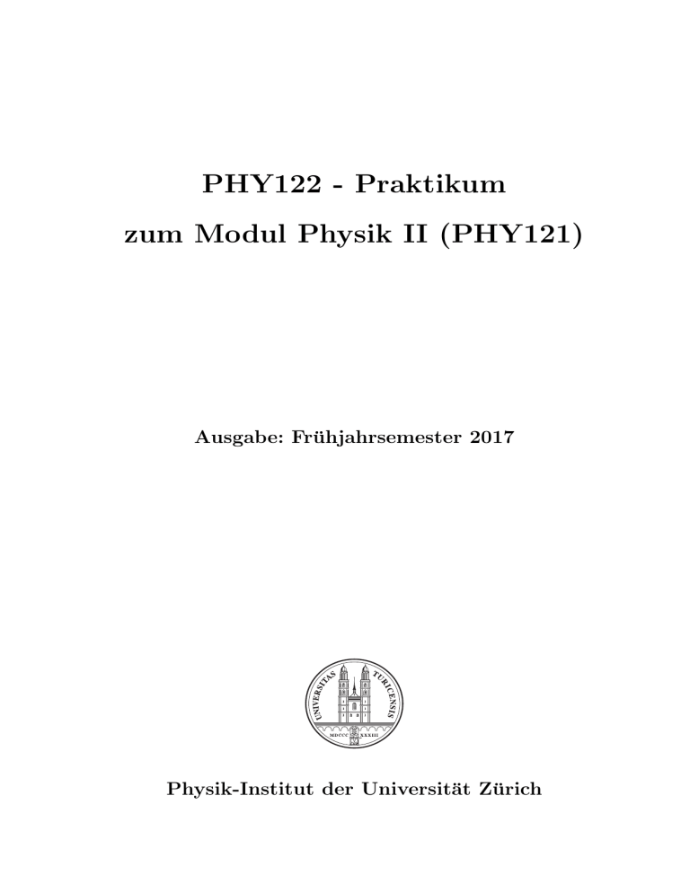 PHY122 - Praktikum zum Modul Physik II (PHY121) Ausgabe: Frühjahrsemester 2017 Physik-Institut der Universität Zürich ii PHY122 - Praktikum zur Physik II - Frühjahrsemester 2017 Inhaltsverzeichnis I II Einführung 1 Versuchsanleitungen 7 1. Verhältnis der spezifischen Wärmen (CD) 9 2. Optische Abbildung durch Linsen (DL) 23 3. Spezifische Ladung des Elektrons (e/m) 31 4. Messung eines Magnetfeldes (H) 41 5. Kennlinien elektrischer Leiter (KL) 53 6. Michelson-Interferometer (M) 59 7. Mikrowellen (MW) 67 8. Wellenlängenmessung mit einem Gitterspektrometer (Spm) 75 9. Wellenlängenmessung mit dem Prismenspektroskop (Spk) 81 10. Verdampfungs- und Schmelzwärme von Wasser (VS) 91 11. Wechselstromeigenschaften von LCR-Stromkreisen (WS) 99 III Testatzettel Frühjahrsemester 109 iii iv INHALTSVERZEICHNIS PHY122 - Praktikum zur Physik II - Frühjahrsemester 2017 Teil I Einführung 1 Einführung Das Physik-Praktikum ist ein wesentlicher Teil Ihrer Ausbildung zum Naturwissenschaftler. Es soll Ihnen Erfahrungen vermitteln im Umgang mit klassischen und modernen Messeinrichtungen, im Planen und effizienten Durchführen von Experimenten und im Verfassen von prägnanten zusammenfassenden Berichten. Ein wichtiges Ziel des Praktikums ist es, Sie mit der Behandlung von Messfehlern und der Fehlerrechnung vertraut zu machen. Jede Messung ist fehlerbehaftet, und die Angabe eines Messresultats ohne die gleichzeitige Angabe der Messgenauigkeit ist vollkommen sinnlos. Zufällige Fehler, wie sie z.B. durch statistische Schwankungen einer Zählrate enstehen, können im allgemeinen recht zuverlässig abgeschätzt werden, indem man eine Messung unter identischen Bedingungen mehrmals wiederholt und die erzielten Ergebnisse miteinander vergleicht. Systematische Fehler enstehen durch eine unvollständige Kenntnis des Messaufbaus oder durch schlecht geeichte Messinstrumente (z.B. eine zu schnell laufende Uhr). Sie sind im allgemeinen deutlich schwieriger zu erkennen und abzuschätzen. Es benötigt viel experimentelle Erfahrung, um allfällige systematische Fehlerquellen zu identifizieren, sie wenn möglich zu eliminieren, und falls dies nicht möglich sein sollte, ihren Einfluss auf die Messgenauigkeit zu bestimmen. Es sei an dieser Stelle auch auf den entsprechenden Anhang in der Praktikumsanleitung zum Herbstsemester verwiesen. Vorbereitung und Durchführung der Experimente Machen Sie sich vor dem Versuchsnachmittag anhand der Praktikumsanleitung mit dem theoretischen Hintergrund und dem Ziel des Versuches sowie mit den wesentlichen Schritten des Versuchsablaufs vertraut. Eine gründliche Vorbereitung an Hand dieser Praktikumsanleitung hilft Ihnen, die oft knapp bemessene Zeit zur Durchführung der Versuche optimal zu nutzen. Die Vorlesungsskripte stellen dabei eine wertvolle Ergänzung dar, vor allem wenn der zum Versuch gehörende Stoff in der Vorlesung noch nicht behandelt wurde. Dies lässt sich leider nicht vermeiden, da nicht alle Versuche für alle Studierenden gleichzeitig aufgebaut werden können. Notieren Sie allfällige Unklarheiten und diskutieren Sie diese mit dem Praktikumsassistenten. Spezielle Physikbücher sind zur Vorbereitung nicht erforderlich. Ein während der Messung sauber geführtes Messprotokoll hilft Ihnen später beim Abfassen des Berichtes genau zu rekonstruieren, was Sie unter welchen Bedingungen gemessen haben. Eine provisorische Auswertung und die Erstellung entsprechender Grafiken unmittelbar nach dem Versuch gibt Ihnen die Möglichkeit, eventuell bei der Auswertung auftretende Fragen mit dem Assisten3 4 ten zu diskutieren sowie allfällige grobe Fehler zu erkennen und noch am Versuchsnachmittag zu korrigieren. Verfassen der Berichte Das Erstellen eines guten Versuchsberichts ist ein wesentlicher Teil der wissenschaftlichen Ausbildung! Der Bericht soll so kurz wie möglich und so ausführlich wie nötig abgefasst werden. Gestalten Sie den Bericht so, dass Sie selbst auch nach einem Jahr noch auf den ersten Blick erkennen können, worum es sich bei dem Versuch gehandelt hat und welches die wesentlichen Resultate waren. Sie werden dabei im Laufe des Praktikums eine gewisse Routine entwickeln, die es Ihnen schliesslich erlauben sollte, einen Bericht in etwa drei bis vier Stunden zu erstellen. Modulbedingungen Das Praktikum gilt als erfolgreich absolviert, wenn Sie am Ende des Semesters acht testierte Versuche vorweisen können, die Versuchsberichte vollständig und fristgerecht eingereicht haben und die Gesamtnote mindestens genügend ist. Letztere wird aus den gemittelten Bewertungen der acht Versuchsberichte bestimmt. Beachten Sie dass es bei den Versuchberichten keine Möglichkeit zur nachträglichen Korrektur geben wird! Die Berichte werden so bewertet wie Sie sie abgeben. Weiter fliesst in die Bewertung mit ein, wie Sie sich auf den Versuch vorbereiten, ihn durchführen und das Messprotokol führen. Einige Regeln zum Praktikumsbetrieb Die Versuche werden normalerweise in Zweiergruppen durchgeführt. Die Reihenfolge der Versuche wird am Anfang des Semesters festgelegt und ein entsprechender Plan am Anschlagbrett in Bau 11-G ausgehängt. Bereiten Sie die Versuche vor, in dem Sie sich mit dem physikalischen Thema und der Methode des Versuches vertraut machen. Für die Beantwortung allfälliger Fragen steht Ihnen der Assistierende zur Verfügung. Das Messprotokoll mit den Namen der beteiligten Studierenden, Datum, den Messwerten, den am Versuchsplatz angegebenen Grössen, Skizzen, Bemerkungen, Fehlerabschätzungen und der provisorischen Auswertung wird nach Abschluss des Experimentes vom betreuenden Assistenten kontrolliert und gegengezeichnet, damit allfällige grobe Fehler sogleich festgestellt und korrigiert werden können. Behandeln Sie die Messgeräte sorgfältig und vergessen Sie nach Abschluss des Experimentes nicht, den Versuchsplatz wieder aufzuräumen! Verursachen Sie grob fahrlässig einen Schaden, können Sie verpflichtet werden, einen Beitrag an den Reparaturkosten zu 