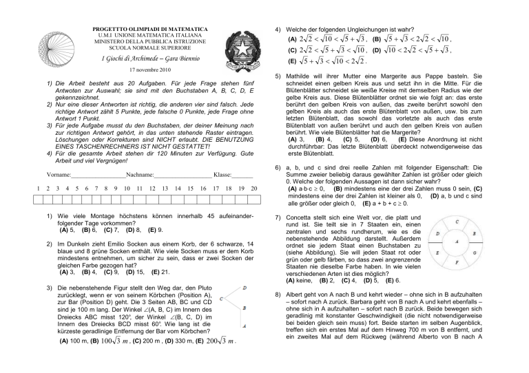 4) Welche der folgenden Ungleichungen ist wahr? PROGETTTO OLIMPIADI DI MATEMATICA U.M.I UNIONE MATEMATICA ITALIANA MINISTERO DELLA PUBBLICA ISTRUZIONE SCUOLA NORMALE SUPERIORE 2 2 < 10 < 5 + 3 , (B) 5 + 3 < 2 2 < 10 , (C) 2 2 < 5 + 3 < 10 , (D) 10 < 2 2 < 5 + 3 , (E) 5 + 3 < 10 < 2 2 . (A) I Giochi di Archimede – Gara Biennio 17 novembre 2010 1) Die Arbeit besteht aus 20 Aufgaben. Für jede Frage stehen fünf Antwoten zur Auswahl; sie sind mit den Buchstaben A, B, C, D, E gekennzeichnet. 2) Nur eine dieser Antworten ist richtig, die anderen vier sind falsch. Jede richtige Antwort zählt 5 Punkte, jede falsche 0 Punkte, jede Frage ohne Antwort 1 Punkt. 3) Für jede Aufgabe musst du den Buchstaben, der deiner Meinung nach zur richtigen Antwort gehört, in das unten stehende Raster eintragen. Löschungen oder Korrekturen sind NICHT erlaubt. DIE BENUTZUNG EINES TASCHENRECHNERS IST NICHT GESTATTET! 4) Für die gesamte Arbeit stehen dir 120 Minuten zur Verfügung. Gute Arbeit und viel Vergnügen! Vorname:__________________Nachname:___________________ Klasse:_______ 1 2 3 4 5 6 7 8 9 10 11 12 13 14 15 16 17 18 19 20 1) Wie viele Montage höchstens können innerhalb 45 aufeinanderfolgender Tage vorkommen? (A) 5, (B) 6, (C) 7, (D) 8, (E) 9. 2) Im Dunkeln zieht Emilio Socken aus einem Korb, der 6 schwarze, 14 blaue und 8 grüne Socken enthält. Wie viele Socken muss er dem Korb mindestens entnehmen, um sicher zu sein, dass er zwei Socken der gleichen Farbe gezogen hat? (A) 3, (B) 4, (C) 9, (D) 15, (E) 21. 3) Die nebenstehende Figur stellt den Weg dar, den Pluto zurücklegt, wenn er von seinem Körbchen (Position A), zur Bar (Position D) geht. Die 3 Seiten AB, BC und CD sind je 100 m lang. Der Winkel ∠(A, B, C) im Innern des Dreiecks ABC misst 120°, der Winkel ∠(B, C, D) im Innern des Dreiecks BCD misst 60°. Wie lang ist die kürzeste geradlinige Entfernung der Bar vom Körbchen? (A) 100 m, (B) 100 3 m , (C) 200 m , (D) 330 m, (E) 200 3 m . 5) Mathilde will ihrer Mutter eine Margerite aus Pappe basteln. Sie schneidet einen gelben Kreis aus und setzt ihn in die Mitte. Für die Blütenblätter schneidet sie weiße Kreise mit demselben Radius wie der gelbe Kreis aus. Diese Blütenblätter ordnet sie wie folgt an: das erste berührt den gelben Kreis von außen, das zweite berührt sowohl den gelben Kreis als auch das erste Blütenblatt von außen, usw. bis zum letzten Blütenblatt, das sowohl das vorletzte als auch das erste Blütenblatt von außen berührt und auch den gelben Kreis von außen berührt. Wie viele Blütenblätter hat die Margerite? (A) 3, (B) 4, (C) 5, (D) 6, (E) Diese Anordnung ist nicht durchführbar: Das letzte Blütenblatt überdeckt notwendigerweise das erste Blütenblatt. 6) a, b, und c sind drei reelle Zahlen mit folgender Eigenschaft: Die Summe zweier beliebig daraus gewählter Zahlen ist größer oder gleich 0. Welche der folgenden Aussagen ist dann sicher wahr? (A) a⋅b⋅c ≥ 0, (B) mindestens eine der drei Zahlen muss 0 sein, (C) mindestens eine der drei Zahlen ist kleiner als 0, (D) a, b und c sind alle größer oder gleich 0, (E) a + b + c ≥ 0. 7) Concetta stellt sich eine Welt vor, die platt und rund ist. Sie teilt sie in 7 Staaten ein, einen zentralen und sechs rundherum, wie es die nebenstehende Abbildung darstellt. Außerdem ordnet sie jedem Staat einen Buchstaben zu (siehe Abbildung). Sie will jeden Staat rot oder grün oder gelb färben, so dass zwei angrenzende Staaten nie dieselbe Farbe haben. In wie vielen verschiedenen Arten ist dies möglich? (A) keine, (B) 2, (C) 4, (D) 5, (E) 6. 8) Albert geht von A nach B und kehrt wieder – ohne sich in B aufzuhalten – sofort nach A zurück. Barbara geht von B nach A und kehrt ebenfalls – ohne sich in A aufzuhalten – sofort nach B zurück. Beide bewegen sich geradlinig mit konstanter Geschwindigkeit (die nicht notwendigerweise bei beiden gleich sein muss) fort. Beide starten im selben Augenblick, treffen sich ein erstes Mal auf dem Hinweg 700 m von B entfernt, und ein zweites Mal auf dem Rückweg (während Alberto von B nach A spaziert und Barbara von A nach B) 400 m von A entfernt. Wie weit ist A von B entfernt? (A) 900 m, (B) 1100 m, (C) 1700 m, (D) 2000 m, (E) das kann man nicht ermitteln. 9) Luca schreibt alle geraden aufeinander folgenden Zahlen zwischen 2 und 2010 (beide inbegriffen) an die Tafel. Dann löscht Giovanni alle Vielfachen von 3. Wie viele Zahlen bleiben übrig? (A) 670, (B) 710, (C) 840, (D) 905, (E) 1005. 10) Silvano ist der reichste Mann auf dem Planeten Neptun. Er besitzt eine Autobahn mit vielen Fahrspuren. In einem Moment des wirtschaftlichen Aufschwungs beschließt er, die Anzahl der Fahrspuren um 60 % zu erhöhen. Nach einem alten Gesetz, das auf Neptun Gültigkeit hat, muss er anschließend die Anzahl der Fahrspuren um einen Prozentsatz X verringern. Nachdem er dies durchgeführt hat, hat er gleich viele Fahrspuren wie vorher. Wie groß ist X? (A) 15%, (B) 21,5%, (C) 28%, (D) 37,5%, (E) 60%. 11) In einem Dreieck messen zwei Winkel 30° und 105 °, die dazwischen liegende Seite misst 2 cm. Welchen Umfang hat das Dreieck? (5 + 3 ) cm (D) (5 + 2 ) cm , (A) (2 + 2 3 + 2 ) cm , (E) (2 + 3 3 ) cm . (B) (C) (3 + ) 3 + 2 cm , 12) Wie groß ist die Summe der Zahlen 1 + 2 + 2 + 3 + 3 + 4 + 4 + …. + 35 + 35 + 36? (A) 990, (B) 1105, (C) 1295, (D) 1395, (E) 1505. 13) Schreibt man alle natürlichen Zahlen von 1 bis 2010 (beide inbegriffen), eine an die andere angehängt, so bilden sie eine neue natürliche Zahl. Wie viele Stellen hat diese Zahl? (A) 2010, (B) 3540, (C) 5225, (D) 6933, (E) 7253. 14) Die Punkte ABCDEF bilden ein regelmäßiges Sechseck mit der Seite 1 cm. Sei G der Schnittpunkt der Diagonalen AC und BE. Welche Fläche hat das Dreieck ABG? 3 −1 3 9 cm², (B) cm², (C) cm², 2 8 40 1+ 3 3 cm², (E) cm². (D) 12 4 (A) 15) Aus wie vielen Ziffern besteht der Quotient (112233445566778899)/11? (A) 9, (B) 13, (C) 17, (D) 19, (E) 23. 16) Wie viele vierstellige natürliche Zahlen gibt