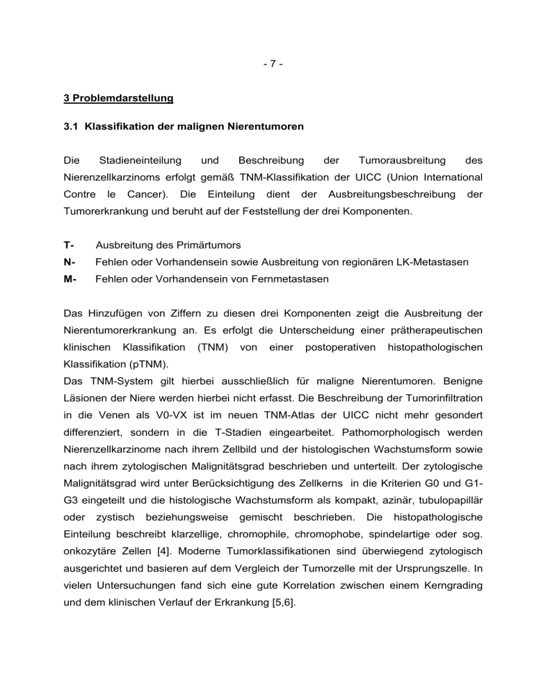 -7- 3 Problemdarstellung 3.1 Klassifikation der malignen Nierentumoren Die Stadieneinteilung und Beschreibung der Tumorausbreitung des Nierenzellkarzinoms erfolgt gemäß TNM-Klassifikation der UICC (Union International Contre le Cancer). Die Einteilung dient der Ausbreitungsbeschreibung der Tumorerkrankung und beruht auf der Feststellung der drei Komponenten. T- Ausbreitung des Primärtumors N- Fehlen oder Vorhandensein sowie Ausbreitung von regionären LK-Metastasen M- Fehlen oder Vorhandensein von Fernmetastasen Das Hinzufügen von Ziffern zu diesen drei Komponenten zeigt die Ausbreitung der Nierentumorerkrankung an. Es erfolgt die Unterscheidung einer prätherapeutischen klinischen Klassifikation (TNM) von einer postoperativen histopathologischen Klassifikation (pTNM). Das TNM-System gilt hierbei ausschließlich für maligne Nierentumoren. Benigne Läsionen der Niere werden hierbei nicht erfasst. Die Beschreibung der Tumorinfiltration in die Venen als V0-VX ist im neuen TNM-Atlas der UICC nicht mehr gesondert differenziert, sondern in die T-Stadien eingearbeitet. Pathomorphologisch werden Nierenzellkarzinome nach ihrem Zellbild und der histologischen Wachstumsform sowie nach ihrem zytologischen Malignitätsgrad beschrieben und unterteilt. Der zytologische Malignitätsgrad wird unter Berücksichtigung des Zellkerns in die Kriterien G0 und G1G3 eingeteilt und die histologische Wachstumsform als kompakt, azinär, tubulopapillär oder zystisch beziehungsweise gemischt beschrieben. Die histopathologische Einteilung beschreibt klarzellige, chromophile, chromophobe, spindelartige oder sog. onkozytäre Zellen [4]. Moderne Tumorklassifikationen sind überwiegend zytologisch ausgerichtet und basieren auf dem Vergleich der Tumorzelle mit der Ursprungszelle. In vielen Untersuchungen fand sich eine gute Korrelation zwischen einem Kerngrading und dem klinischen Verlauf der Erkrankung [5,6]. -8- Für diese retrospektive Untersuchung kommt die TNM – Klassifikation in der 5. Auflage von 1997 zur Anwendung. T: Primärtumor T0: kein Anhalt für Primärtumor T1: Tumor <7 cm im Durchmesser auf die Niere begrenzt T2: Tumor >7 cm im Durchmesser auf die Niere begrenzt T3: Tumor breitet sich in größeren Venen aus oder infiltriert Nebenniere oder perirenales Fettgewebe, jedoch nicht jenseits der Gerotafaszie. T3a: Tumor infiltriert perirenales Gewebe oder Nebenniere, aber nicht jenseits der Gerotafaszie. T3b: Tumor mit makroskopischer Ausbreitung in Nierenvene(n) oder V .cava inferior unterhalb des Zwerchfells. T3c: Tumor mit makroskopischer Ausbreitung in die V. cava oberhalb des Zwerchfells. T4: Tumor jeder Größe infiltriert über Gerotafaszie hinaus. TX: Primärtumor kann nicht beurteilt werden. N: Regionäre Lymphknoten N0: keine regionären Lymphknotenmetastasen N1: Metastase in solitärem Lymphknoten N2: Metastasen in multiplen Lymphknoten NX: Regionäre Lymphknoten können nicht beurteilt werden. M: Fernmetastasierung M0: keine Fernmetastasen M1: Fernmetastasierung nachgewiesen MX: Das Vorliegen von Fernmetastasen kann nicht beurteilt werden. -9- G: Histologisches Grading G I: hoch differenziert G II: mäßig differenziert G III: gering differenziert G IV: undifferenziert Tabelle 1 / TNM-Klassifikation (5.Auflage 1997) [7], eingearbeitet Kriterien der WHO/UICC/AJCC Workgroup 3.2 Das metastasierte Nierenzellkarzinom 3.2.1 Allgemeines Lokal begrenzte und nichtmetastasierte Nierenzellkarzinome haben eine exzellente Prognose mit 5-Jahres-Überlebensraten von über 90%. Zum Zeitpunkt der Diagnose weisen jedoch über 30% der Patienten bereits Lymphknoten- oder Organmetastasen auf. Bei ca. 25% der Betroffenen liegt bereits ein lokal fortgeschrittener Tumor mit Organüberschreitung vor [8]. Die stadienabhängige 5-Jahres-Überlebensrate beträgt hierbei 8 bis 51% [9]. Onkologische Behandlungsmodalitäten wie Chemotherapie, Bestrahlung oder Hormontherapie beeinflussen den Verlauf der fortgeschrittenen Erkrankung nur gering. Ein Therapieschema mit kurativer Zielsetzung existiert derzeit nicht, sofern keine komplette Resektabilität der Metastasen gegeben ist [10]. Therapeutische Maßnahmen bei fortgeschrittener Tumorerkrankung sind daher ausschließlich palliativer Natur und dienen der Prävention sowie der Behandlung krankheitsbedingter Komplikationen, wobei der Erhalt der Lebensqualität im Vordergrund steht. Mit der Etablierung der Immunmodulation ist das bisherige Spektrum der Palliation Aspekt beim fortgeschrittenen Nierenzellkarzinom erweitert worden. Der therapiebedingter Nebenwirkungen und einer damit verbundenen Beeinträchtigung der Lebensqualität ist für Patienten mit einer fortgeschrittenen Tumorerkrankung ein ausschlaggebendes Kriterium für Akzeptanz und Stellenwert der - 10 - palliativen Therapie. Die Nebenwirkungsdichte spielt hinsichtlich der Patientencompliance eine besondere Rolle, weil eine Vielzahl der Patienten vorerst keine bzw. nur geringe krankheitsassoziierte Symptome aufweist [11]. 3.2.2 Diagnostik und Nachsorge des metastasierten Nierenzellkarzinoms Die diagnostischen Schritte der Primäruntersuchung sind nachfolgend aufgelistet. Sie dienen der Feststellung des Tumorstadiums und der beidseitigen Nierenfunktion und sind somit Voraussetzung für eine optimale Therapieplanung. Bei bereits bestehender Metastasierung sind nur die Untersuchungen notwendig, welche zur Erfassung der Tumorausdehnung und der Diagnosesicherung dienen. Obligat: • Eingehende Anamnese und körperliche Untersuchung • Urinanalyse, Blut- und Serumuntersuchungen • Abdomensonografie mit Beurteilung der Leber • Computertomografie des Abdomens mit intravenöser Kontrastmittelgabe (alternativ MRT) • Röntgen-Thorax p.-a. und seitlich, bei suspektem Befund CT-Thorax Fakultativ: • CT-Thorax • Kernspintomografie (MRT) bei dem Veracht eines Cavazapfens • Knochenszintigrafie und Schädel-CT bei Symptomatik • Selektive renale Angiografie bei geplanter Teilresektion • Cavografie nur bei ausgedehntem Ca