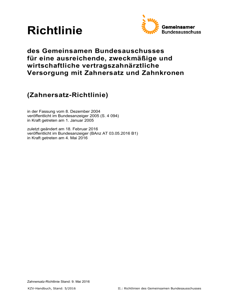 Richtlinie des Gemeinsamen Bundesauschusses für eine ausreichende, zweckmäßige und wirtschaftliche vertragszahnärztliche Versorgung mit Zahnersatz und Zahnkronen (Zahnersatz-Richtlinie) in der Fassung vom 8. Dezember 2004 veröffentlicht im Bundesanzeiger 2005 (S. 4 094) in Kraft getreten am 1. Januar 2005 zuletzt geändert am 18. Februar 2016 veröffentlicht im Bundesanzeiger (BAnz AT 03.05.2016 B1) in Kraft getreten am 4. Mai 2016 Zahnersatz-Richtlinie Stand: 9. Mai 2016 KZV-Handbuch, Stand: 5/2016 II.: Richtlinien des Gemeinsamen Bundesausschusses Inhalt A. Gegenstand und Zweckbestimmung ....................................................................... 3 B. Voraussetzungen für Leistungsansprüche der Versicherten im Rahmen der vertragszahnärztlichen Versorgung ........................................................................ 4 C. Voraussetzungen für Leistungsansprüche der Versicherten im Rahmen der vertragszahnärztlichen Versorgung ........................................................................ 5 D. Anforderungen an einzelne Behandlungsbereiche ................................................ 7 I. Versorgung mit Zahnkronen ................................................................................. 7 II. Versorgung mit Brücken ....................................................................................... 7 III. Versorgung mit herausnehmbarem Zahnersatz.................................................... 8 IV. Kombinationsversorgung ...................................................................................... 8 V. Versorgung mit Suprakonstruktionen (implantatgestützter Zahnersatz) ................ 9 2 Zahnersatz-Richtlinie Stand: 9. Mai 2016 KZV-Handbuch, Stand: 5/2016 II.: Richtlinien des Gemeinsamen Bundesausschusses A. Gegenstand und Zweckbestimmung 1. Diese Richtlinien regeln gemäß § 92 in Verbindung mit §§ 73 Abs. 2 Nr. 2a, 56 Abs. 2 SGB V die Regelversorgung mit Zahnersatz, Zahnkronen und Suprakonstruktionen durch die an der vertragszahnärztlichen Versorgung teilnehmenden Zahnärzte (Vertragszahnärzte) mit dem Ziel einer bedarfsgerechten und wirtschaftlichen Versorgung der Versicherten. Soweit in den nachfolgenden Richtlinien Aussagen zum Zahnersatz getroffen werden, gelten diese entsprechend für die Versorgung mit Zahnkronen und Suprakonstruktionen. Auch für zahntechnische Leistungen gilt das Gebot der Wirtschaftlichkeit. Die Abrechenbarkeit der in diesen Richtlinien beschriebenen Maßnahmen regeln die Vertragspartner gem. § 87 SGB V. 2. 3. Nach diesen Richtlinien sollen a) die Krankenkassen über ihre Leistungen bei der Versorgung mit Zahnersatz entscheiden, b) die Zahnärzte bei der Versorgung mit Zahnersatz verfahren. Die Krankenkassen haben ihre Versicherten über Art und Umfang ihrer Leistungsansprüche bei der Versorgung mit Zahnersatz zu informieren. Die Kassenzahnärztliche Bundesvereinigung und die Spitzenverbände der Krankenkassen wirken auf eine einheitliche Anwendung dieser Richtlinien hin. 3 Zahnersatz-Richtlinie Stand: 9. Mai 2016 KZV-Handbuch, Stand: 5/2016 II.: Richtlinien des Gemeinsamen Bundesausschusses B. Voraussetzungen für Leistungsansprüche der Versicherten im Rahmen der vertragszahnärztlichen Versorgung 4. Versicherte haben Anspruch auf medizinisch notwendige Versorgung mit Zahnersatz einschließlich Zahnkronen und Suprakonstruktionen (zahnärztliche und zahntechnische Leistungen) in den Fällen, in denen eine zahnprothetische Versorgung notwendig ist. Qualität und Wirksamkeit der Leistungen haben dem allgemein anerkannten Stand der medizinischen Erkenntnisse zu entsprechen und den medizinischen Fortschritt zu berücksichtigen. Dies gilt auch für gleichartige und andersartige Versorgungen. 5. Wählen Versicherte einen über die Regelversorgung gemäß § 56 Abs. 2 SGB V hinausgehenden gleichartigen Zahnersatz, haben sie die Mehrkosten gegenüber den in § 56 Abs. 2 Satz 10 SGB V aufgelisteten Leistungen selbst zu tragen. Gleichartiger Zahnersatz liegt vor, wenn dieser die Regelleistung beinhaltet und zusätzliche Leistungen hinzukommen. Versicherte haben Anspruch auf Erstattung bewilligter Festzuschüsse nach § 55 Abs. 5 SGB V, wenn eine von der Regelversorgung abweichende, andersartige Versorgung durchgeführt wird. Eine andersartige Versorgung liegt vor, wenn eine andere Versorgungsform (Brücken, herausnehmbarer Zahnersatz, Kombinationsversorgung, Suprakonstruktionen) als die, welche in den Regelleistungen für den jeweiligen Befund beschrieben ist, gewählt wird. Eine tatsächlich geplante Versorgung gemäß § 87 Abs. 1a SGB V kann sowohl Regelversorgungsleistungen als auch Leistungen der gleich- und andersartigen Versorgung umfassen. 4 Zahnersatz-Richtlinie Stand: 9. Mai 2016 KZV-Handbuch, Stand: 5/2016 II.: Richtlinien des Gemeinsamen Bundesausschusses C. Voraussetzungen für Leistungsansprüche der Versicherten im Rahmen der vertragszahnärztlichen Versorgung 6. Ziel der Versorgung mit Zahnersatz ist es, eine ausreichende Funktionstüchtigkeit des Kauorgans wiederherzustellen oder ihre Beeinträchtigung zu verhindern. 7. Zahnersatz ist angezeigt, wenn ein Zahn oder mehrere Zähne fehlen oder zerstört sind und wenn dadurch die Funktionstüchtigkeit des Kauorgans beeinträchtigt ist oder beeinträchtigt zu werden droht, z. B. durch Zahnwanderung oder -kippung. Bei der Versorgung mit Zahnersatz soll eine funktionell ausreichende Gegenbezahnung vorhanden sein oder im Laufe der Behandlung hergestellt werden. Ein neuer Zahnersatz ist nicht angezeigt, wenn der vorhandene Zahnersatz noch funktionstüchtig ist oder die Funktionstüchtigkeit wiederhergestellt werden kann (z. B. durch Erweiterung). 8. Der Zahnarzt soll Art und Umfang des Zahnersatzes nach den anatomischen, physiologischen, pathologischen und hygienischen Gegebenheiten des Kauorgans bestimmen. Im Rahmen der vertragszahnärztlichen Versorgung bestimmt der Zahnarzt nach entsprechender Aufklärung und unter Wahrung des Sel